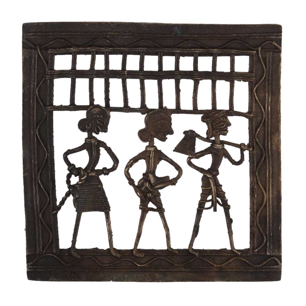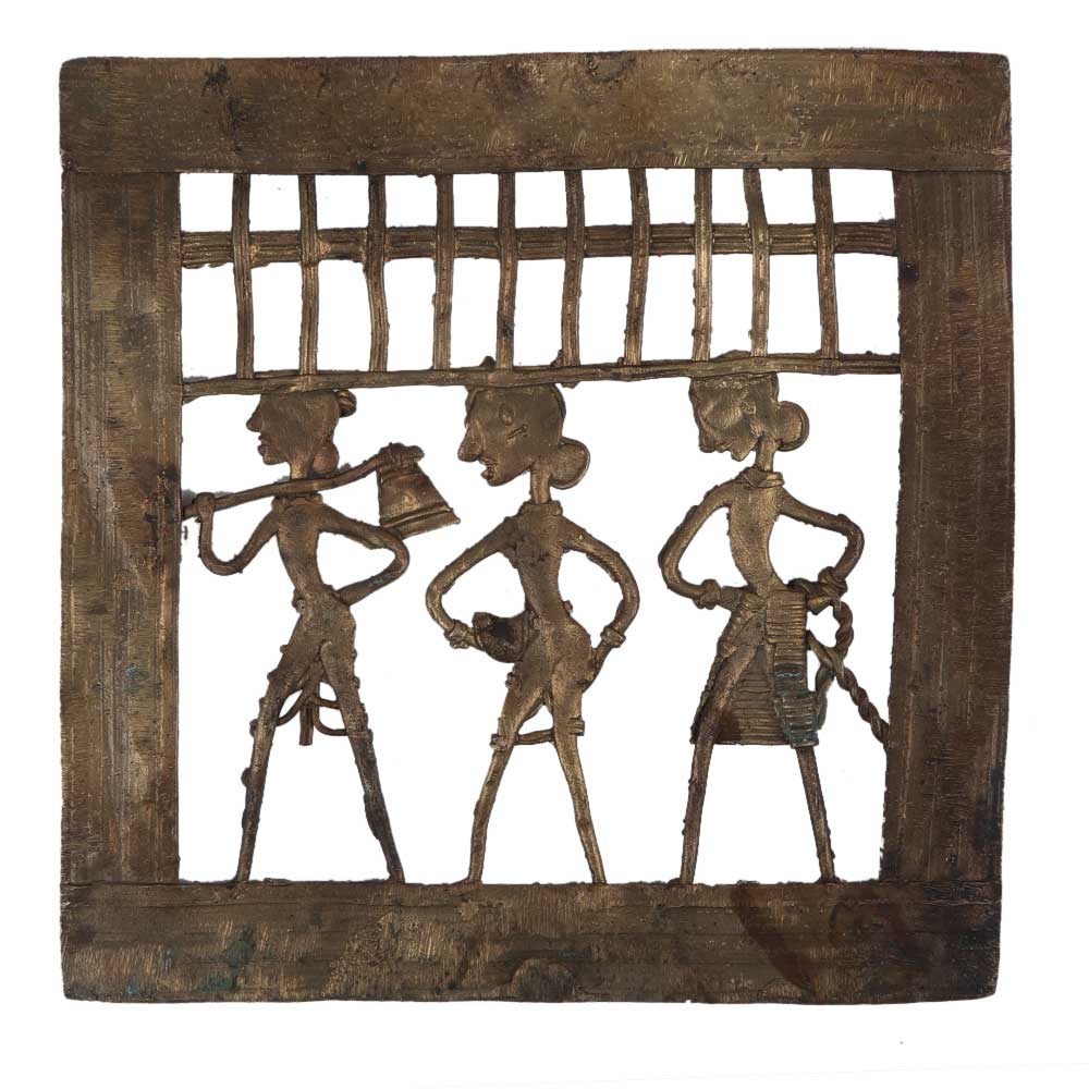 This decorative brass wall dhokra art hanging of a farmer with two ladies one holding a rope and the other holds a basket the farmer holds his axe and they are off to fields . These are daily routine of tribal couple of the dhokra tribe . Home decoration, office decoration, school decoration, gallery decoration . Gift it to your near and dear ones.