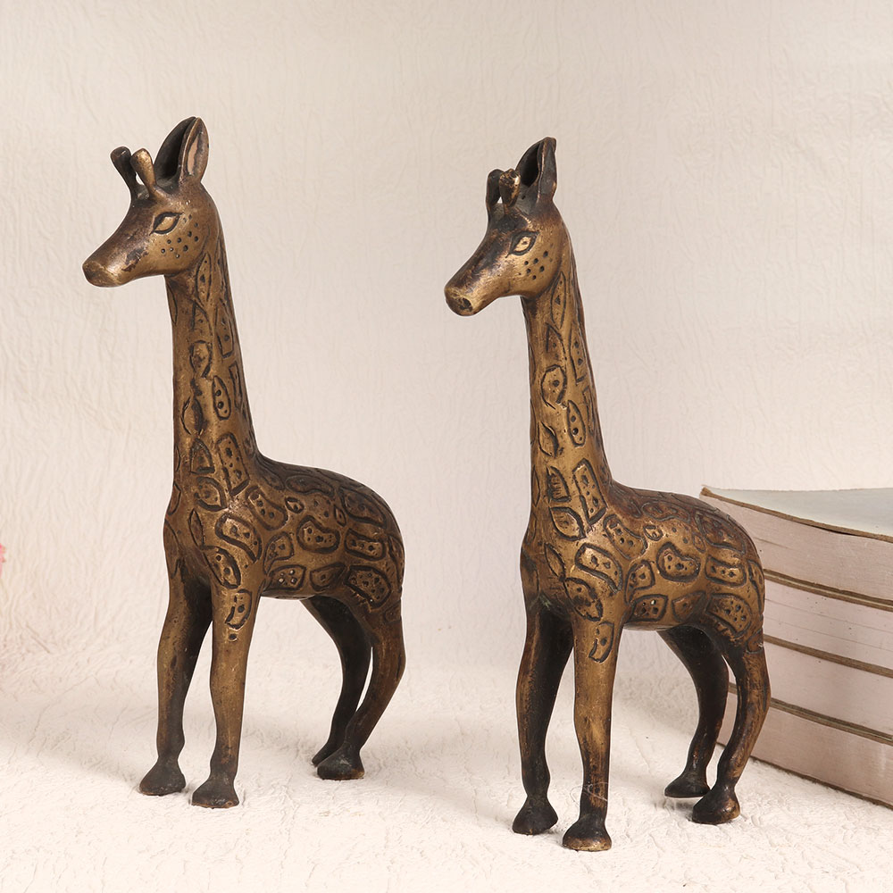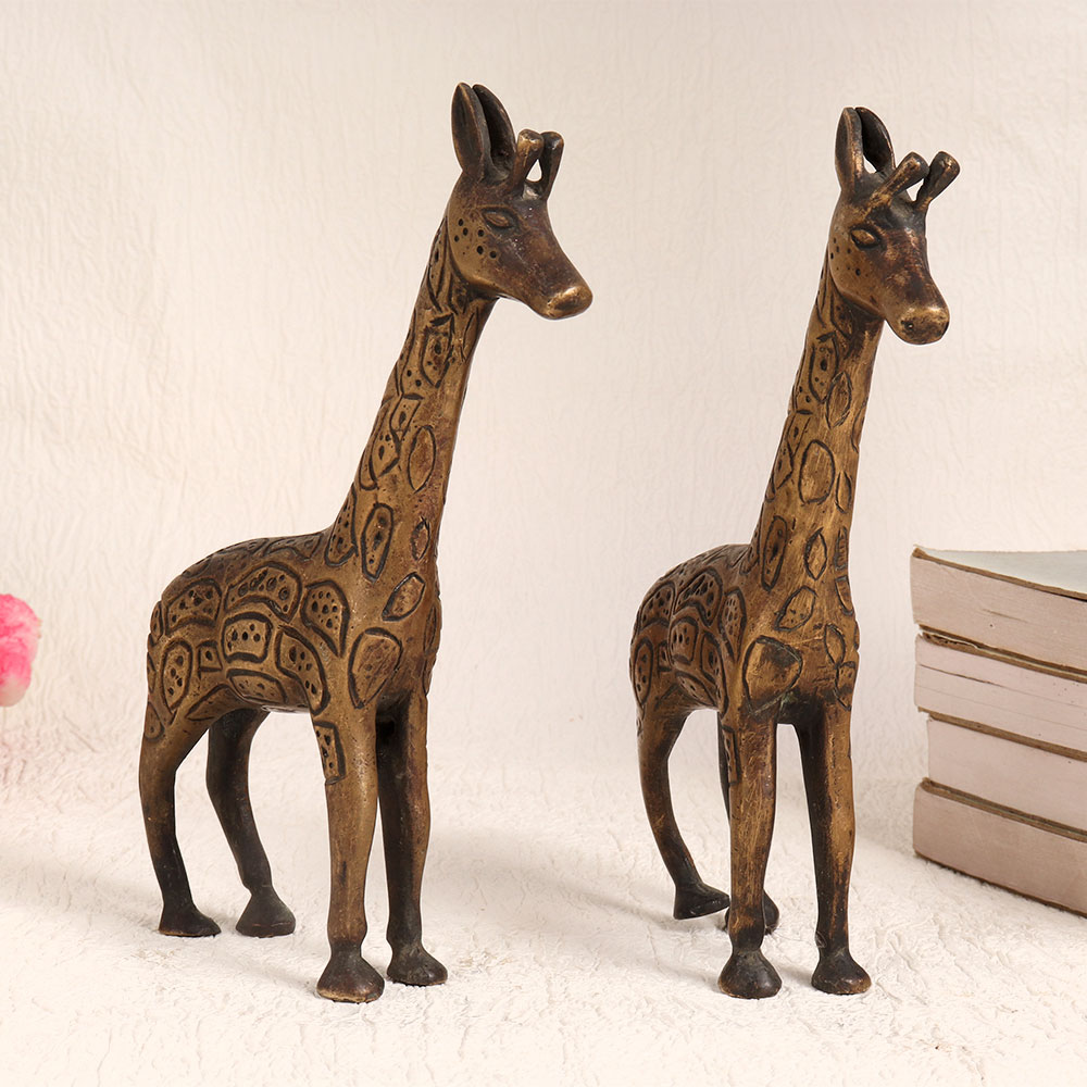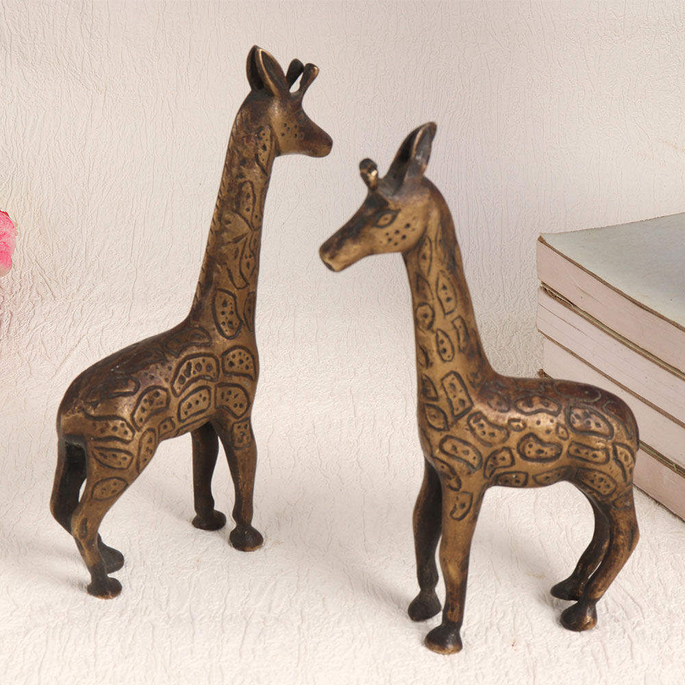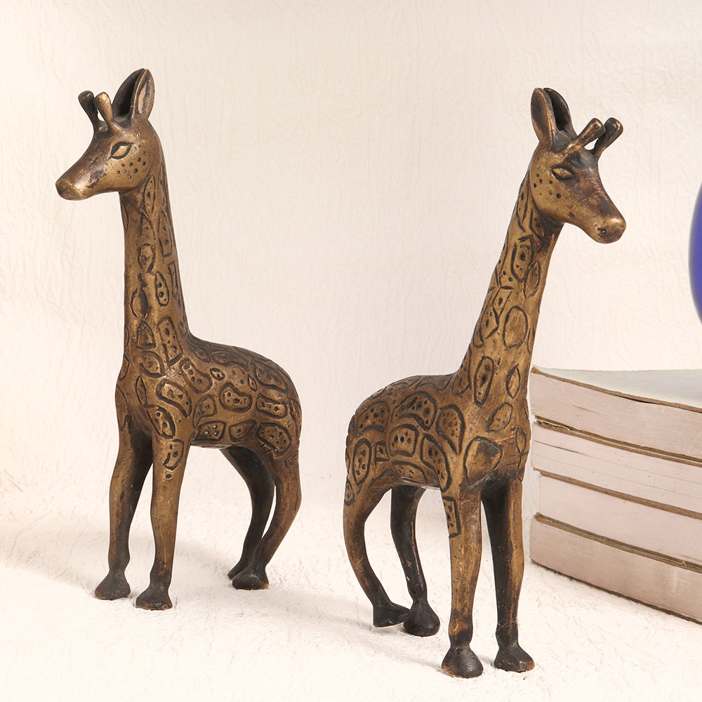 Buy a Brass Pair of Giraffes online which showcases a captivating antique brown finish that exudes timeless charm. Meticulously handcrafted by talented artisans in the tradition of English Art, these majestic giraffes are a testament to craftsmanship and attention to detail. Crafted from high-quality brass, these figurines are not just decorative pieces but also a symbol of elegance and sophistication. Their versatile design allows them to seamlessly blend into various settings, whether it's your home, office, restaurant, hotel, cafe, or shop. They add a touch of regal splendour wherever they are placed. These stunning giraffes are more than just décor, they are a conversation starter and a piece of art. They are perfect additions to your vintage collection or can be proudly displayed at exhibitions to showcase their artistic value. Furthermore, these Brass Giraffes make for exceptional gifts, ideal for special, festive, or auspicious occasions. Share the beauty and craftsmanship of these giraffes with your loved ones, leaving a lasting impression and a sense of timeless elegance.