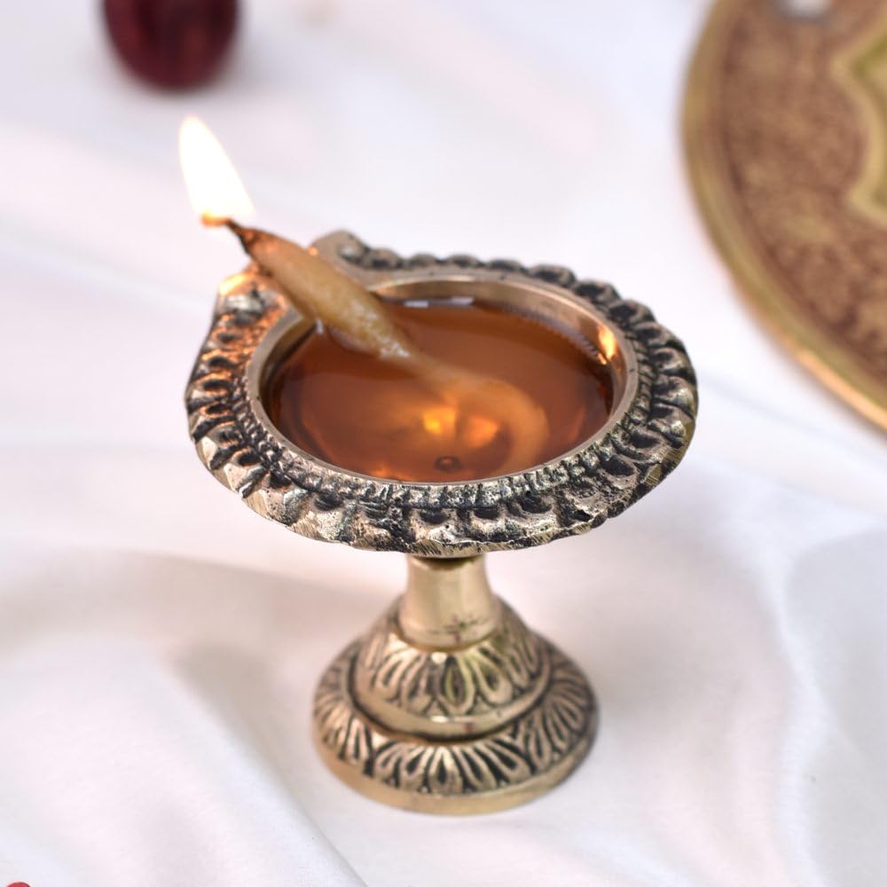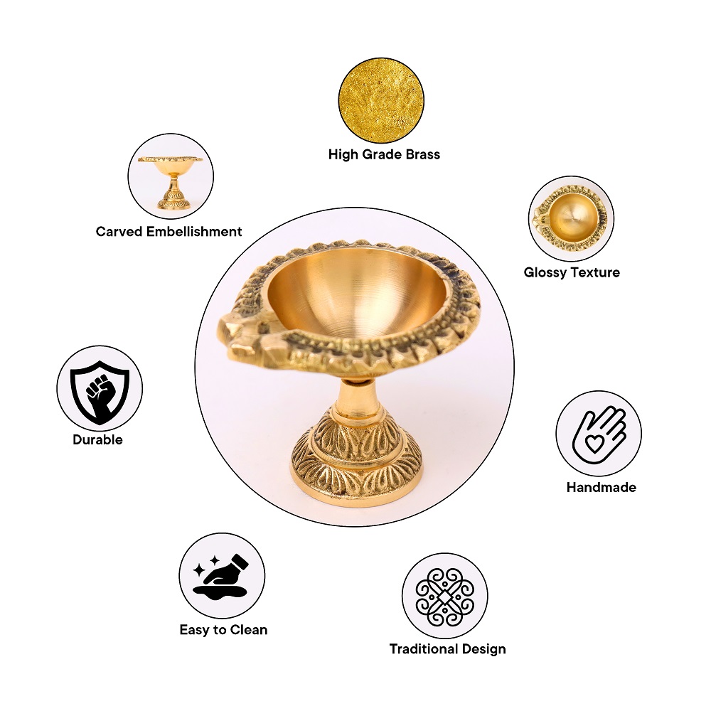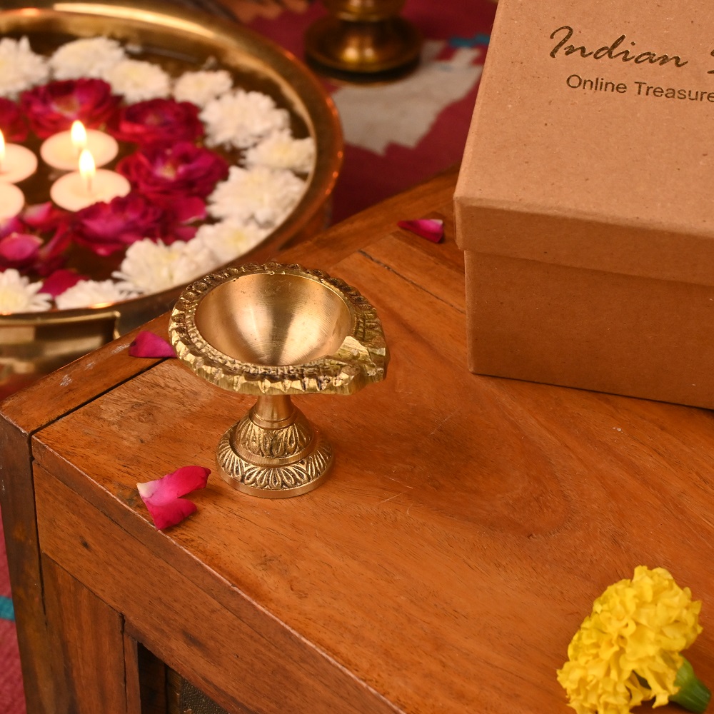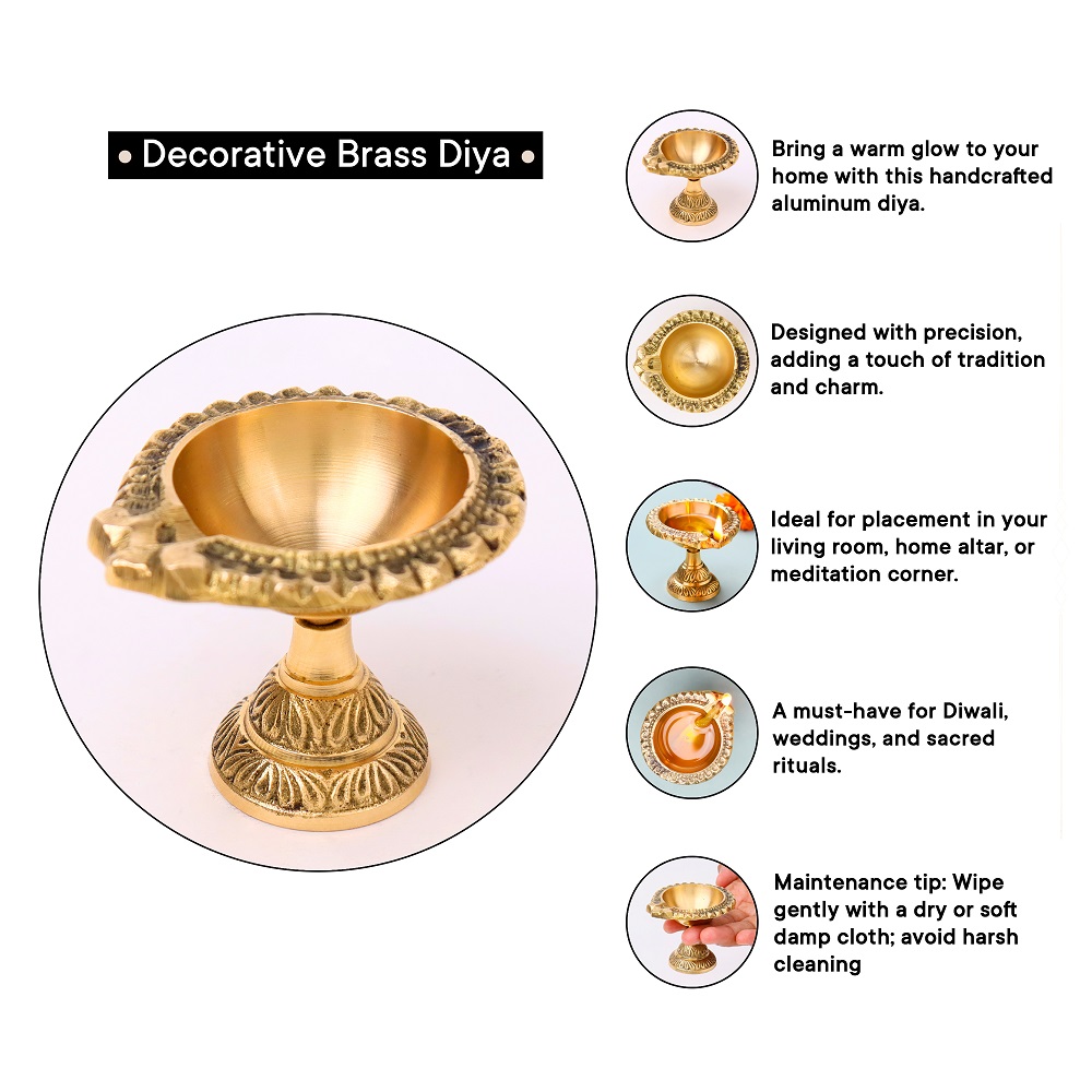 Bring divine radiance into your home with this decorative golden brass diya, meticulously handcrafted by skilled Indian artisans. With its luminous finish and elegant form, this diya embodies both functionality and cultural symbolism, perfect for enhancing festive rituals or everyday worship. The warm golden sheen reflects prosperity, while its compact size makes it a versatile accent for puja rooms, living spaces, or gifting. A true blend of artistry and devotion, this diya is designed to enrich your décor with light and serenity.