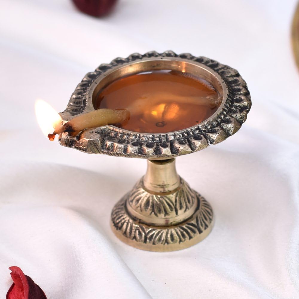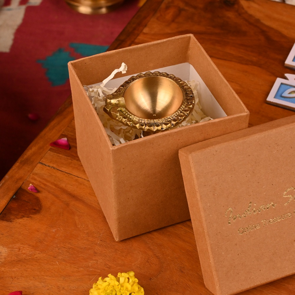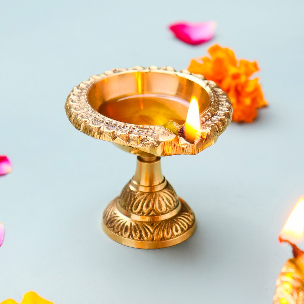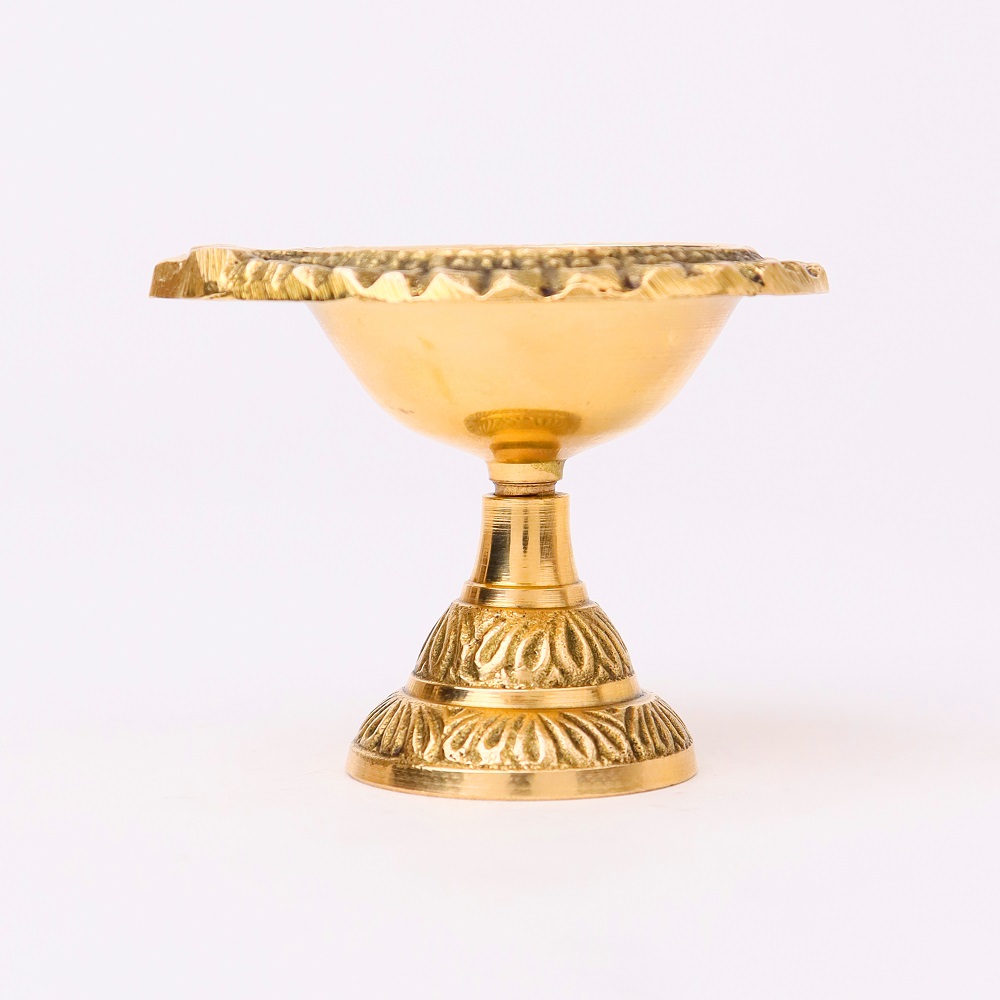 Bring divine radiance into your home with this decorative golden brass diya, meticulously handcrafted by skilled Indian artisans. With its luminous finish and elegant form, this diya embodies both functionality and cultural symbolism, perfect for enhancing festive rituals or everyday worship. The warm golden sheen reflects prosperity, while its compact size makes it a versatile accent for puja rooms, living spaces, or gifting. A true blend of artistry and devotion, this diya is designed to enrich your décor with light and serenity.