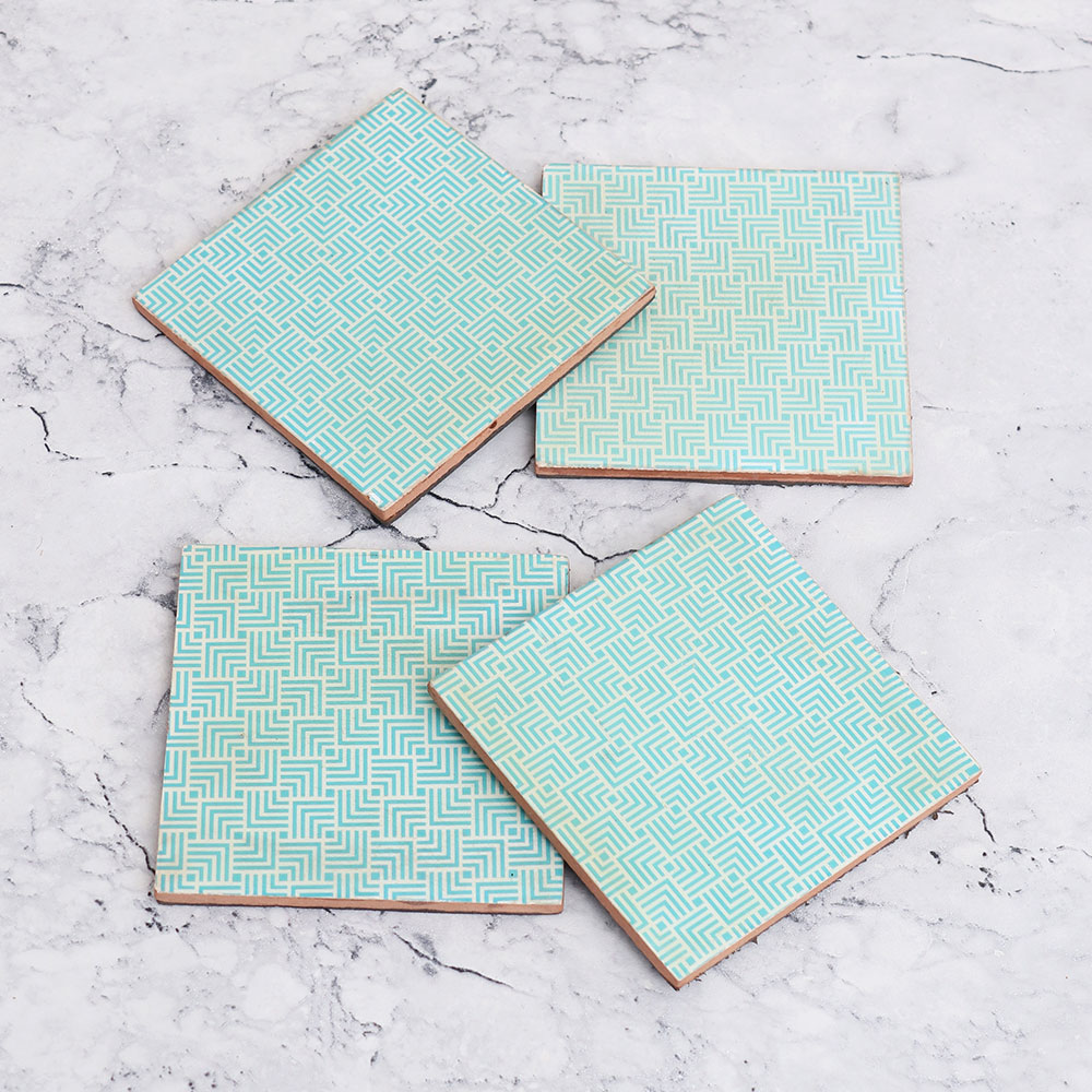 This Ultimate Wooden Tea Coaster Set is a masterpiece crafted with precision and artistry by highly talented Indian artisans. This Pack of four square-shaped coasters is meticulously handmade from high-quality wood, ensuring durability and elegance. The coasters showcase a captivating design, featuring a mesmerizing pattern in a harmonious blend of white and sky blue colours, making them a delightful decorative addition to any home or office. Not only are these coasters aesthetically pleasing, but they also serve a practical purpose. Designed to hold water, tea, juice, or coffee glasses, they offer protection against unsightly stains on surfaces. Versatile and versatile, they are suitable for use in various settings, such as homes, offices, restaurants, hotels, or cafes. These wooden tea coasters are the epitome of excellence, and their exceptional craftsmanship ensures they are the best wooden coaster option available. They make for an exquisite gift for your loved fours on special or festive occasions, adding a touch of elegance to their living spaces.