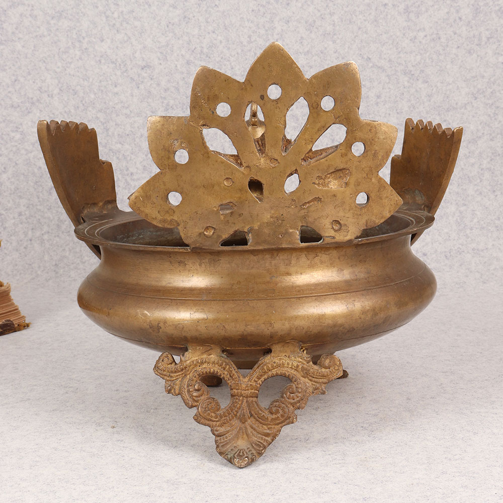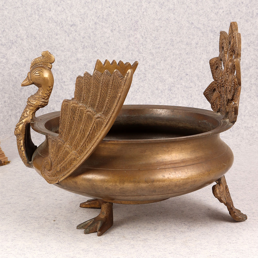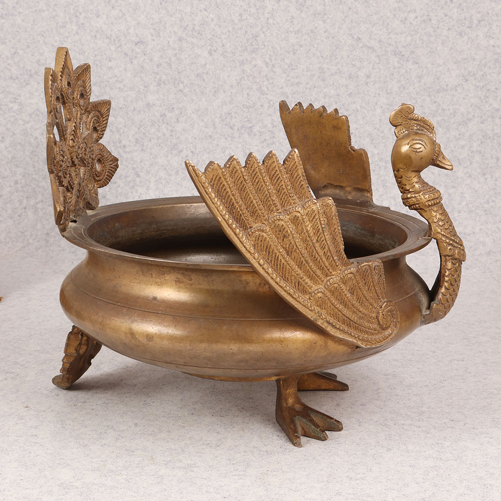 Buy a brass Urli online that is a captivating fusion of artistry and tradition. Handcrafted by highly talented Indian artisans in the esteemed South Indian Art tradition, this Urli boasts a unique peacock carving, symbolizing grace and elegance. The three intricately designed legs lend a classic charm to the piece, elevating its aesthetic appeal. Crafted from high-quality brass, the Urli showcases a rich antique brown finish, adding a touch of vintage allure to any space. Its versatile design allows it to seamlessly complement various settings, making it a perfect addition to homes, offices, restaurants, hotels, or cafes. Whether displayed as a standalone statement piece or incorporated into a vintage collection, this Urli effortlessly enhances the ambiance with its timeless charm. This masterpiece is not only a visual delight but also a thoughtful gift for your loved ones on special, festive, or auspicious occasions. Its craftsmanship and cultural significance make it a symbol of tradition, making it a cherished addition to any home or a distinctive touch to commercial spaces.