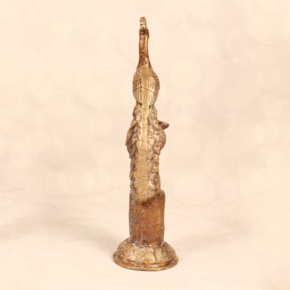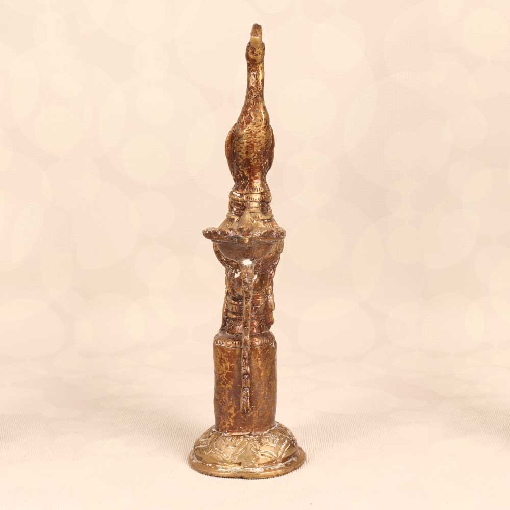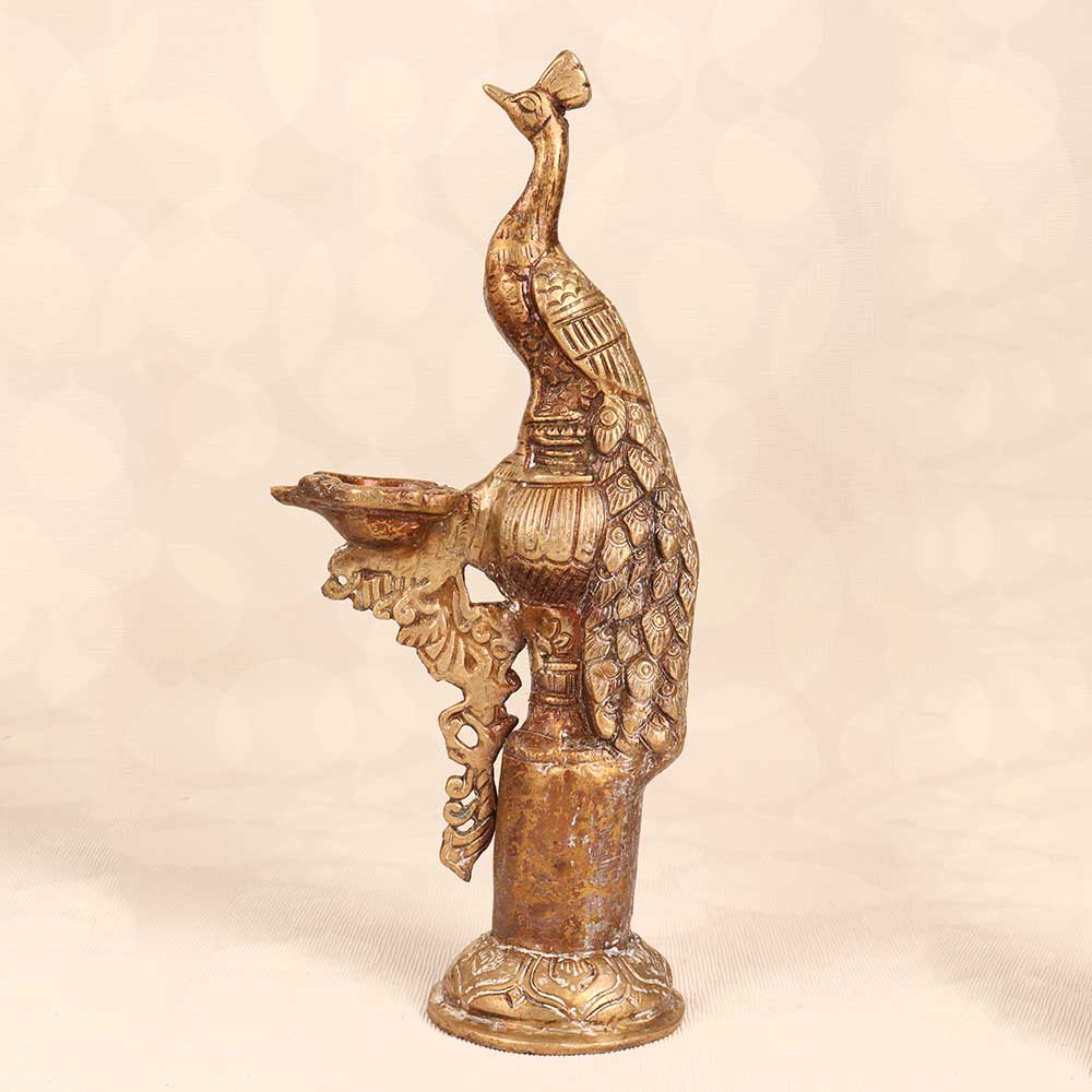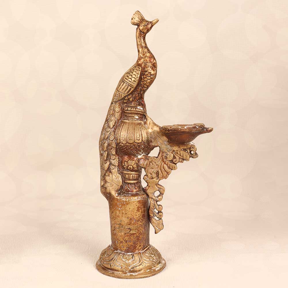Illuminate your home with the majestic glow of the Brass Peacock Oil Lamp. This vintage-inspired lamp features an intricately designed brass peacock perched atop a sturdy base, its tail feathers fanned out to hold the glass lamp chimney. When lit, the peacock's colorful plumage comes to life, creating a warm, inviting ambiance perfect for any room. The lamp's beautiful peacock design makes a decorative statement while providing a natural, flame-lit glow. The brass body lends a vintage, old-world feel with its finely crafted detailing. When lit, the peacock seems to preen and display its feathers in the firelight. This lamp is ideal for anyone looking to add a touch of elegance that harkens back to classic Indian style. The peacock motif and oil lamp design provide exotic flair that stimulates the senses. Give your home decor a majestic boost with the glow of the Brass Peacock Oil Lamp.