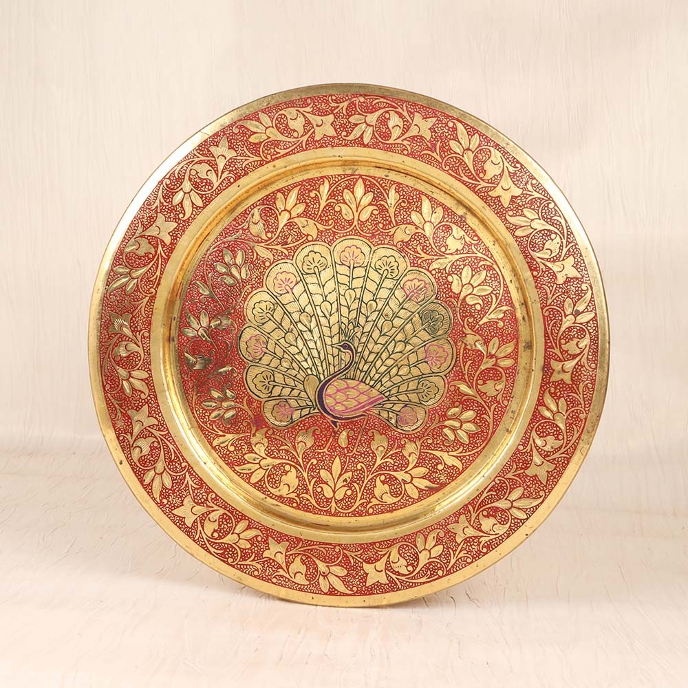 Unlock the timeless elegance of a bygone era with our exquisite Vintage Brass Peacock Plate. This stunning piece is a true work of art, featuring a breathtaking peacock engraving and mesmerizing enamel work in rich red and blue hues. Elevate your home decor with this exquisite Vintage Brass Peacock Plate. The timeless design and impeccable craftsmanship make it a true heirloom piece that will be cherished for generations. Whether you're looking to add a focal point to your living room, dining room, or entryway, this plate is sure to impress and delight. Bring the beauty of the past into your present-day space and experience the joy of surrounding yourself with truly exceptional home decor. This Vintage Brass Peacock Plate is the perfect addition for the discerning homeowner who appreciates the enduring allure of antique-inspired accents. Showcase your refined taste and passion for one-of-a-kind pieces that tell a story. Transform any room into a harmonious oasis of vintage charm and modern sophistication.