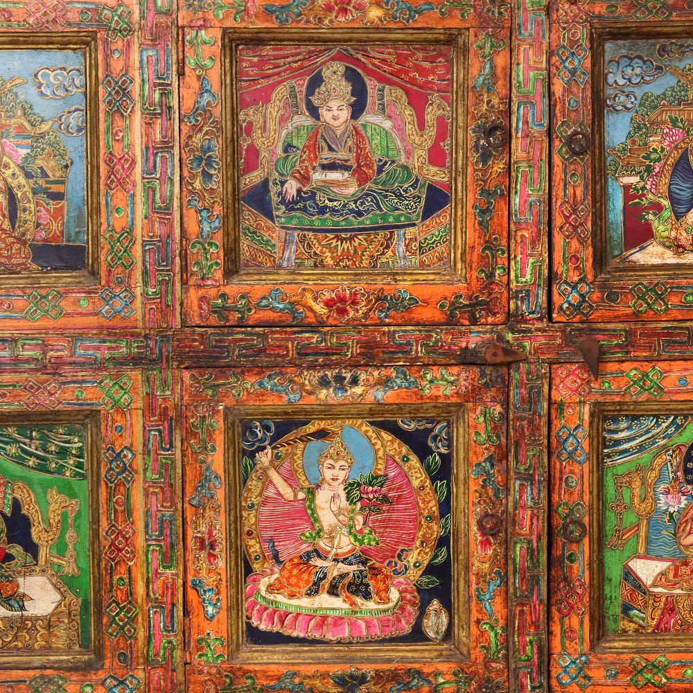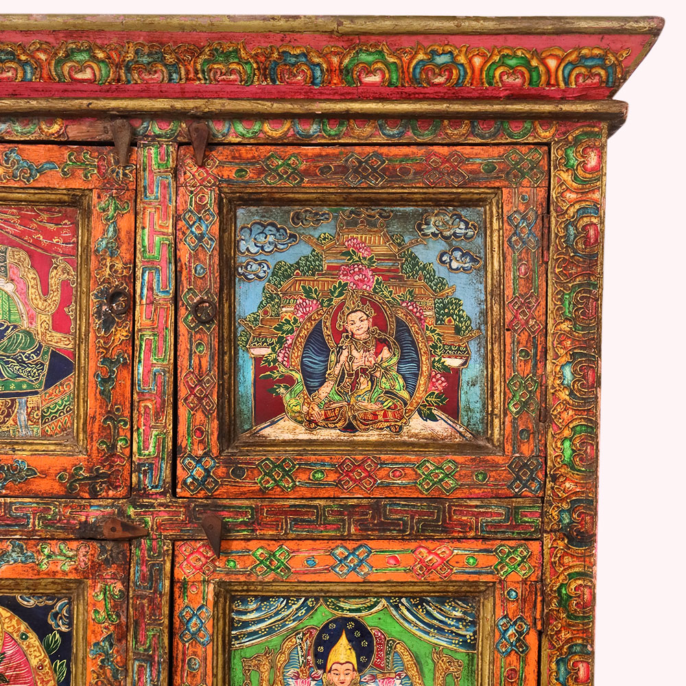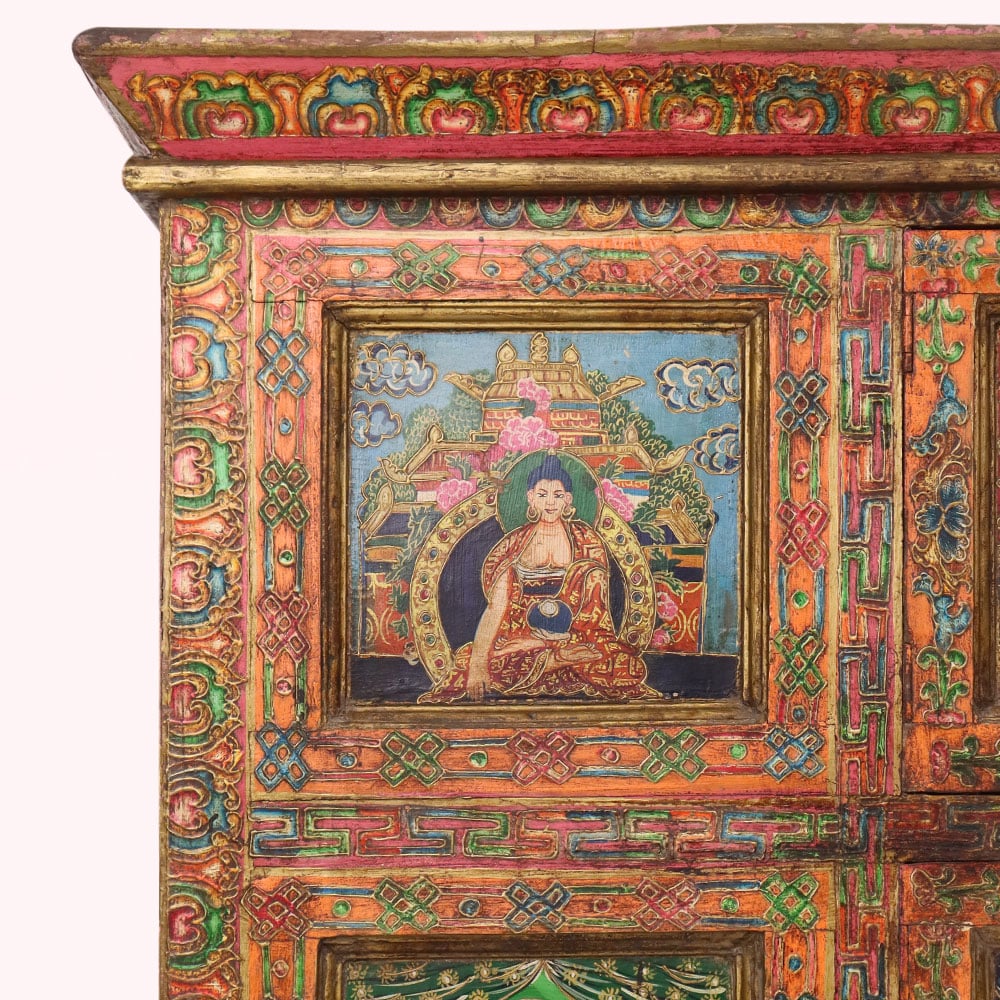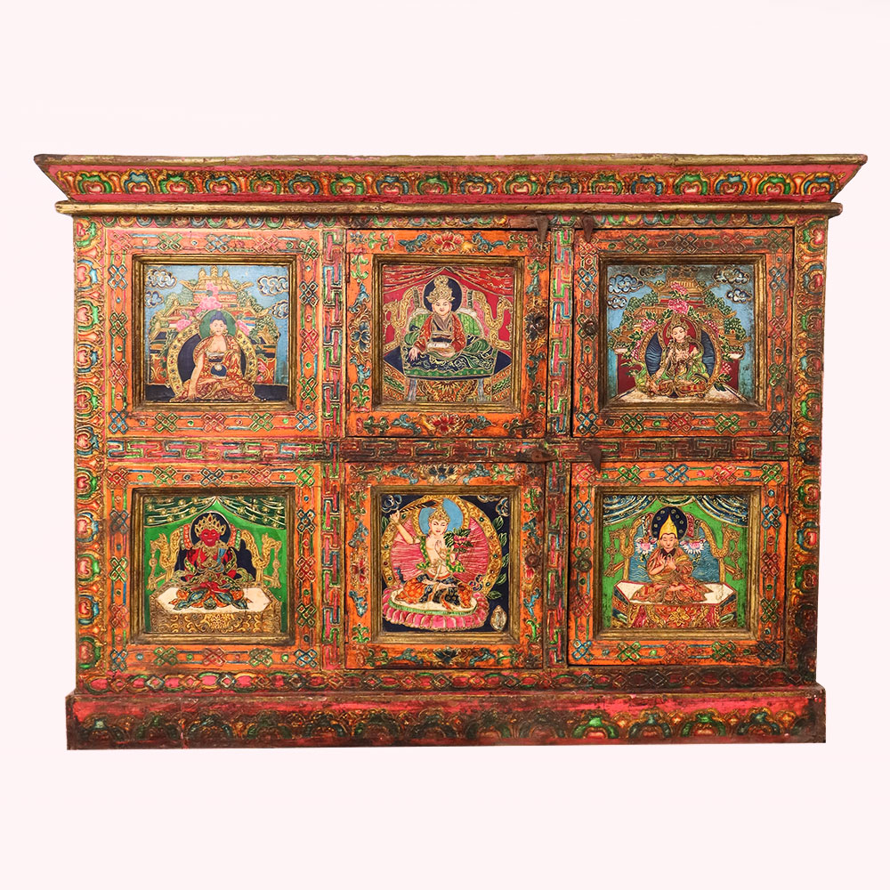 This handmade wooden storage cabinet is a remarkable work of art, hand-painted with detailed Buddha and deity figures that reflect Tibetan and Himalayan cultural traditions. Each of the six panels is adorned with vibrant multicolor artwork framed by intricate floral and geometric borders. The cabinet’s antique-style finish enhances its timeless character, making it both a practical storage unit and a stunning decorative piece. Perfect for keeping clothes, books, or sacred items, this cabinet also serves as a collectible for art enthusiasts and spiritual seekers. Crafted by skilled artisans using age-old painting techniques, every piece is unique, carrying its own story of heritage and devotion. This hand-painted wooden cabinet adds cultural depth, spiritual elegance, and artistic charm to any interior.