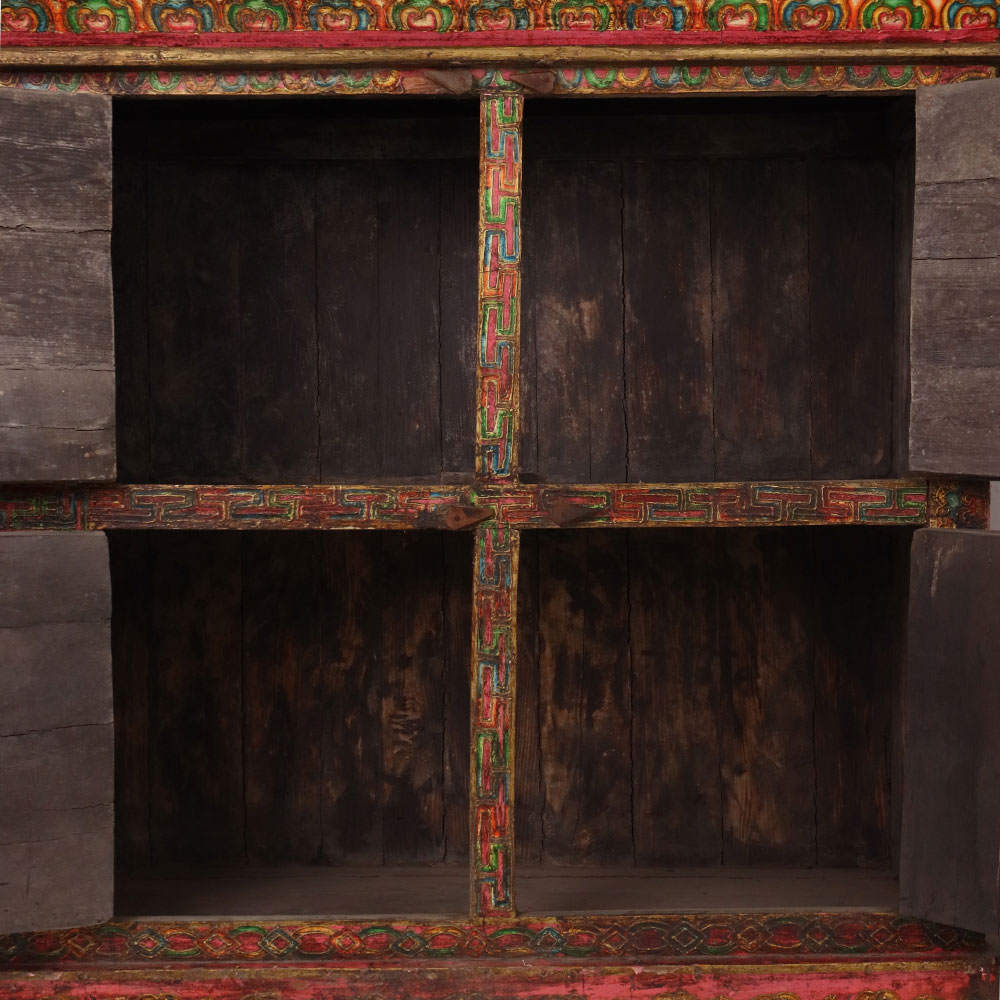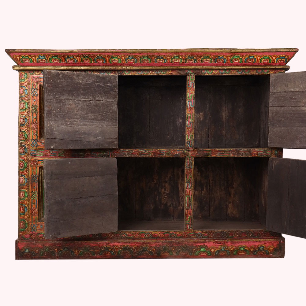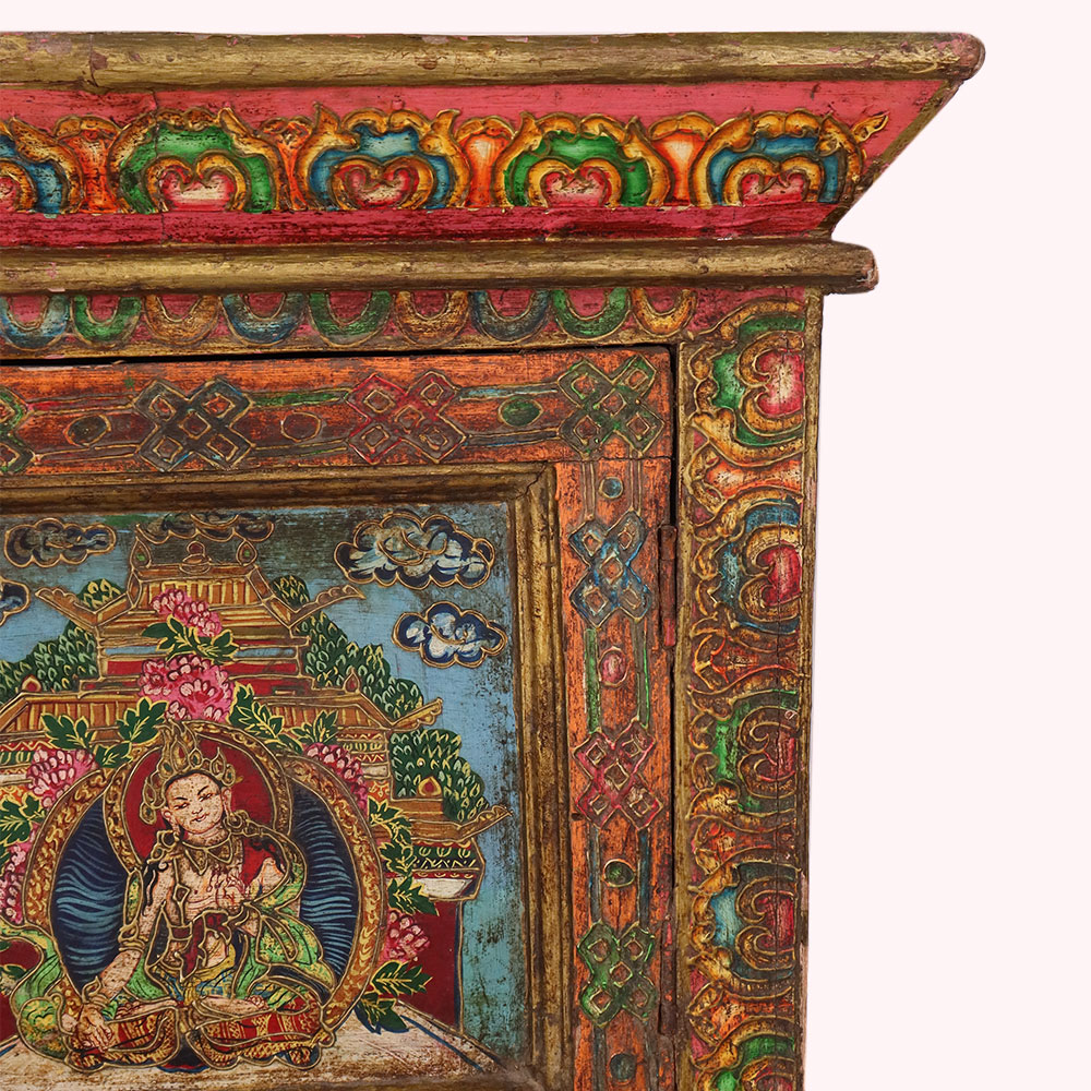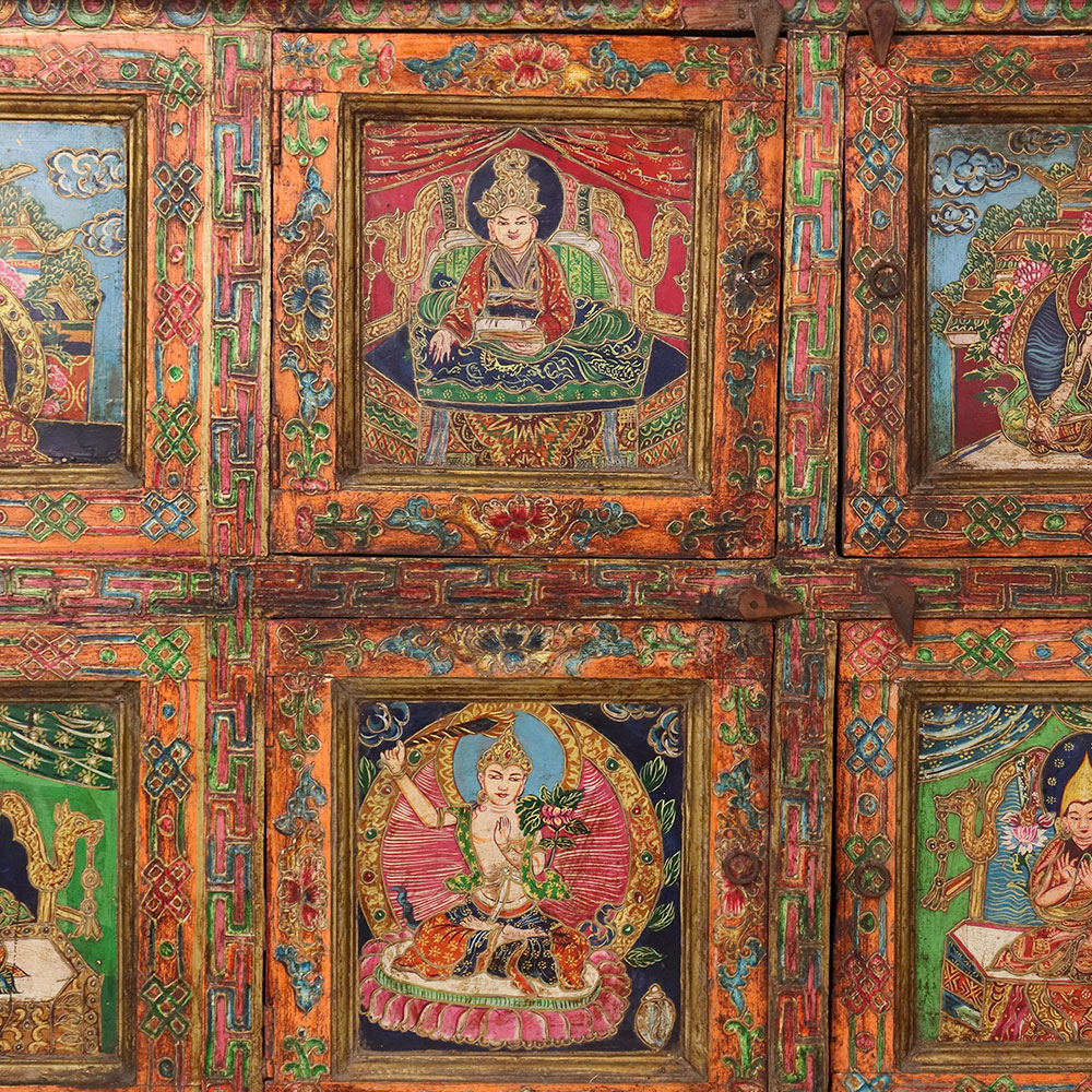 This handmade wooden storage cabinet is a remarkable work of art, hand-painted with detailed Buddha and deity figures that reflect Tibetan and Himalayan cultural traditions. Each of the six panels is adorned with vibrant multicolor artwork framed by intricate floral and geometric borders. The cabinet’s antique-style finish enhances its timeless character, making it both a practical storage unit and a stunning decorative piece. Perfect for keeping clothes, books, or sacred items, this cabinet also serves as a collectible for art enthusiasts and spiritual seekers. Crafted by skilled artisans using age-old painting techniques, every piece is unique, carrying its own story of heritage and devotion. This hand-painted wooden cabinet adds cultural depth, spiritual elegance, and artistic charm to any interior.