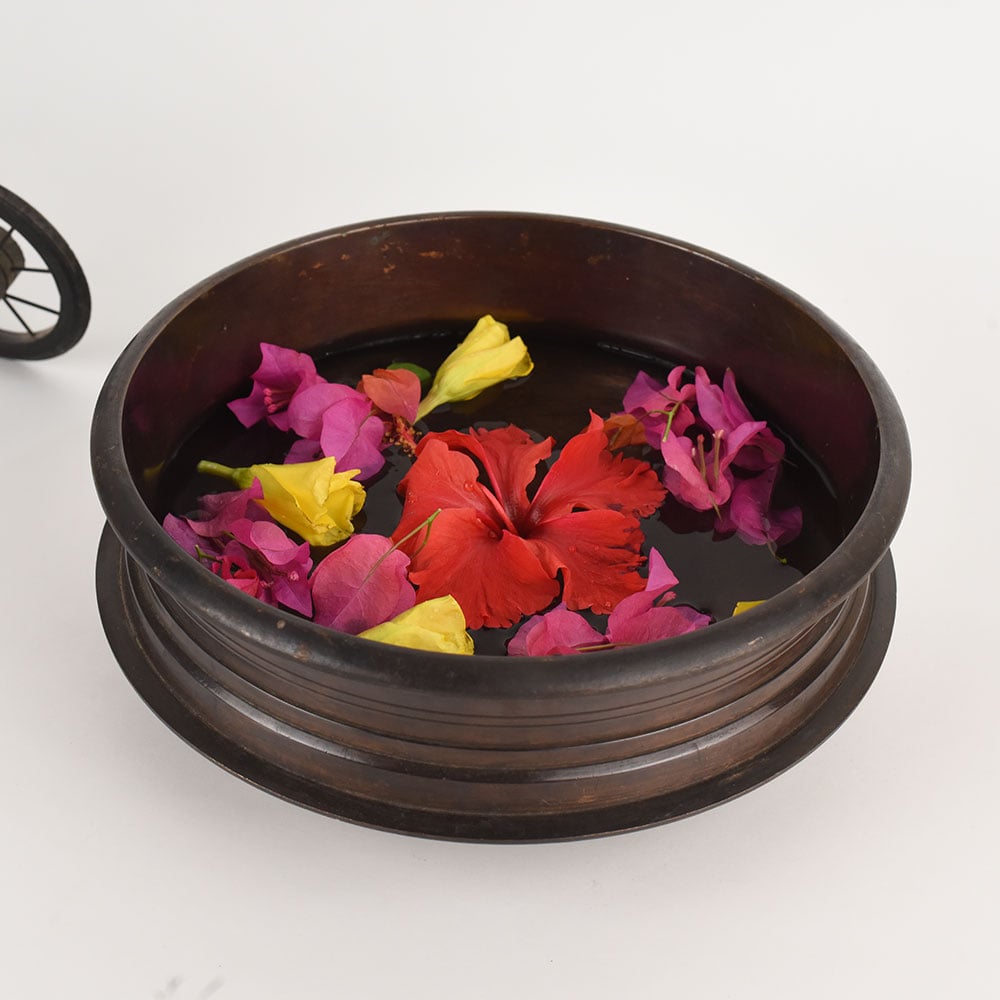 Enhance your home rituals with this deep floral brass urli, expertly crafted to hold generous amounts of water for larger arrangements of flowers or candles. The substantial depth allows petals to float gracefully without spilling, making it ideal for festive displays or calming meditation setups. Handmade from high quality brass, it boasts a rich dark finish that contrasts beautifully with the vivid colours of blossoms. Place it in a foyer or living room to welcome guests with a fragrant floral display, or use it outdoors on a patio for seasonal decor. The timeless design pays homage to traditional Indian culture while fitting seamlessly with modern interiors. Durable and versatile, it will become a cherished part of your Decor.