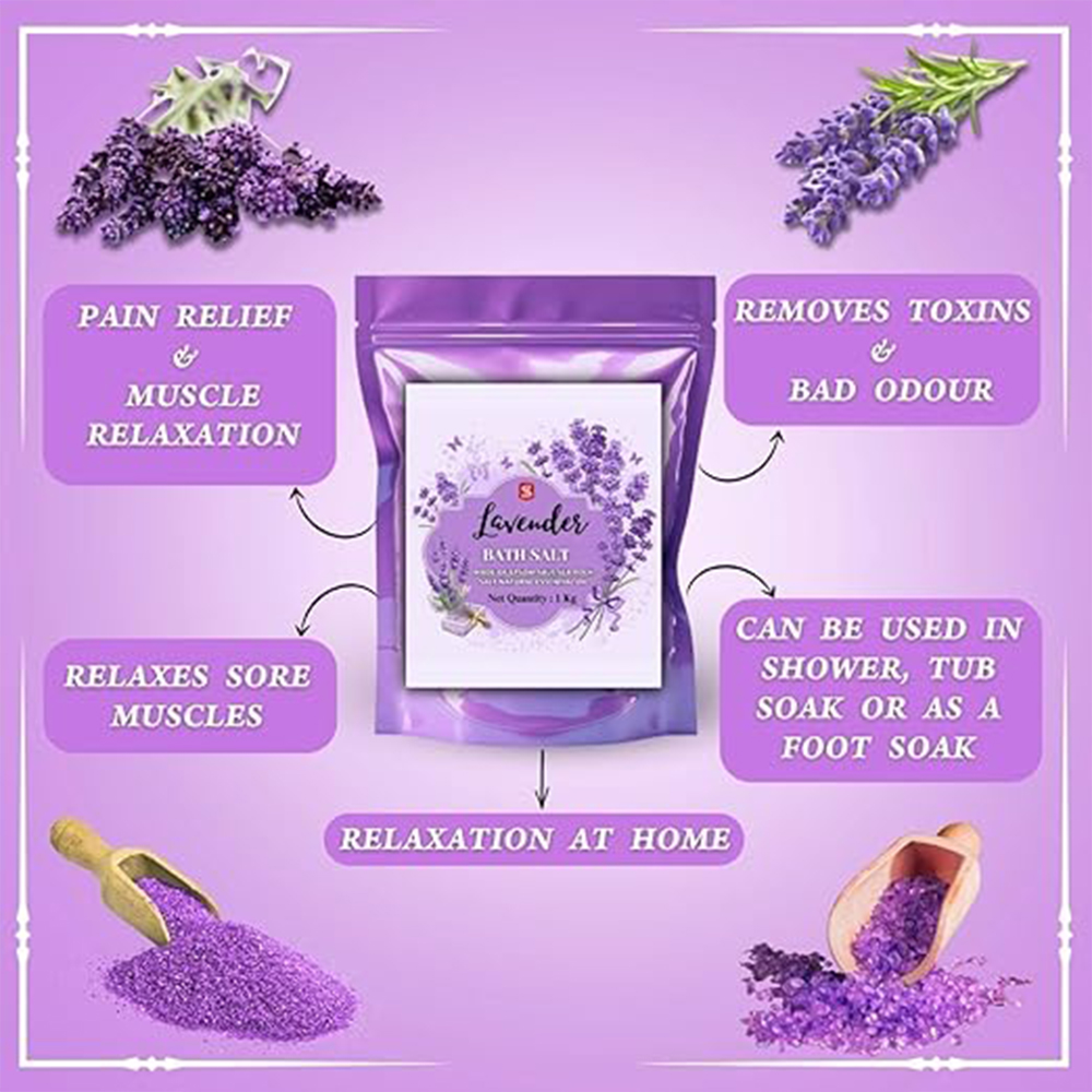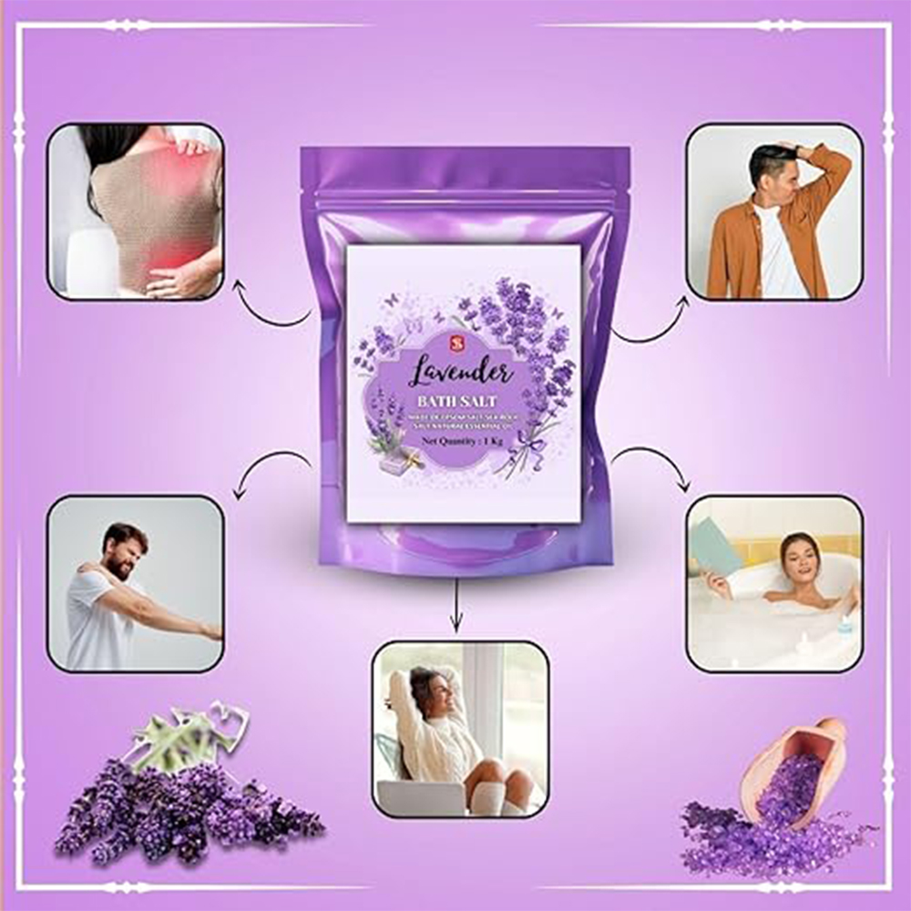 Experience the calming power of Lavender with this artisan-crafted bath salt. Blended with mineral-rich salts and lavender essence, it helps ease stress, soothe tired muscles, and promote restful sleep. This 1 kg pack is ideal for a spa-like soak at home, daily self-care, or gifting. Packed & quality-checked by Indianshelf.