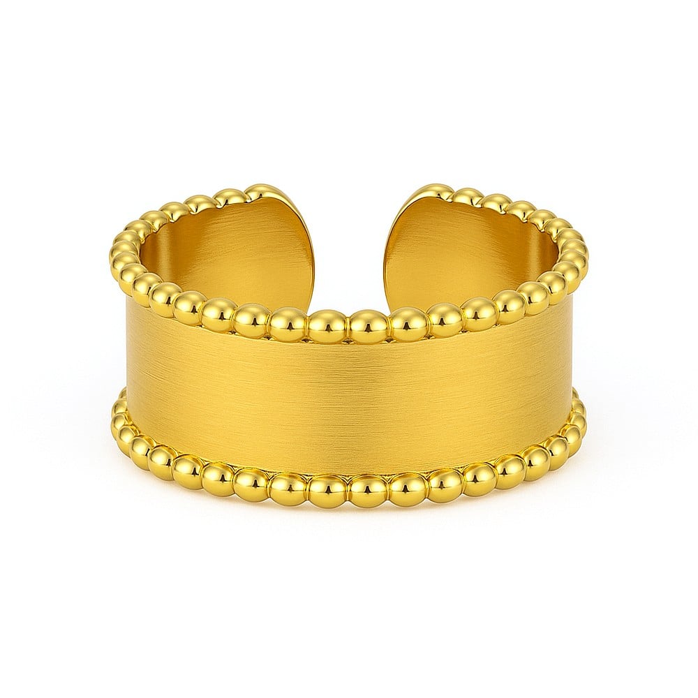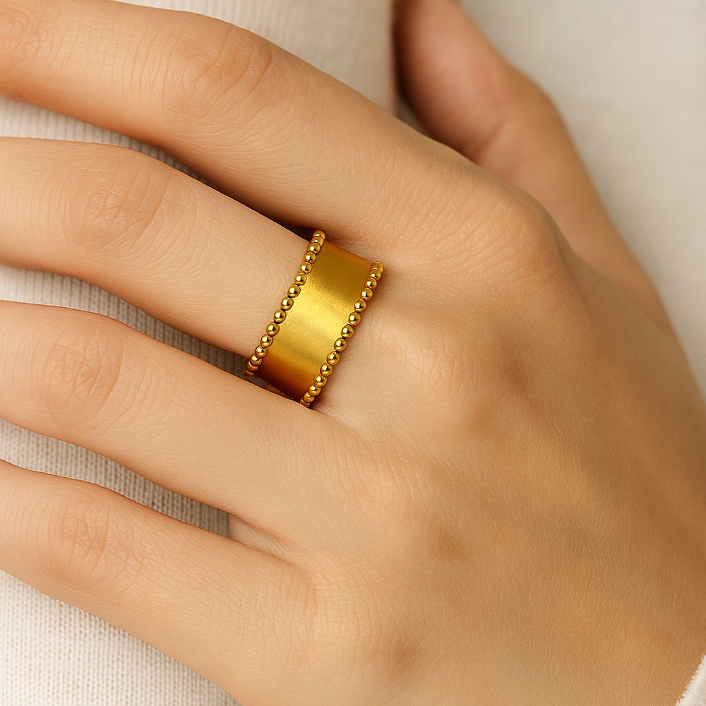 This demi-fine beaded band ring brings softness and structure into a single, balanced form. Crafted from stainless steel and finished with warm 18K gold plating, the surface is defined by a delicate beaded texture that adds depth without ornamentation. The design feels contemporary yet timeless, refined enough for daily wear and expressive enough to stand alone. A quiet statement built on detail rather than excess.