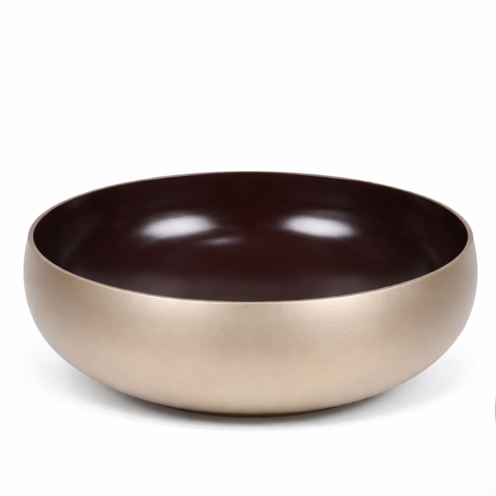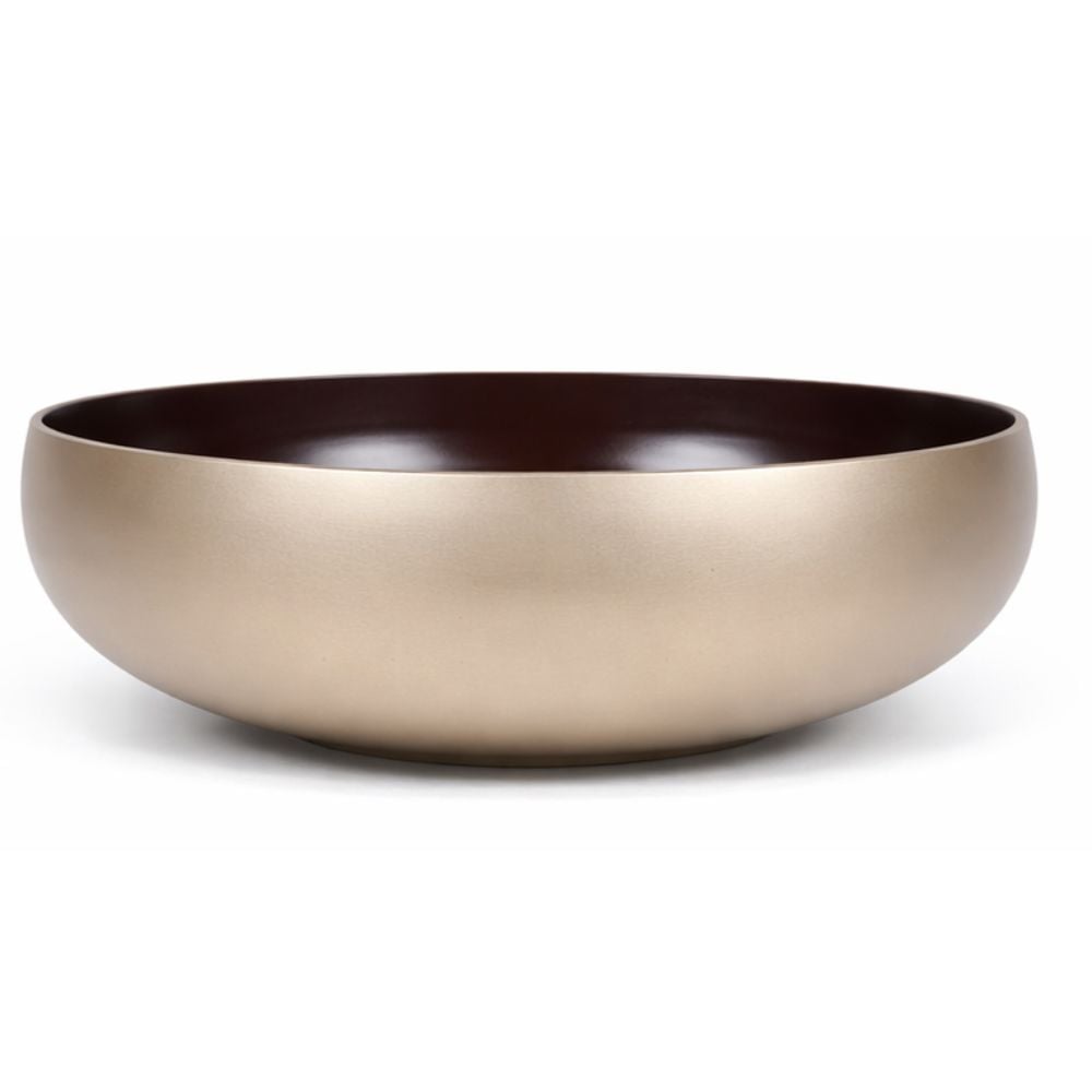 This designer bronze basin combines a rich brown interior with a softly muted gold exterior. Crafted by skilled Indian artisans, the contrast of finishes creates a refined visual balance suited for modern bathrooms and curated interiors. The smooth inner surface enhances daily usability while the outer tone adds understated luxury. Packed and quality checked by Indianshelf.