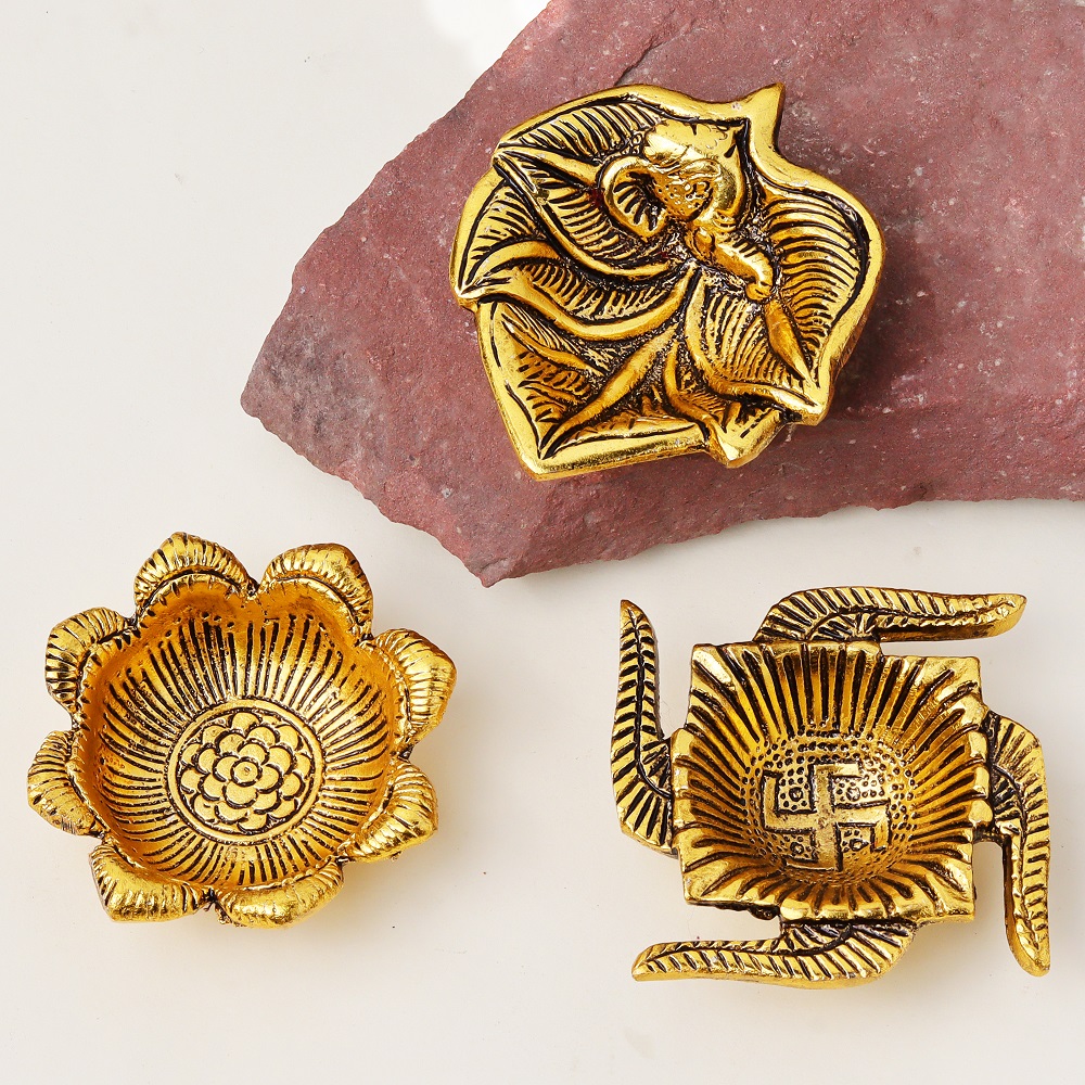 Enhance your festive season with the Designer Golden Aluminium Diya, perfect for decorating your pooja room. This set includes three exquisitely crafted Diya lamps, making them an ideal addition to your Diwali celebrations and pooja room decor. Constructed from high-quality aluminium and featuring a stunning golden finish, these diyas emit an elegant and warm glow, creating a welcoming atmosphere for prayers, rituals, and cherished moments.
