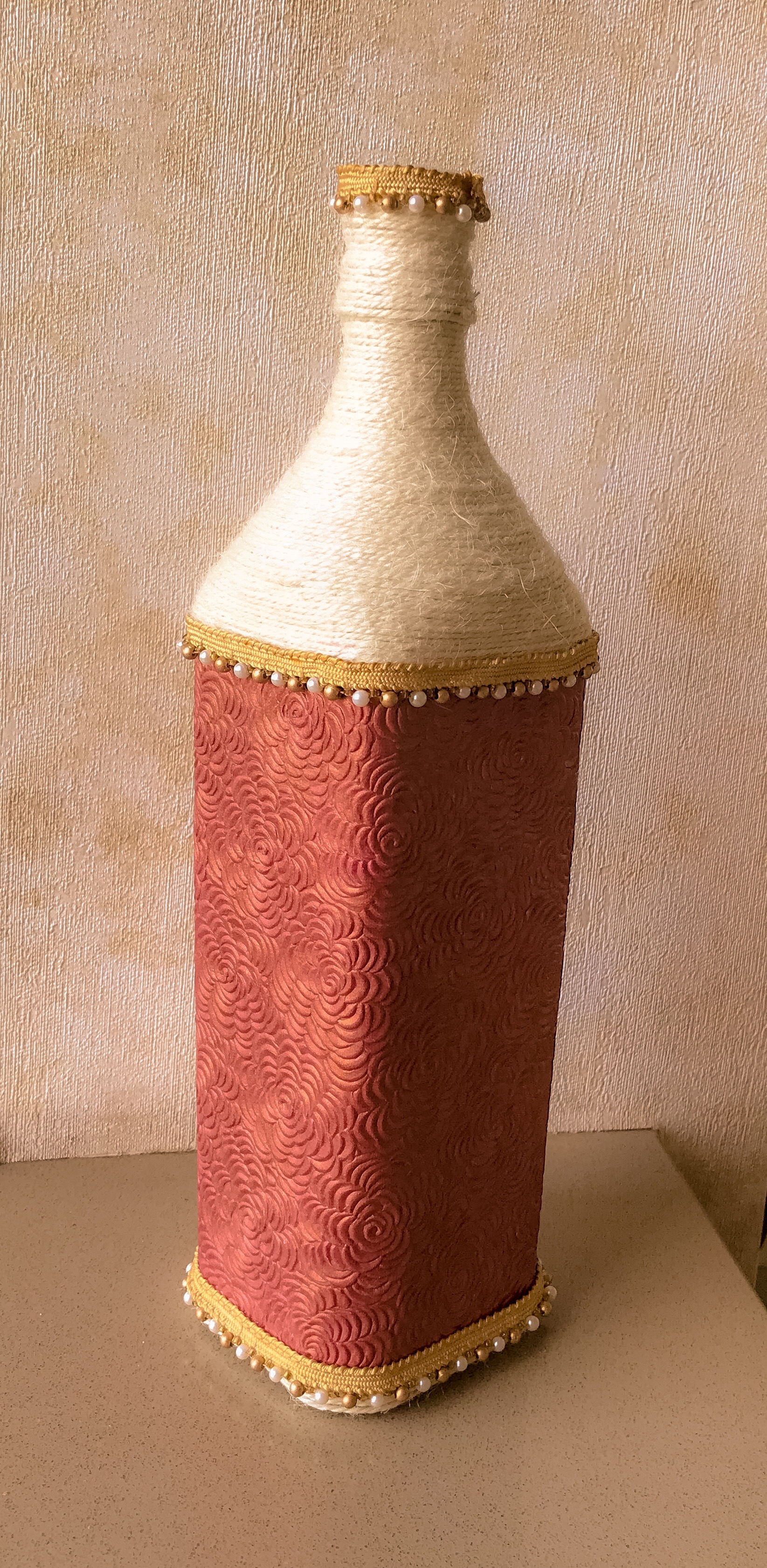its a designer glass bottle decorated with natural fiber jute. best to use as a home decor in your living room Also its a uniqe gift for friends and family I can also make it in various other colours as per your requirment
