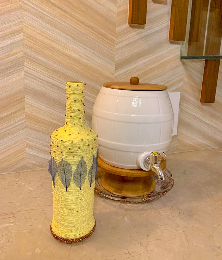 its a designer glass bottle decorated with natural fiber jute. best to use as a home decor in your living room Also its a uniqe gift for friends and family I can also make it in various other colours as per your requirment.