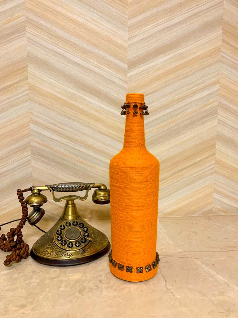 its a designer glass bottle decorated with natural fiber jute. best to use as a home decor in your living room Also its a uniqe gift for friends and family I can also make it in various other colours as per your requirment.