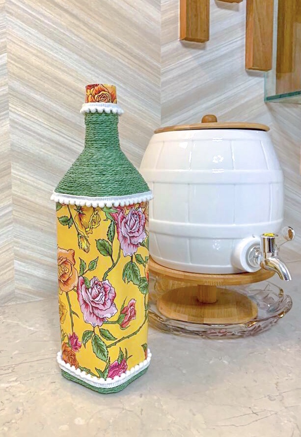 its a designer glass bottle decorated with natural fiber jute. best to use as a home decor in your living room Also its a uniqe gift for friends and family I can also make it in various other colours as per your requirment