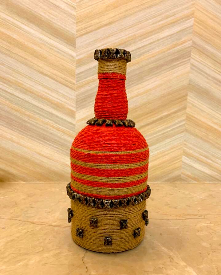 its a designer glass bottle decorated with natural fiber jute. best to use as a home decor in your living room Also its a uniqe gift for friends and family I can also make it in various other colours as per your requirment