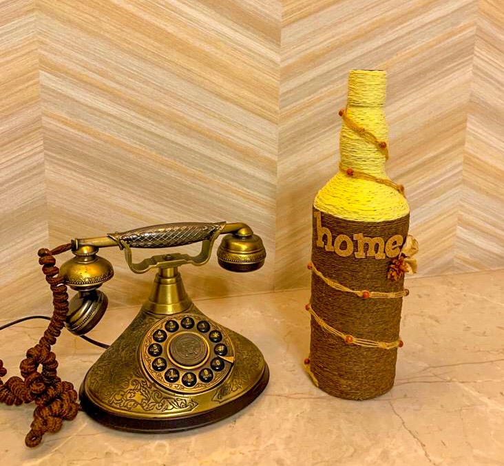 its a designer glass bottle decorated with natural fiber jute. best to use as a home decor in your living room Also its a uniqe gift for friends and family I can also make it in various other colours as per your requirment