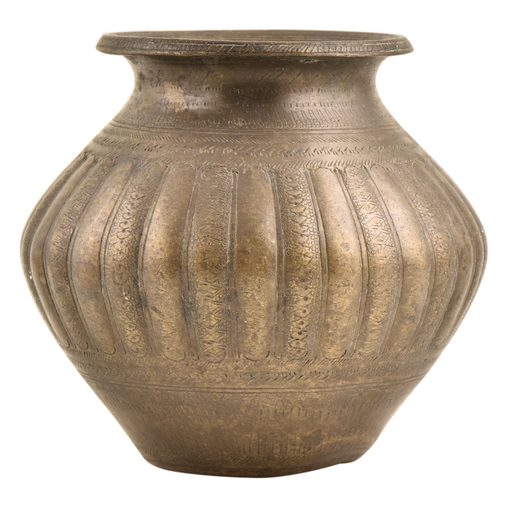 A hand engraved brass water pot has detailed engraving in the centre and just below the mouth .The pot has a bulging body in the centre with a wide mouth . It stands on a bottom rim and a has a smooth finish on the neck . It is a lovely decorative product and can be used for gifting.