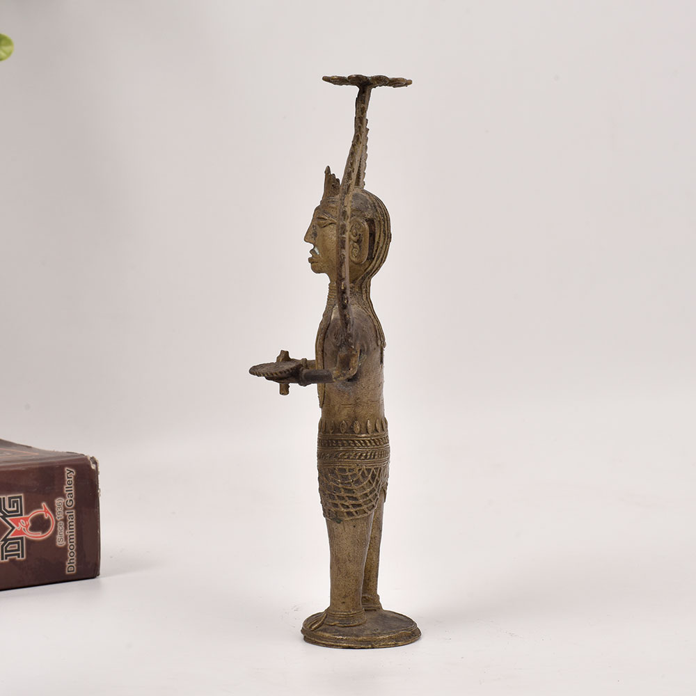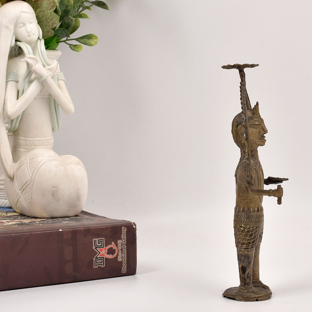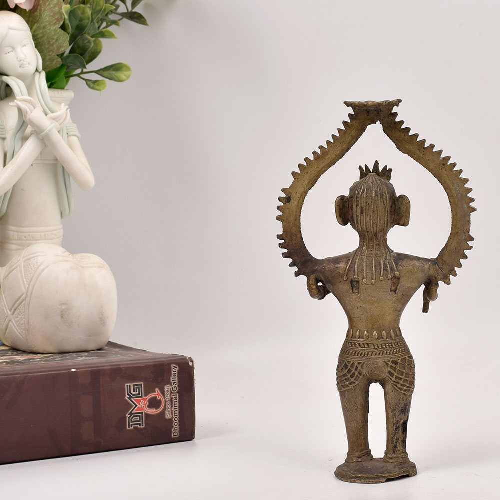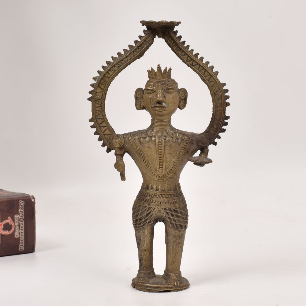 Invite the spiritual energy of a revered tribal deity into your living space with this captivating brass figure. Crafted using the centuries-old Dhokra metalworking method, this statue is a true testament to the skilled artistry of India's indigenous craftspeople. The solid brass construction gives it impressive heft and substance, while the intricate patterns and designs evoke the mysticism of ancient cultures. Whether placed on a shelf, table, or mantle, this tribal god figure commands attention. Its bold silhouette and striking visual details make it an eye-catching addition to any room. More than just a decorative accent, this piece also carries a sense of spiritual significance, allowing you to incorporate the positive vibes of a revered deity into your home environment.