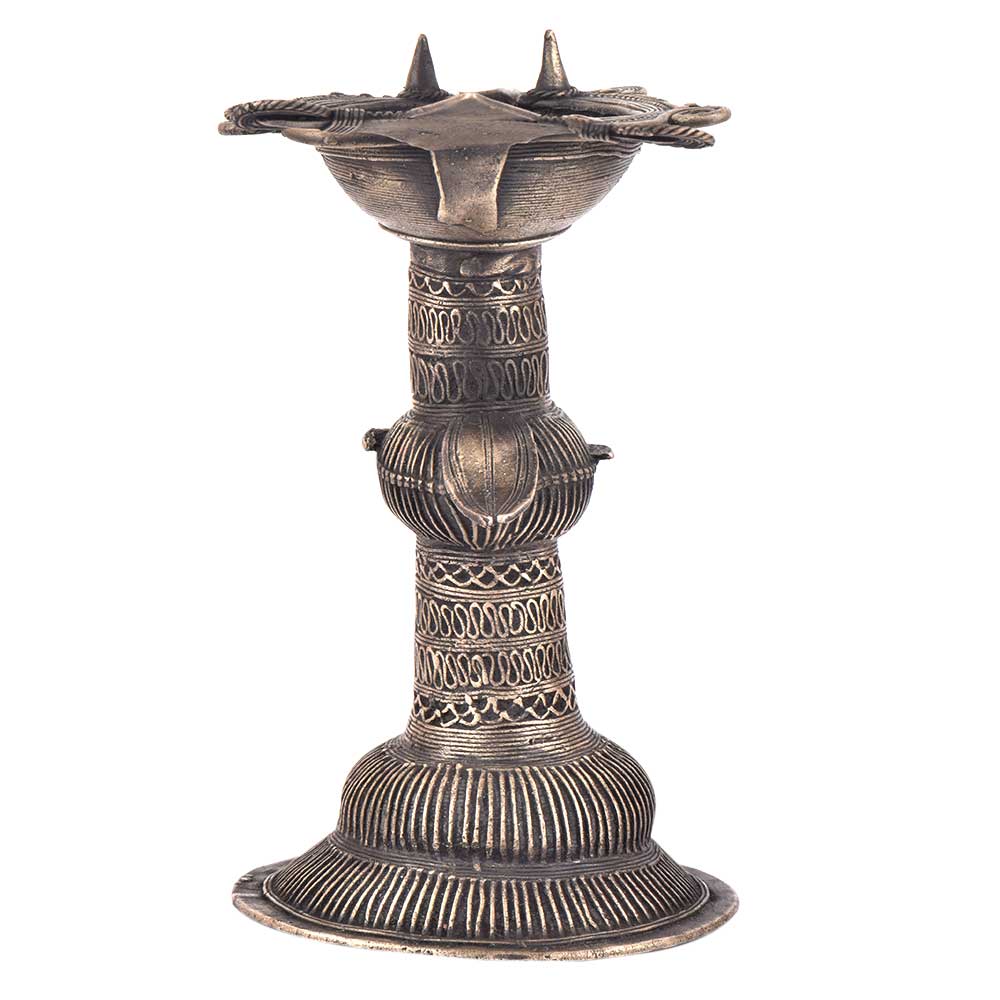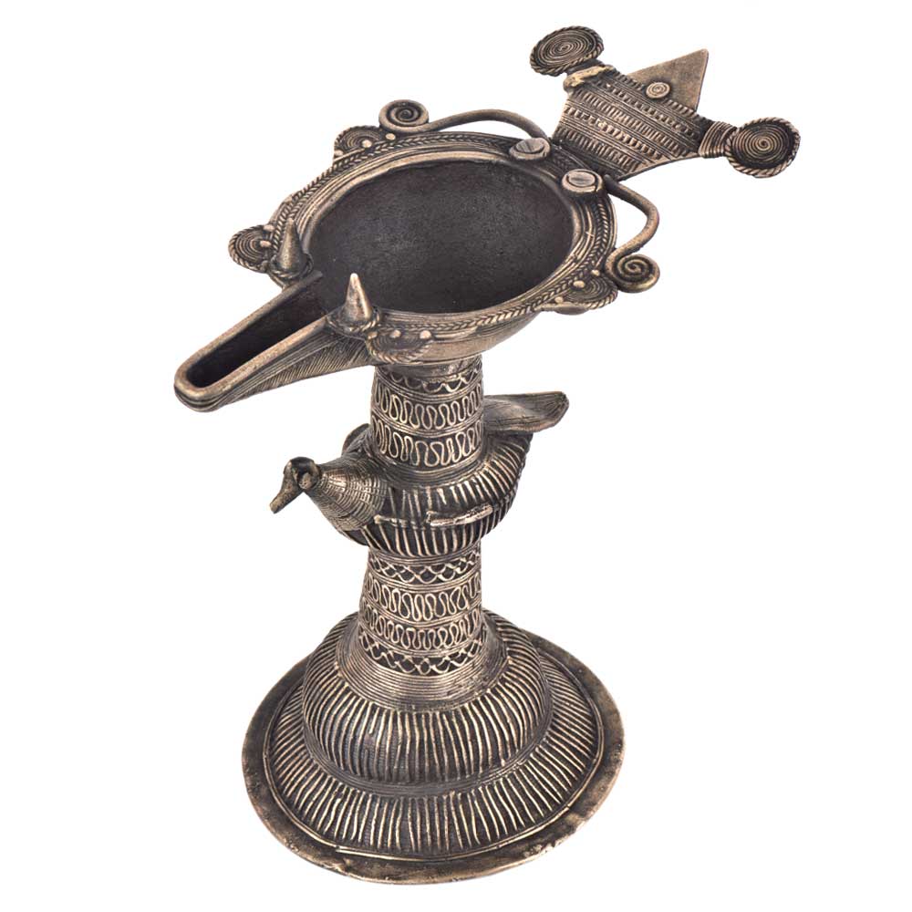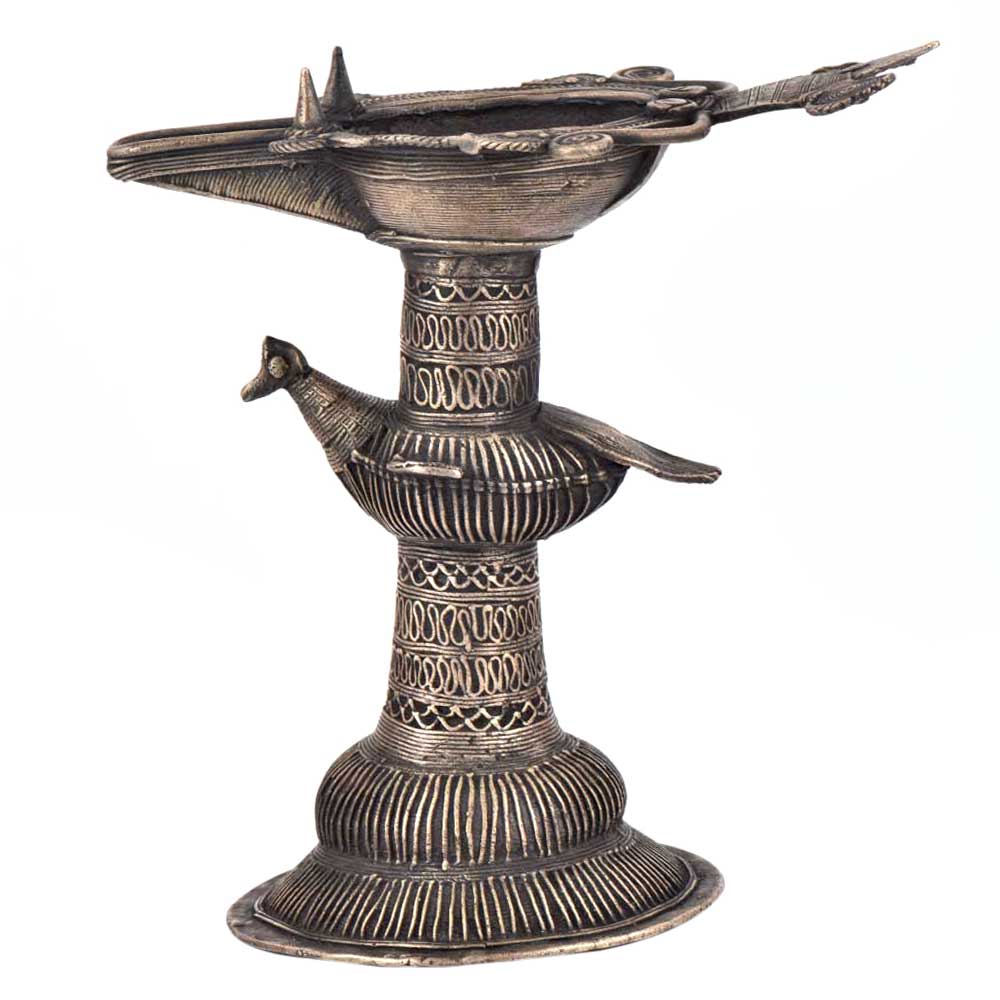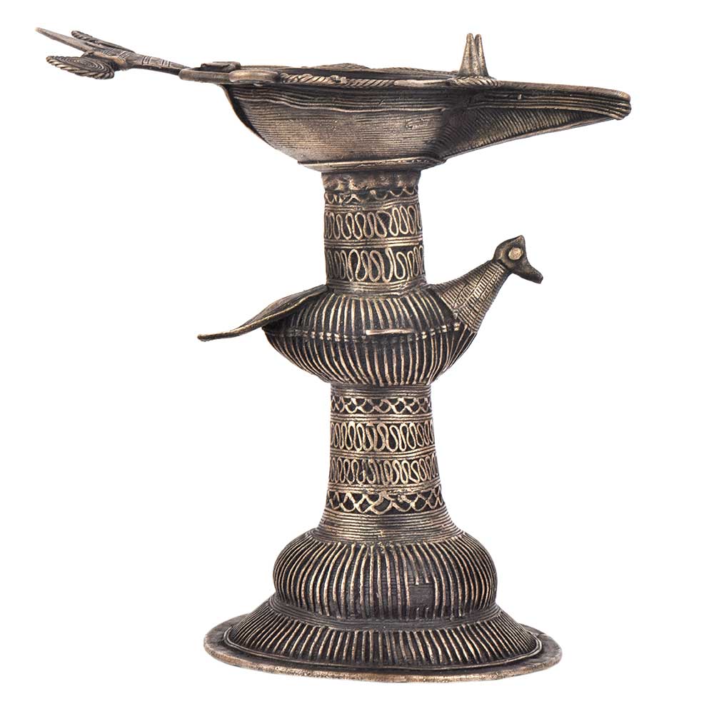 Dhokra Brass Oil Lamp With Stand Tribal Peacock Carving
