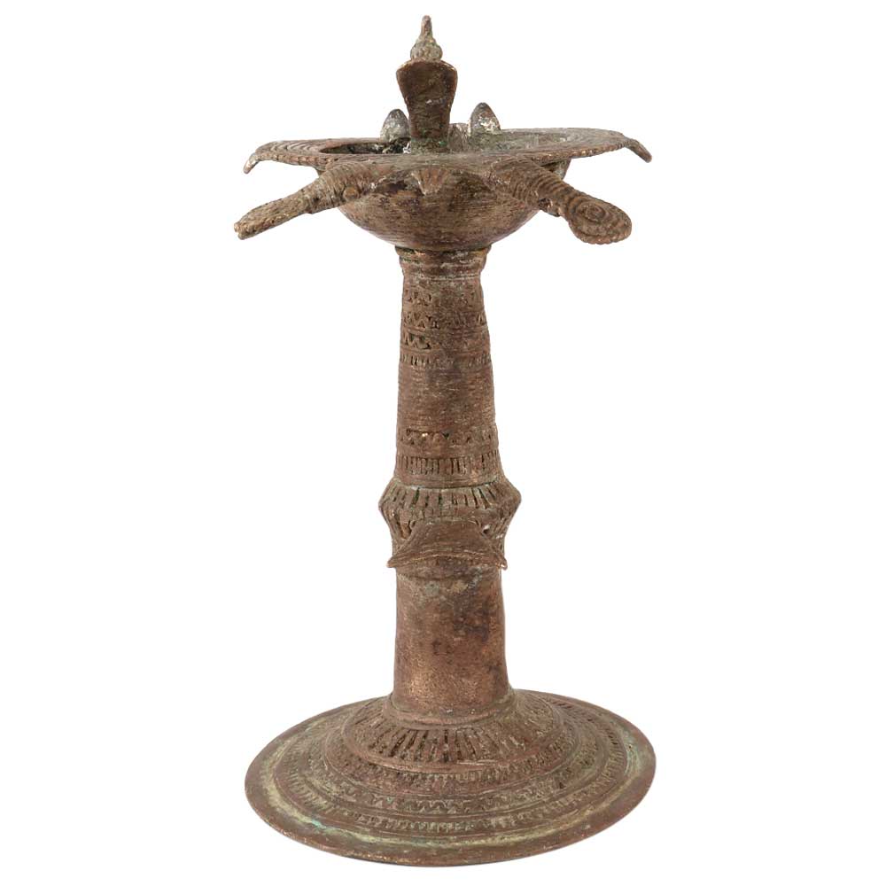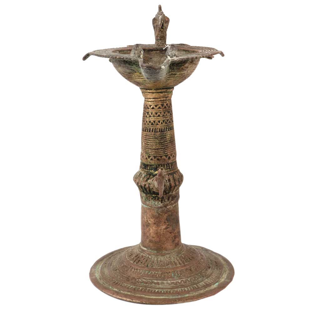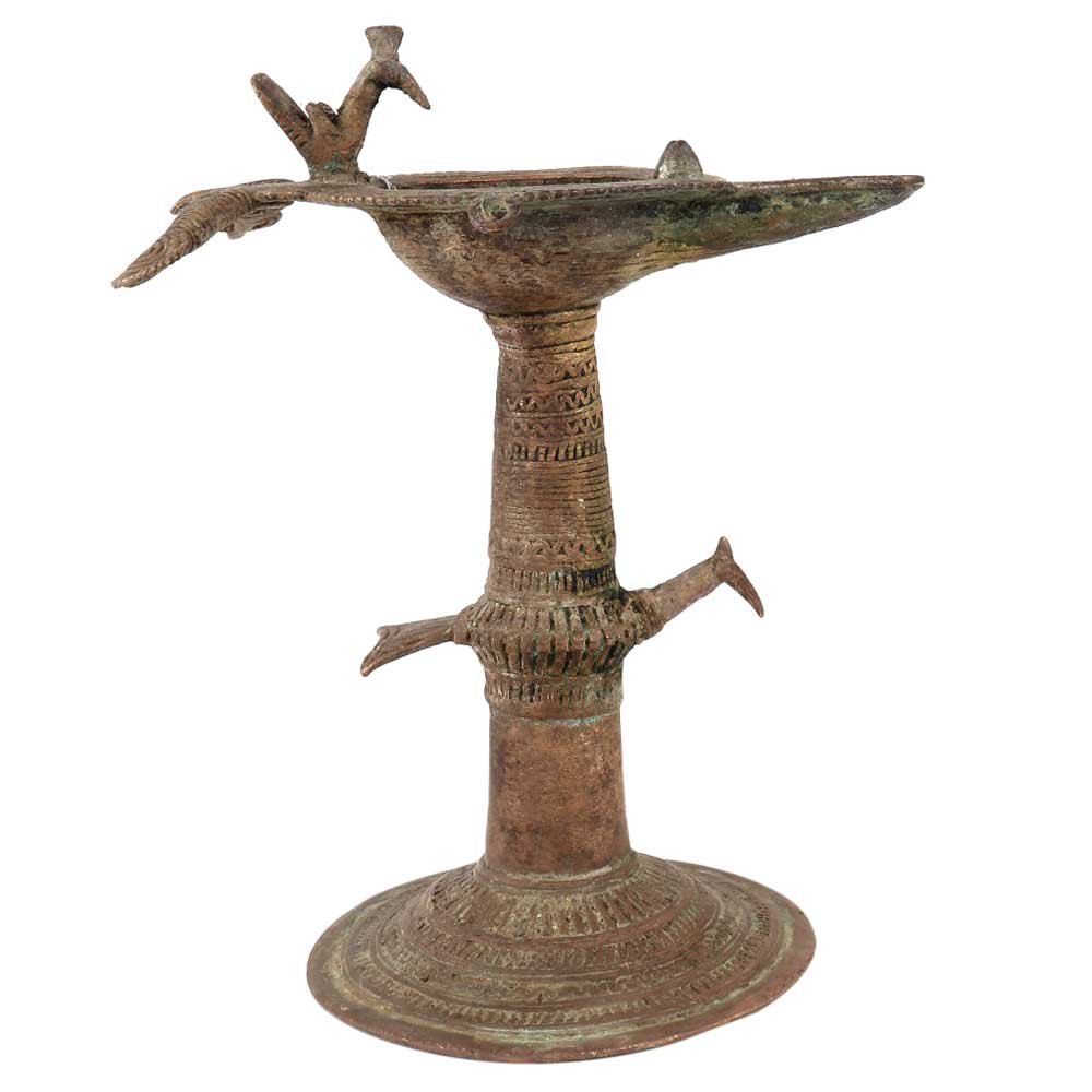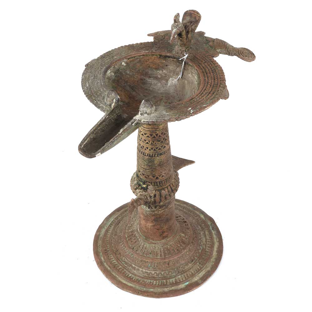 Dhokra Brass Work Oil Lamp With Peacock Carving