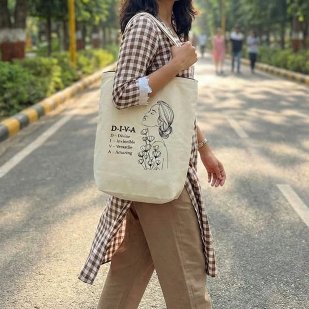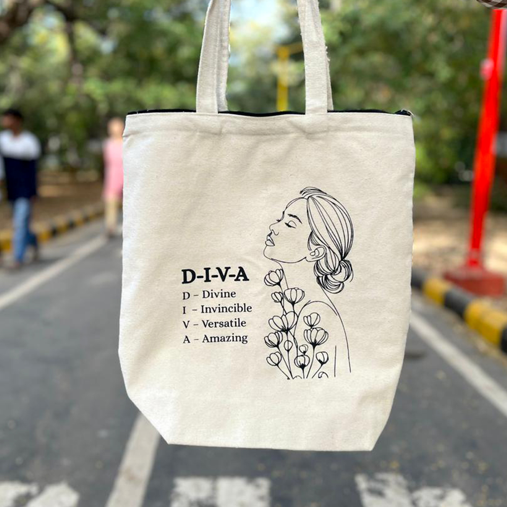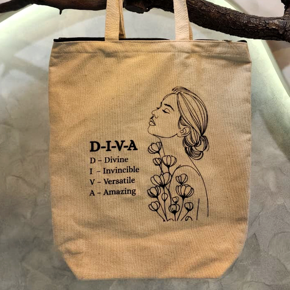 The DIVA tote is more than a carry bagits a reflection of inner strength and calm confidence. With its balanced composition and empowering message, it becomes a quiet reminder carried effortlessly through everyday life.