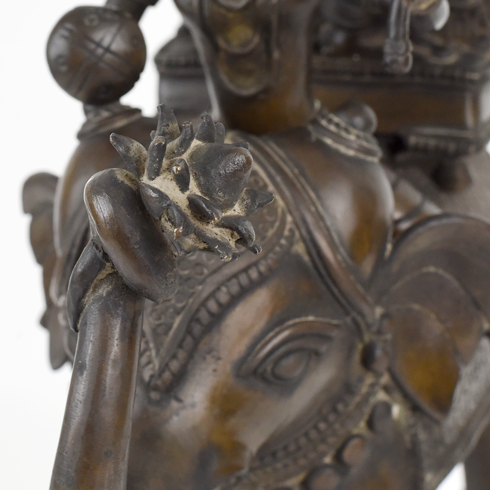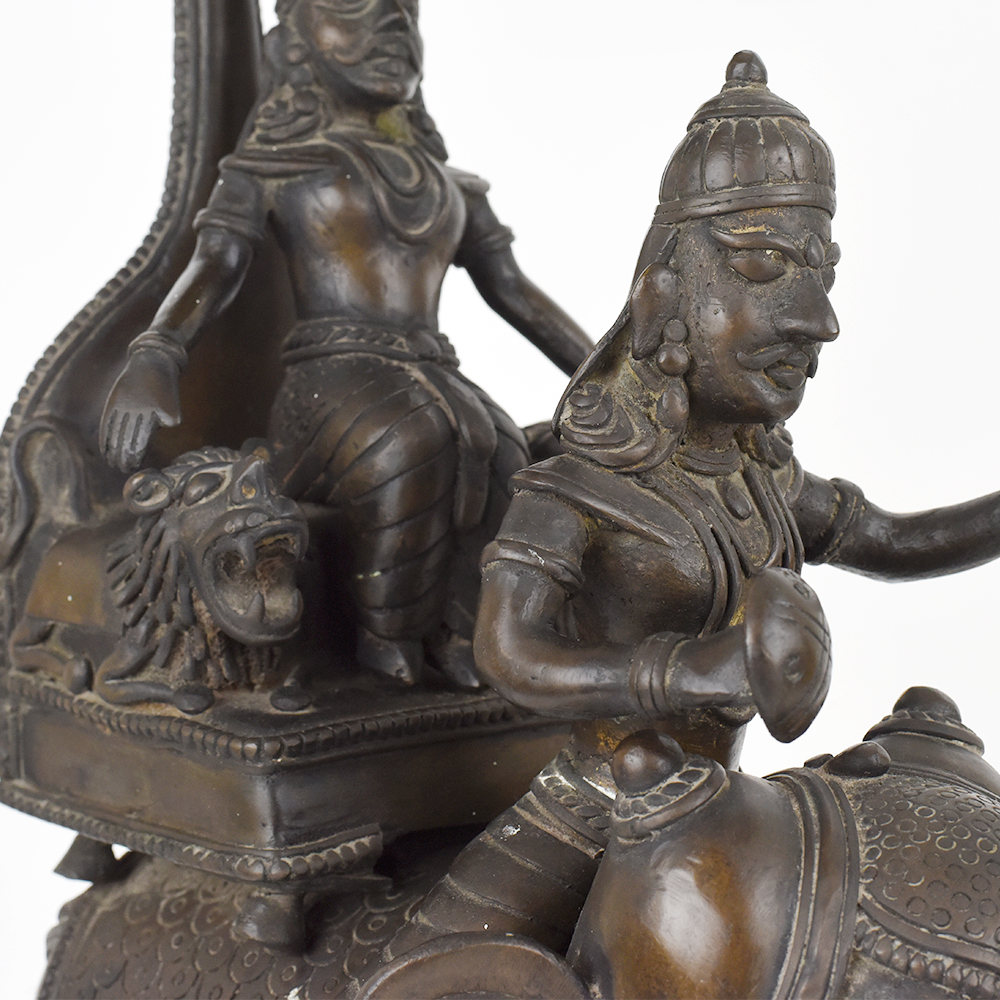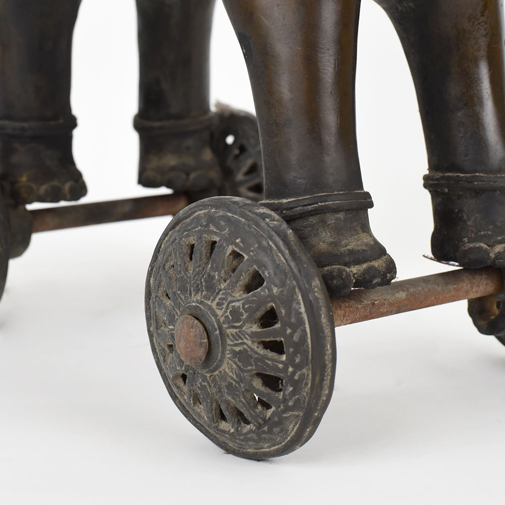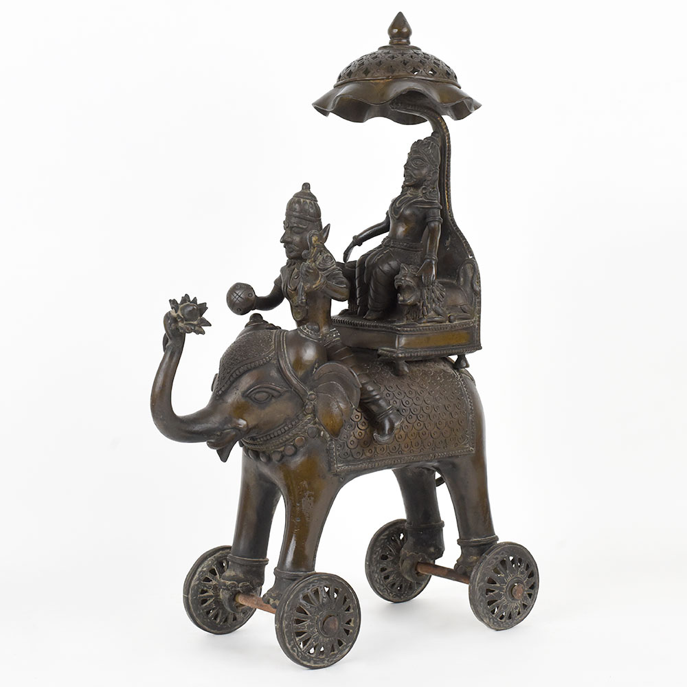 Bring home the splendour of divine processions with this pair of elephant chariot sculptures. Each piece features a finely crafted elephant on wheels carrying a deity under an intricately designed canopy, symbolising reverence and celebration. The elaborate detailing on the elephants, chariots, and figures showcases the artistry and devotion of the maker. Display them on a mantle, altar, or shelf to evoke a sense of spirituality and grandeur during festivals or as a year round statement. Made from solid metal, these pieces are sturdy and durable, with a patina that will deepen over time. Because they are handcrafted, slight variations make your pair unique.