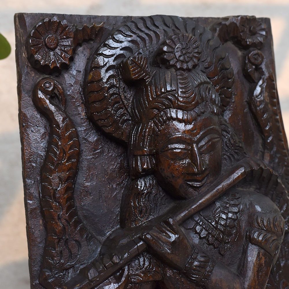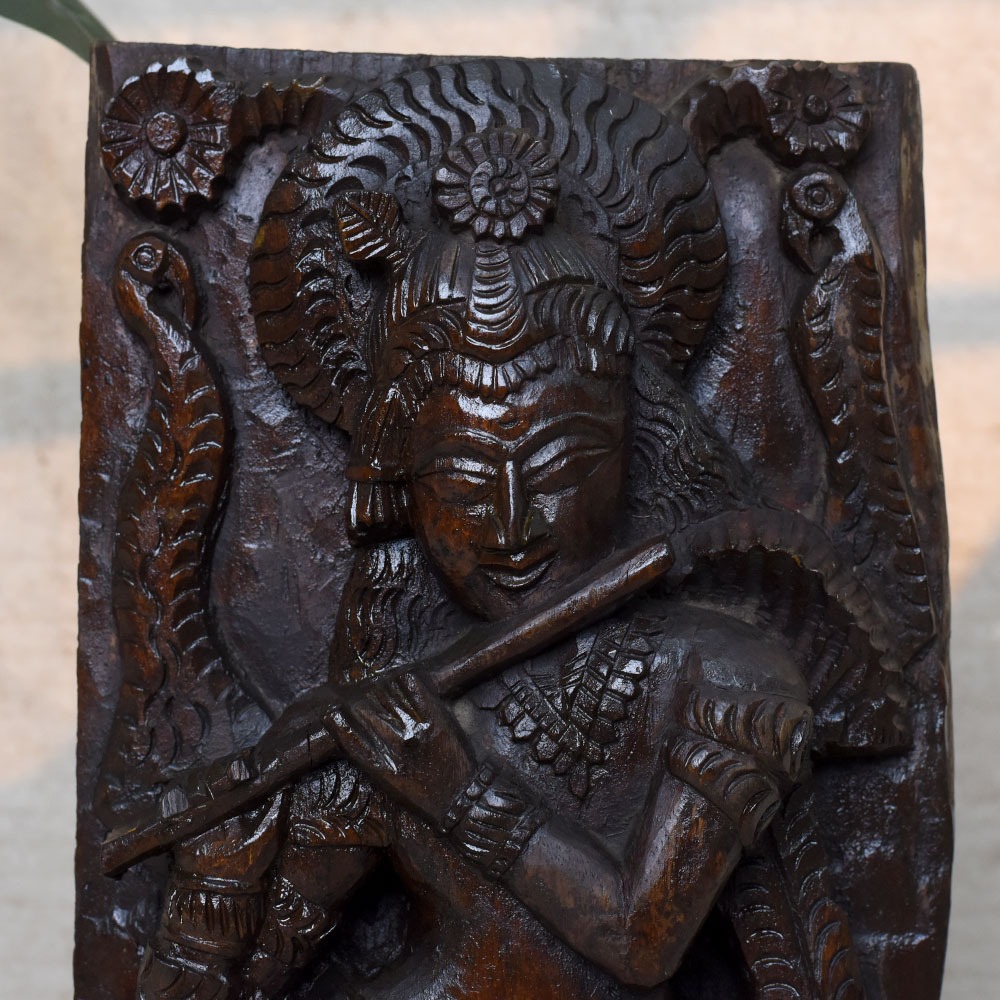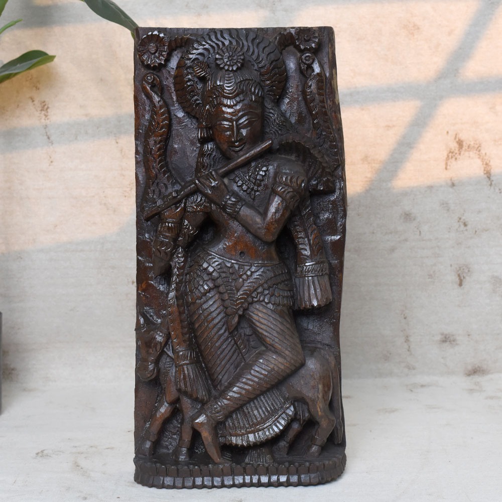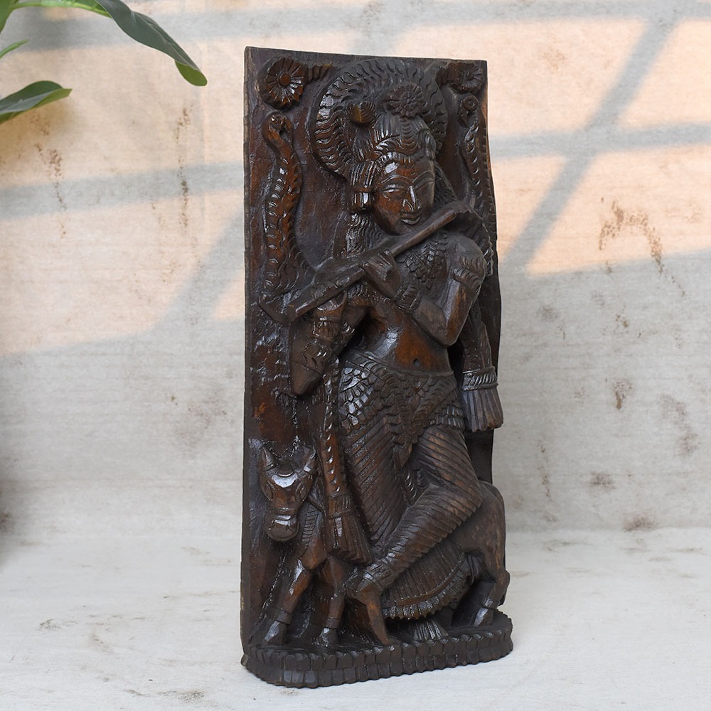 Celebrate the eternal charm of Lord Krishna with this Handcrafted 19 Inch Wooden Krishna Idol. Beautifully carved in solid wood, the idol depicts Krishna standing gracefully with his flute, adorned with intricate details and surrounded by symbolic motifs. This sculpture brings divine energy, peace, and artistry into your home or sacred space.