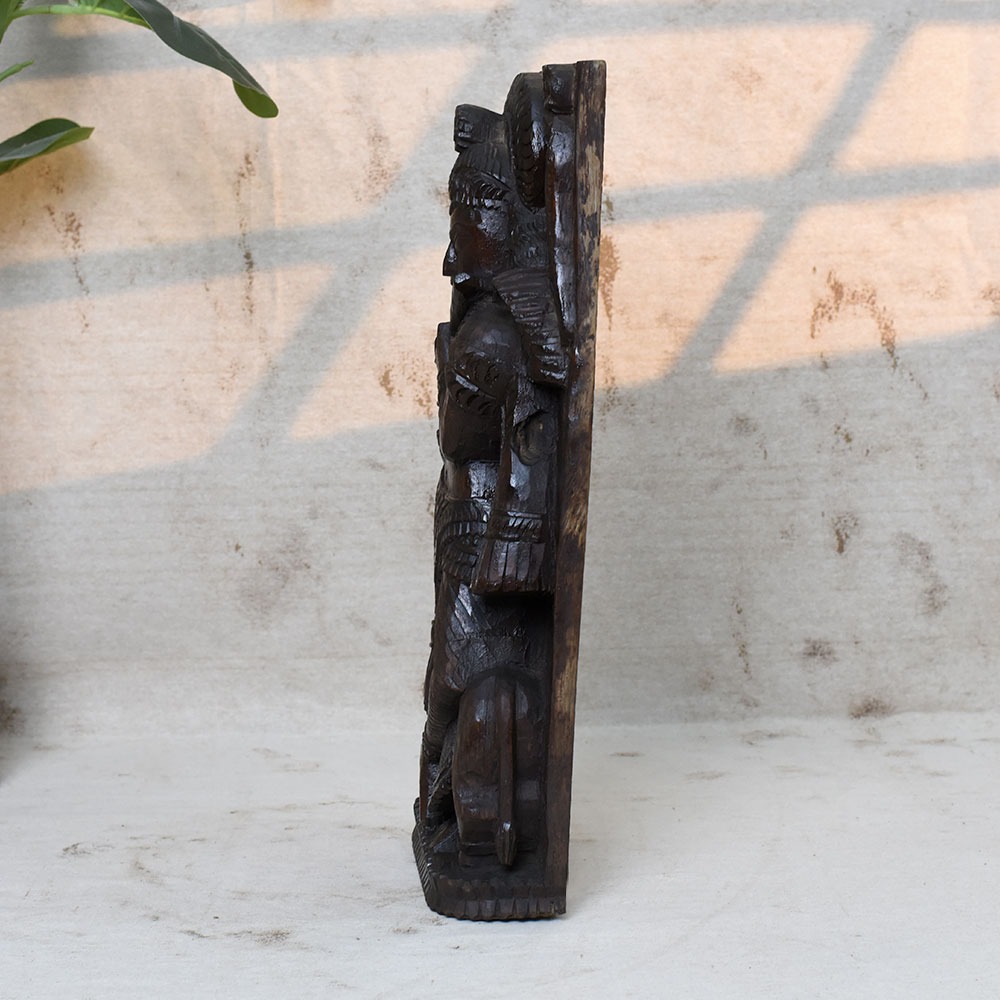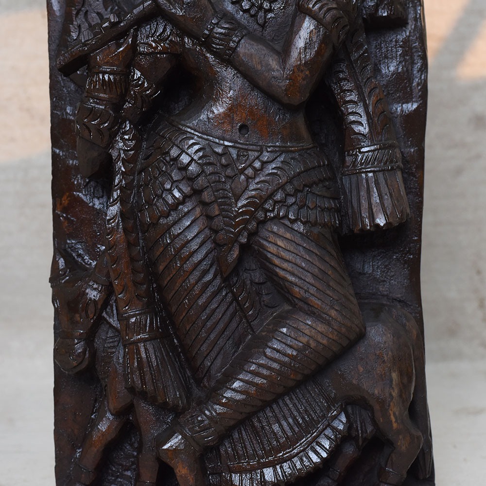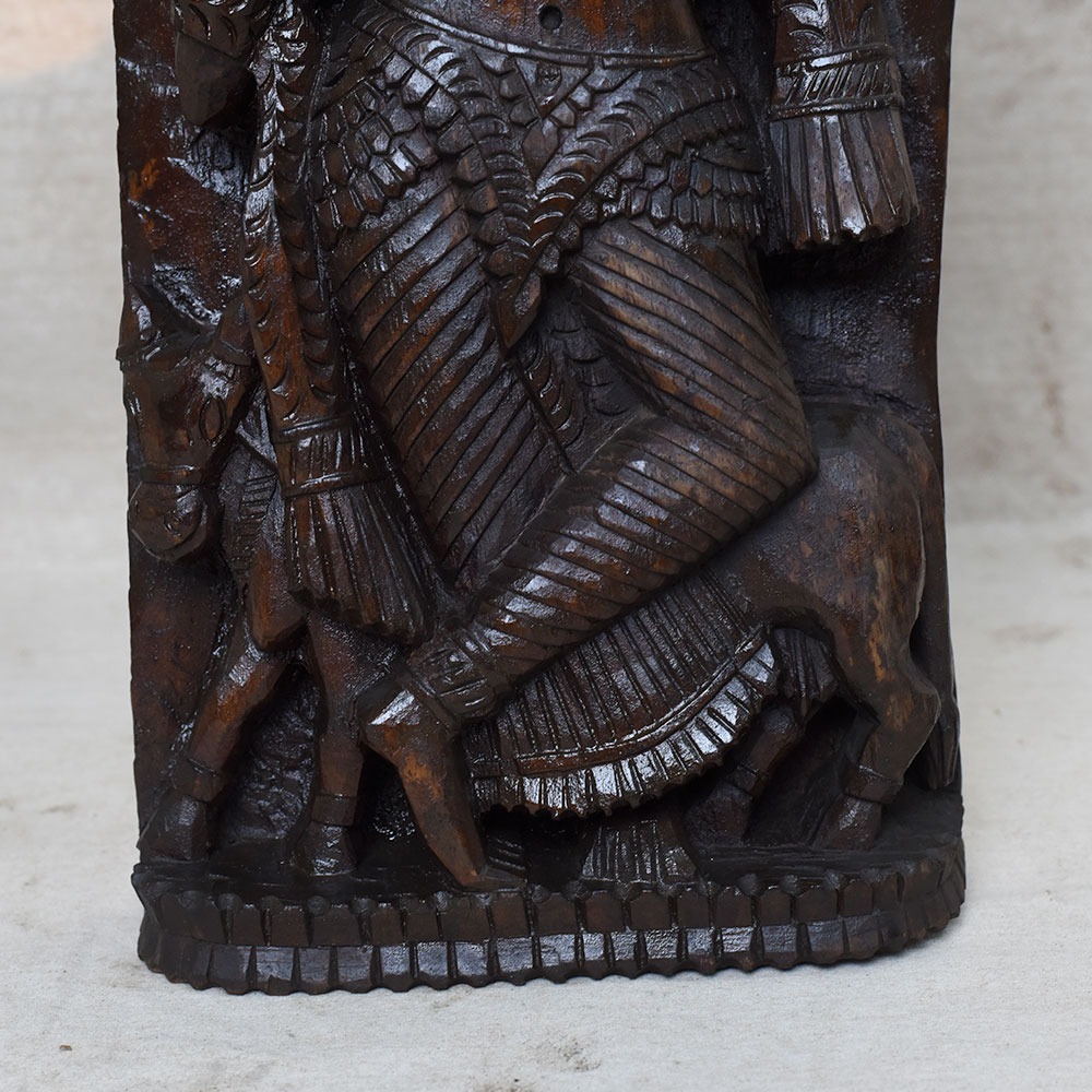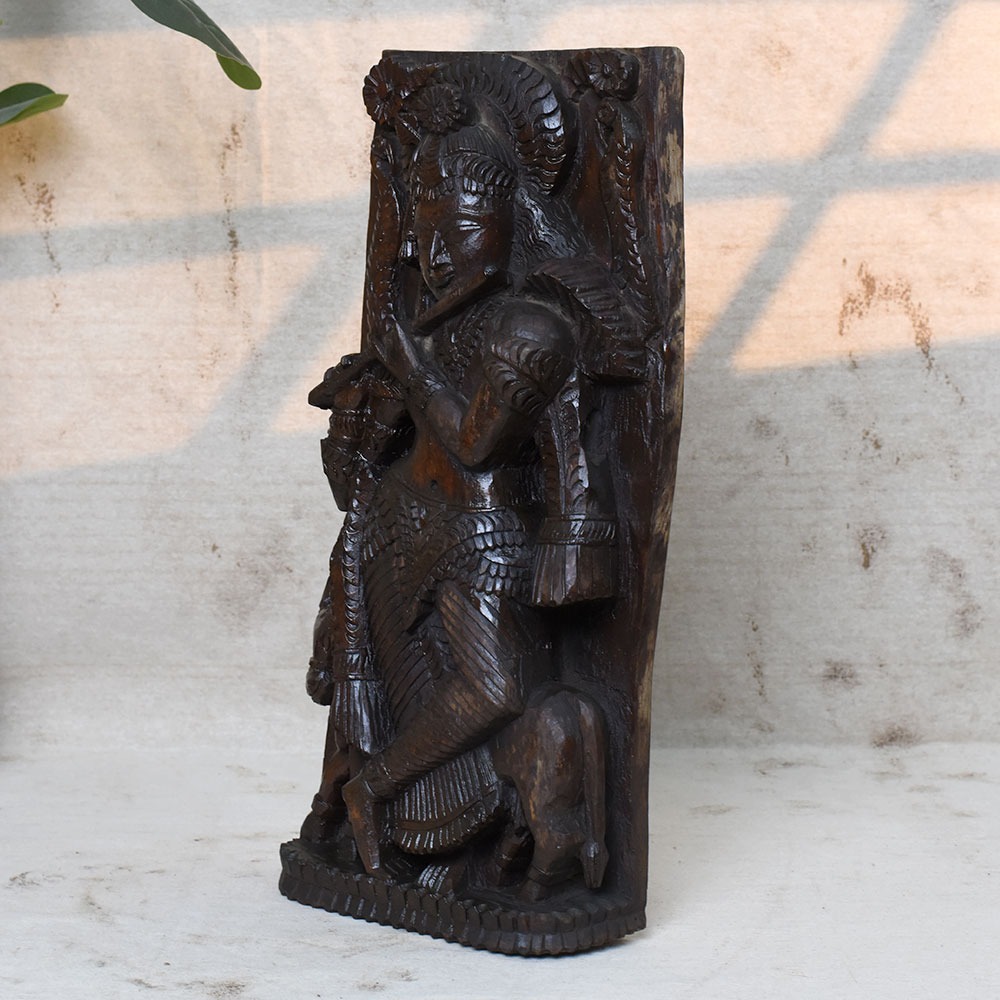 Celebrate the eternal charm of Lord Krishna with this Handcrafted 19 Inch Wooden Krishna Idol. Beautifully carved in solid wood, the idol depicts Krishna standing gracefully with his flute, adorned with intricate details and surrounded by symbolic motifs. This sculpture brings divine energy, peace, and artistry into your home or sacred space.