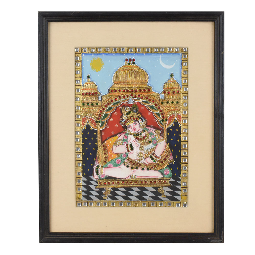 This exquisite Tanjore painting on hardboard beautifully depicts a divine figure of Lord Krishna in his child form, adorned with intricate jewelry and regal attire. Executed in the traditional South Indian Tanjore style, the painting showcases a masterful use of vibrant colors, gold foil work, and semi-precious stones, giving the artwork a rich, three-dimensional effect. The central figure is framed by a grand archway, intricately decorated with floral and geometric motifs, reflecting the grandeur of temple architecture. The background features a symbolic depiction of both the sun and the crescent moon, representing eternal time and cosmic balance. Krishna is portrayed in a relaxed yet graceful posture, exuding divine charm, with expressive eyes and a serene smile that embody joy and spiritual bliss. The meticulous detailing of the garments, ornaments, and throne highlights the artist’s dedication to precision and tradition. Set on a checkered black-and-white floor, the scene draws the viewer’s attention to the deity while maintaining visual harmony. The hardboard base ensures durability, making it a timeless collectible for art lovers. Perfect for worship spaces or as a statement décor piece, this Tanjore painting captures the essence of devotion, opulence, and cultural heritage in one magnificent frame.
