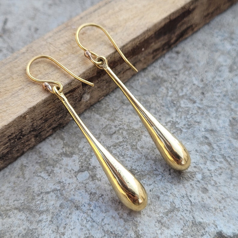These Drop Dangle Earrings celebrate the beauty of handcrafted metalwork with a graceful, elongated silhouette. Made from solid brass and finished with a luxurious 22K gold plating, each drop form is hand-shaped to create smooth curves and a radiant golden glow. At 2 inches in length, they offer a perfect balance of movement and elegance—ideal for women who love jewelry that feels both timeless and expressive. Crafted by artisans, every pair reflects thoughtful design and refined craftsmanship.