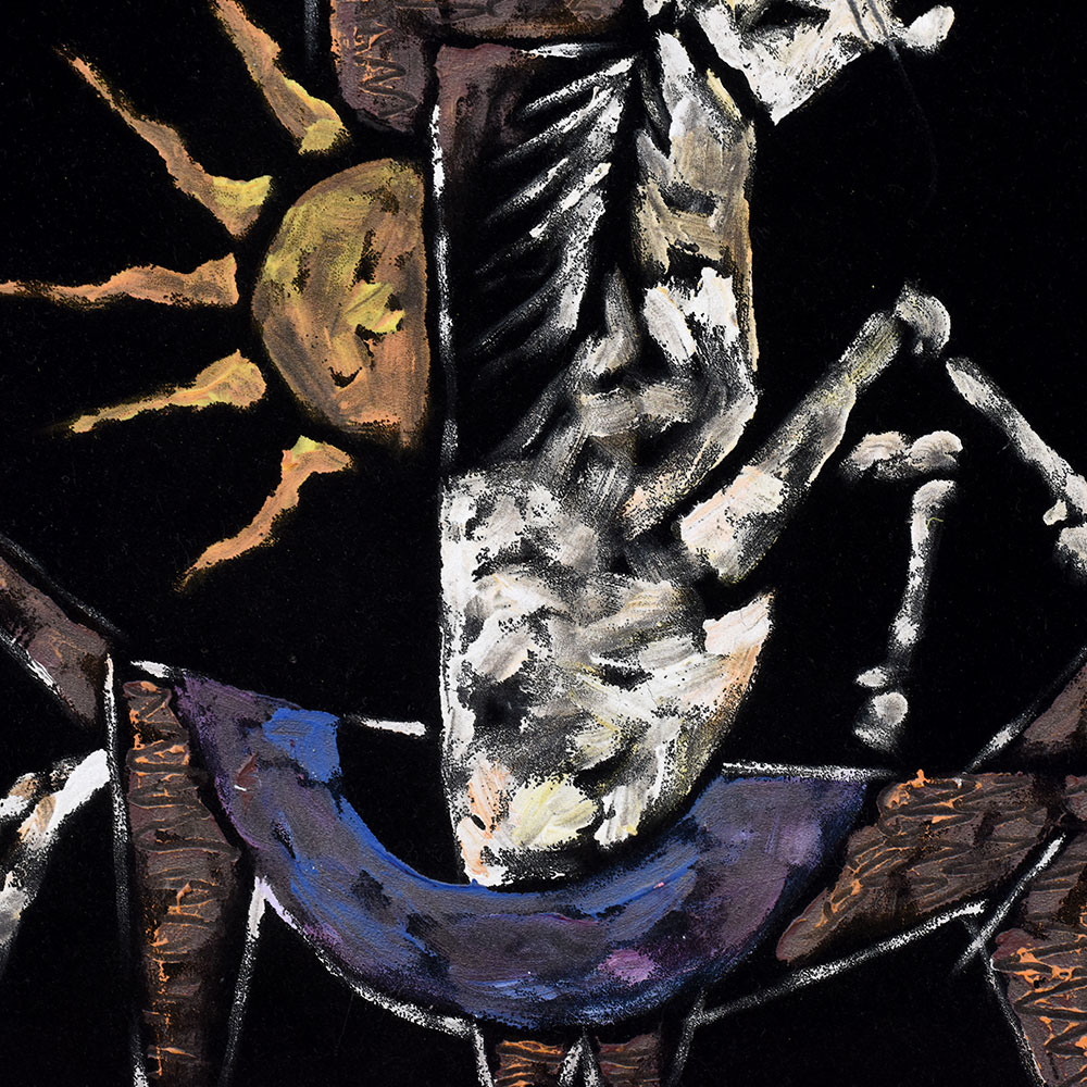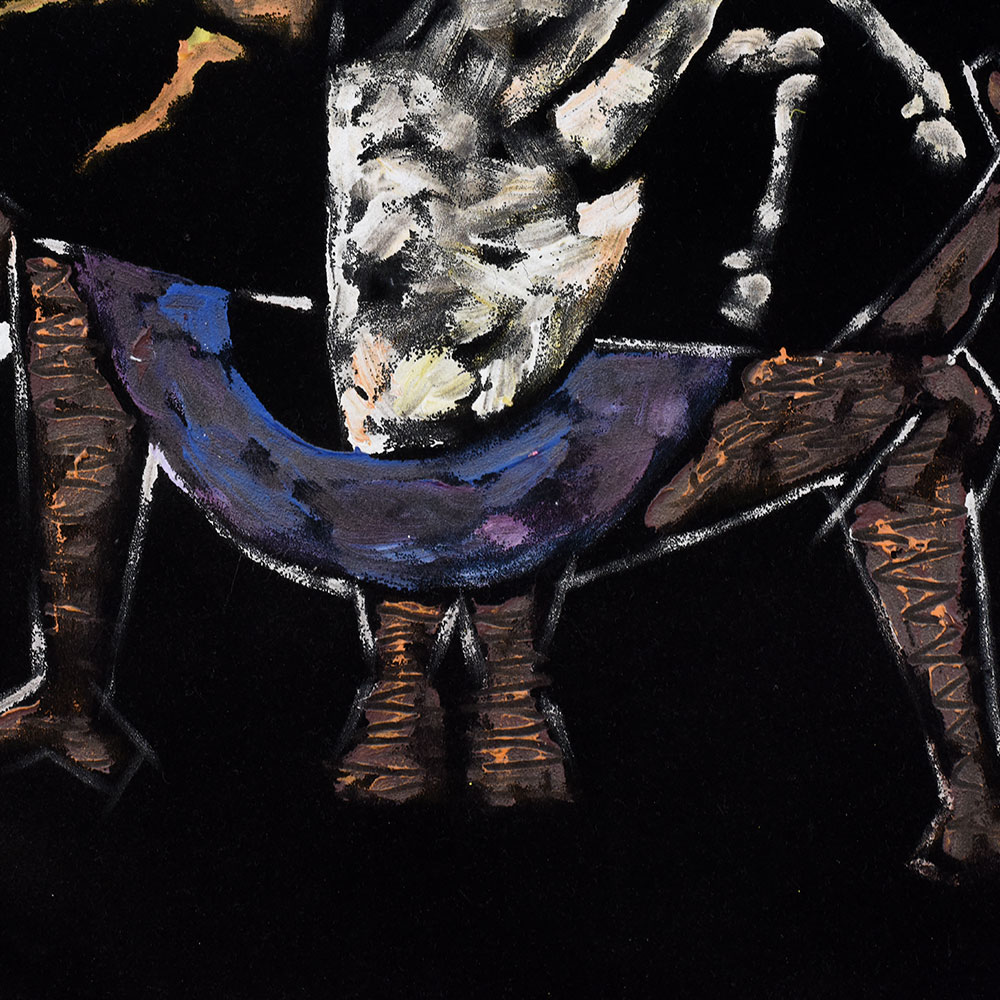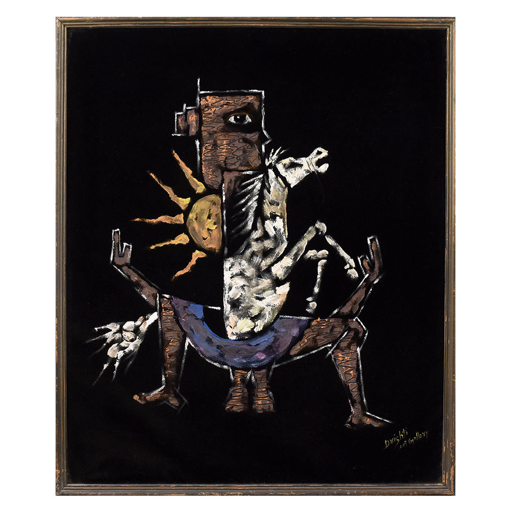 This dramatic acrylic on velvet painting delivers a powerful visual narrative through its abstract and symbolic composition. Set against a deep black velvet backdrop, the artwork presents a surreal humanoid figure split into two contrasting halves. One side features a textured, earthy brown face with a single intense eye and a glowing sun, while the other is dominated by dynamic white strokes suggesting a galloping horse—possibly symbolizing energy, freedom, or chaos. The figure’s broad stance, raised arms, and asymmetrical body evoke a sense of struggle, balance, or transformation. The rich texture of velvet enhances the contrast and adds a tactile depth to the vibrant, almost mythic imagery.