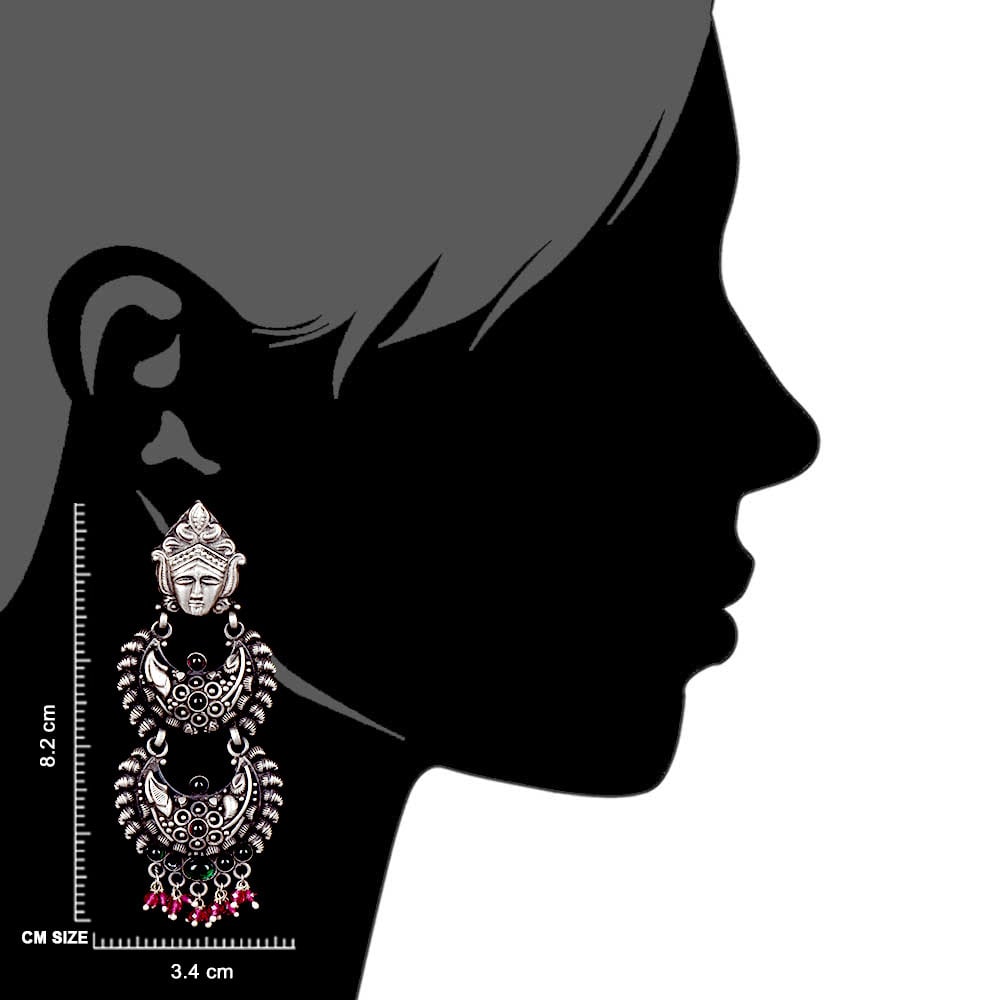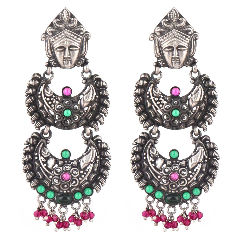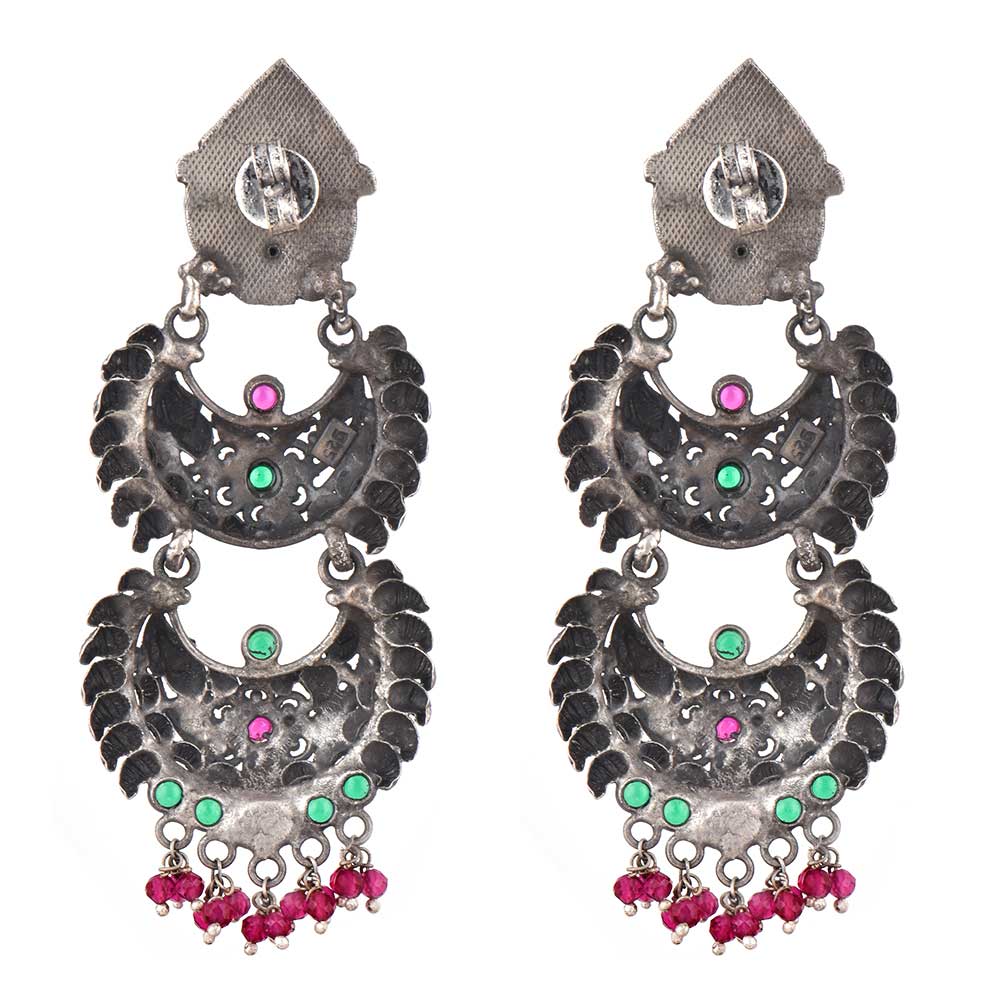 Durga Stud 92.5 Sterling silver Earrings Three Layered Danglers adorned with pink Tourmaline And Green Peridot Stones