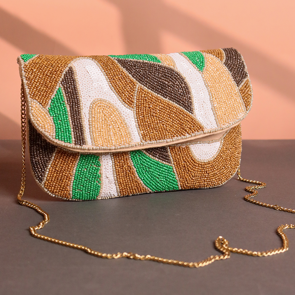 Channel natural elegance with this Earth Rhythm Abstract Beaded Clutch — a perfect blend of earthy tones and artisanal charm. Adorned with hand-beaded patterns in green, brown, ivory, and amber hues, the fluid abstract design mimics organic movement and forest-inspired forms. The gold-toned chain strap adds a refined touch, making this clutch ideal for both daywear and night-outs.Whether paired with ethnic outfits or modern silhouettes, this unique accessory adds warmth, texture, and a touch of bohemian luxe to your look.