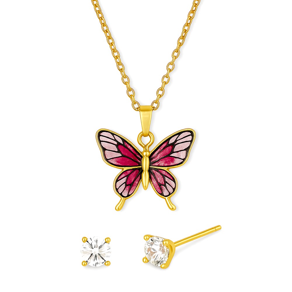 The ruby enamel butterfly pendant brings lively color, while the zirconia studs add refined brilliance for a balanced and feminine finish.