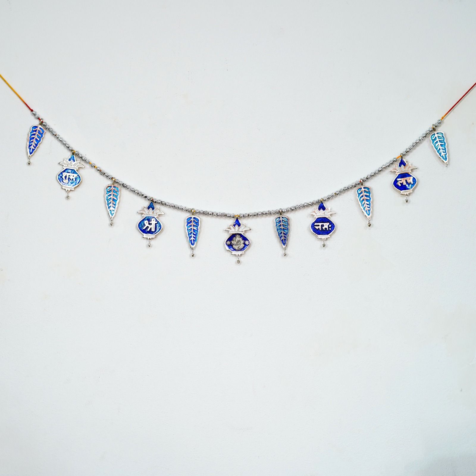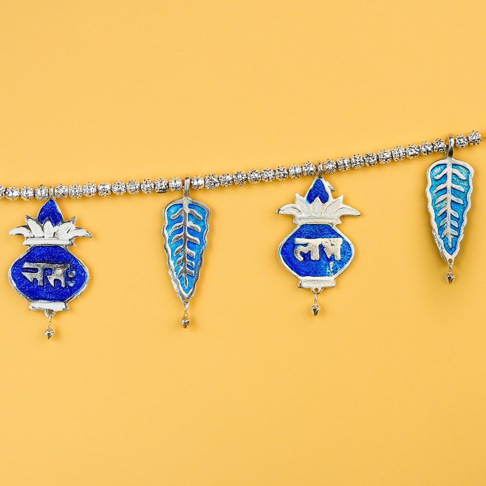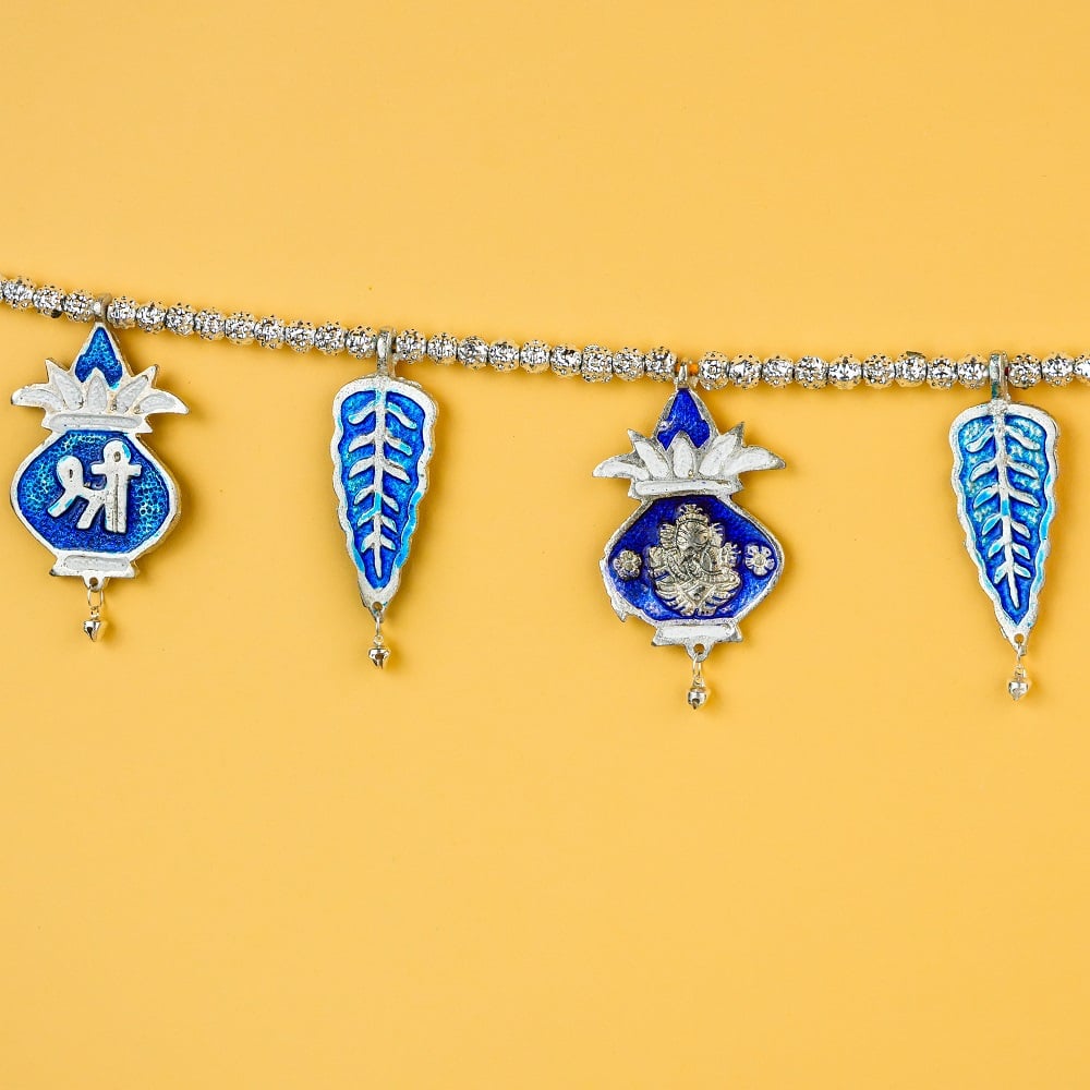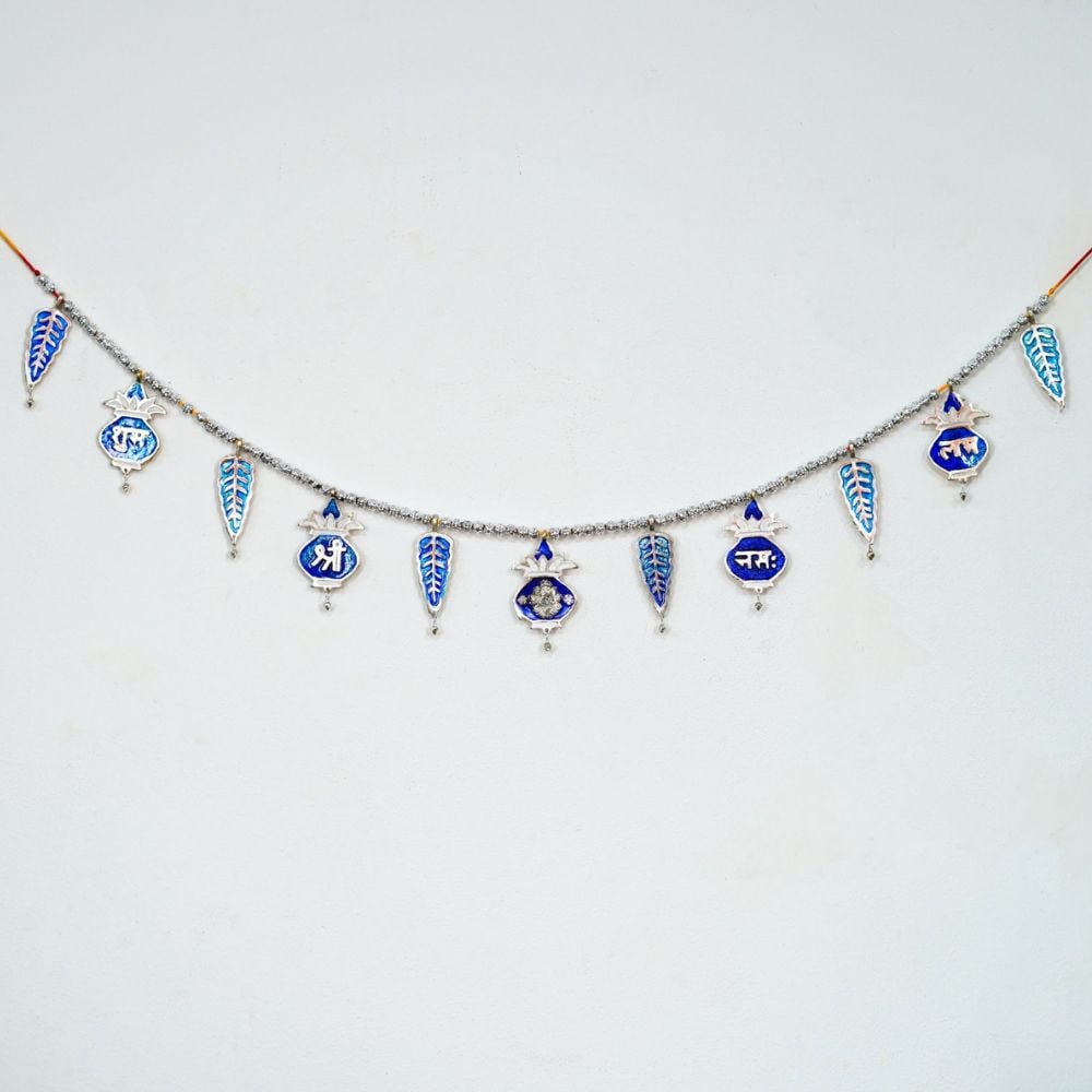 Enhance your doorway with this beautiful blue aluminum toran, crafted with intricate detailing and traditional Indian motifs. Each charm is adorned with auspicious symbols and leaf patterns, adding a festive and welcoming touch to your home décor. Made from durable lightweight aluminum, this toran combines elegance with longevity — perfect for daily use or festive occasions.