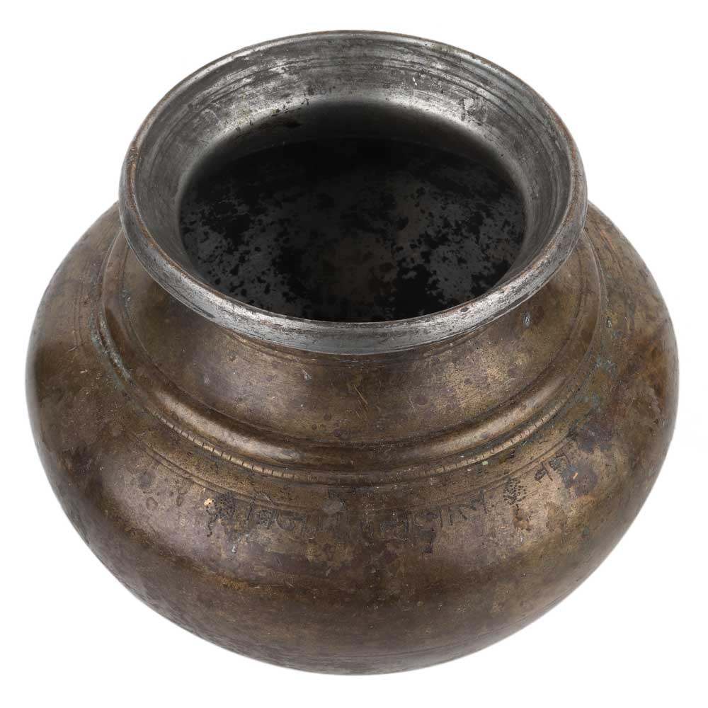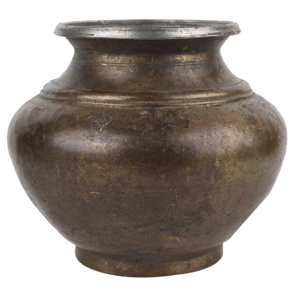 A simple looking brass water pot that is slightly broad at the centre and bottom  narrow near the neck with a wide mouth .This decorative old brass pot would make a lovely shelf ornament, flower pot or table display.