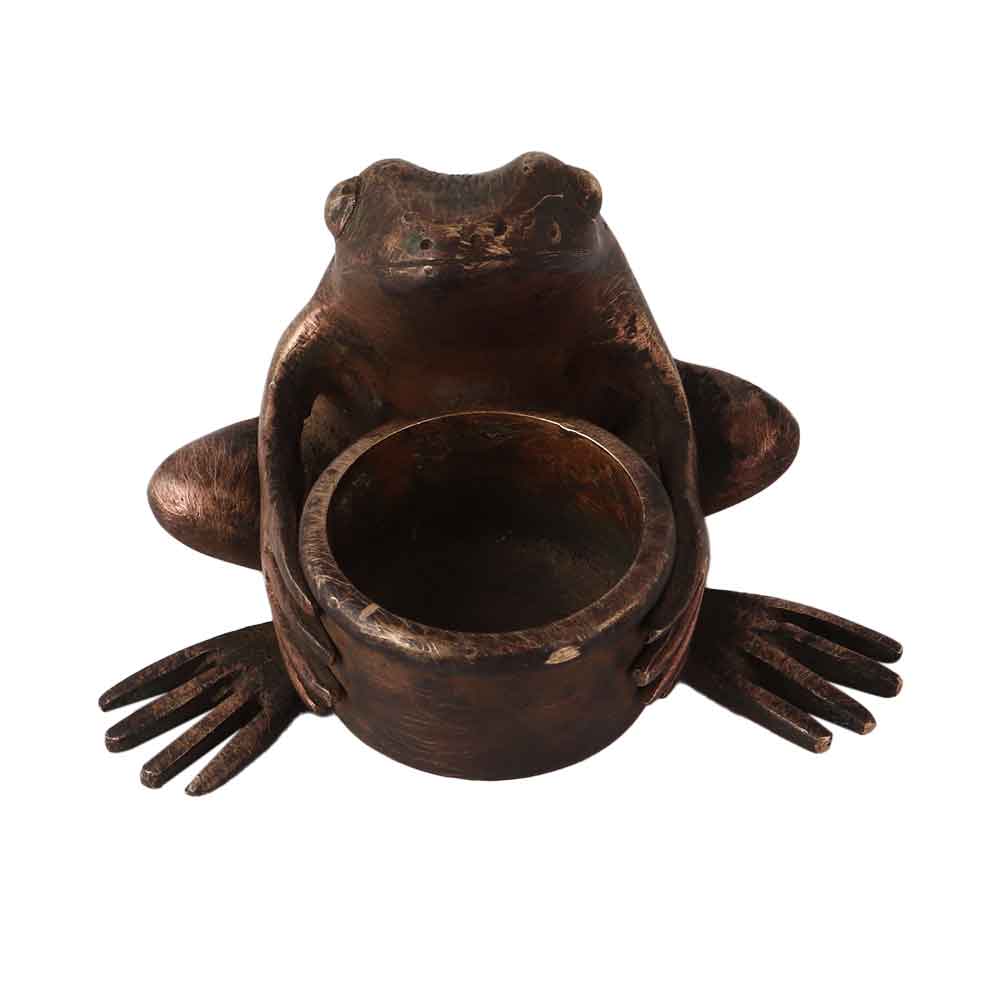Buy an amazing handmade artefact of a frog holding a pot in his hands, in English art. This elegant brown brass frog was carved from pure brass to provide a reliable artefact. Use this pot for storing small items or treasures. Place it on a table, desk or shelf and it will amaze your guests and visitors. Its alluring design will catch the eyes of your customers in a hotel, restaurant or shop. Add this incredible, distinctive item to your vintage art collection or gift this fascinating find to your best friend, family, relative or colleague on a special and festive occasion to make their day.