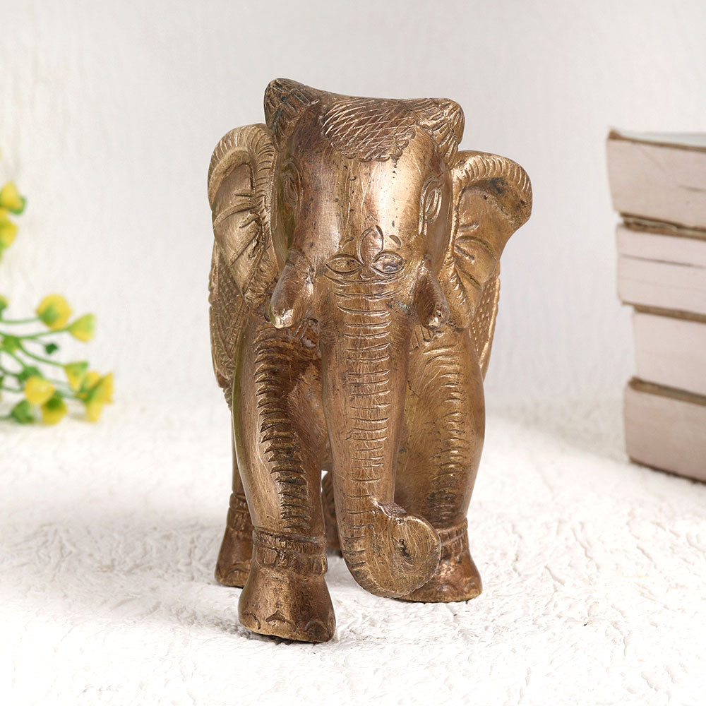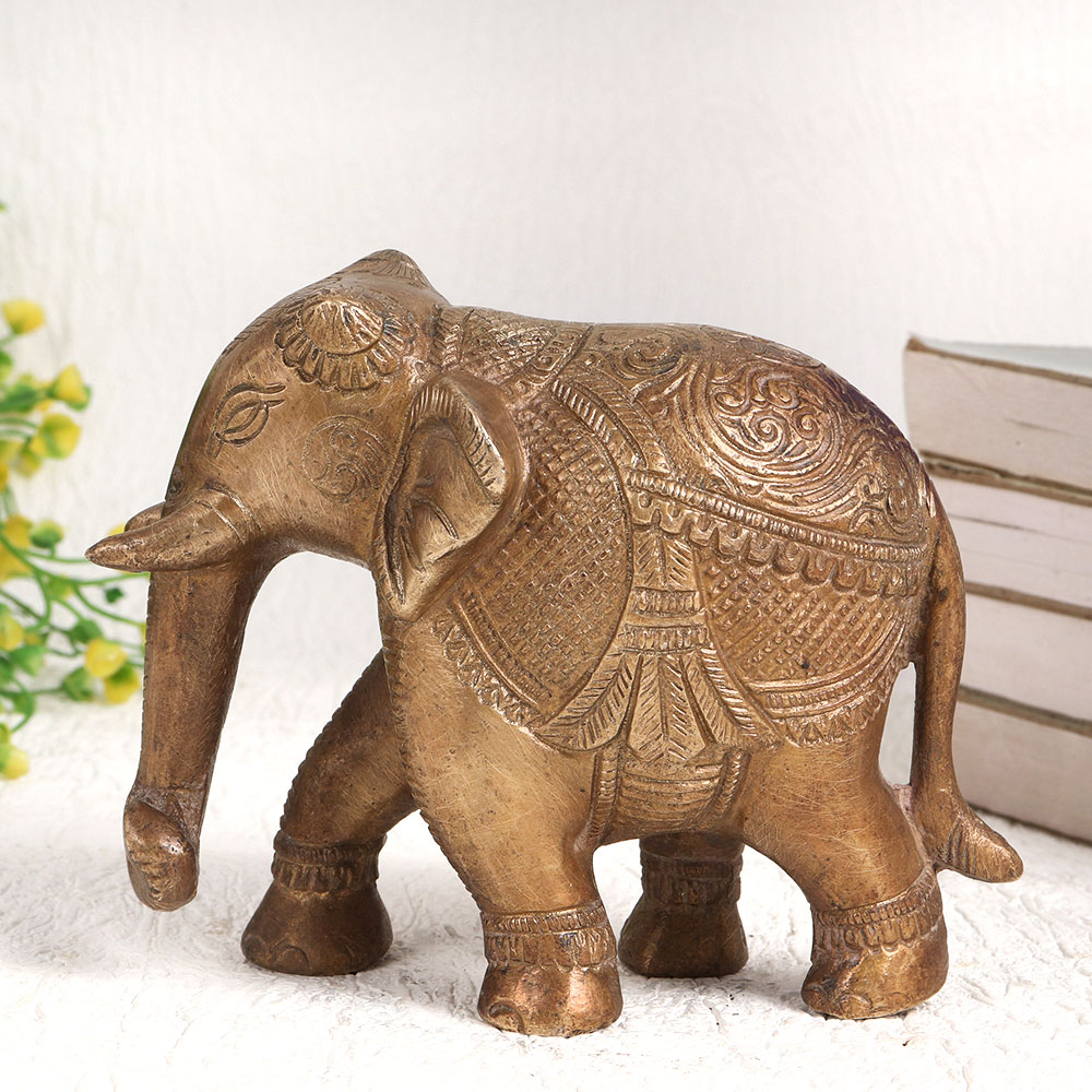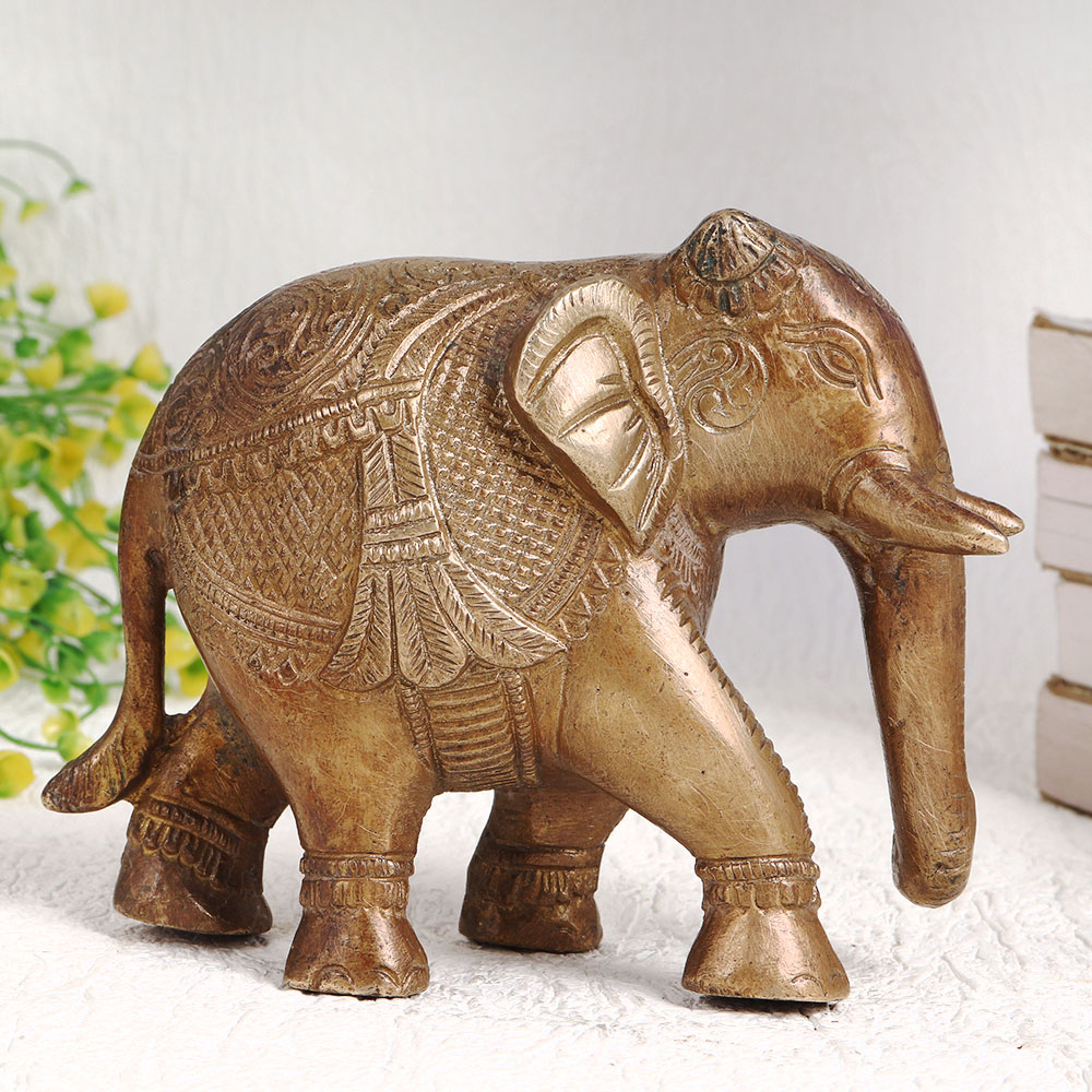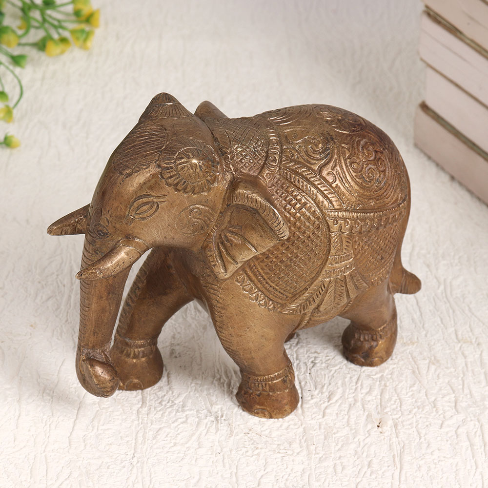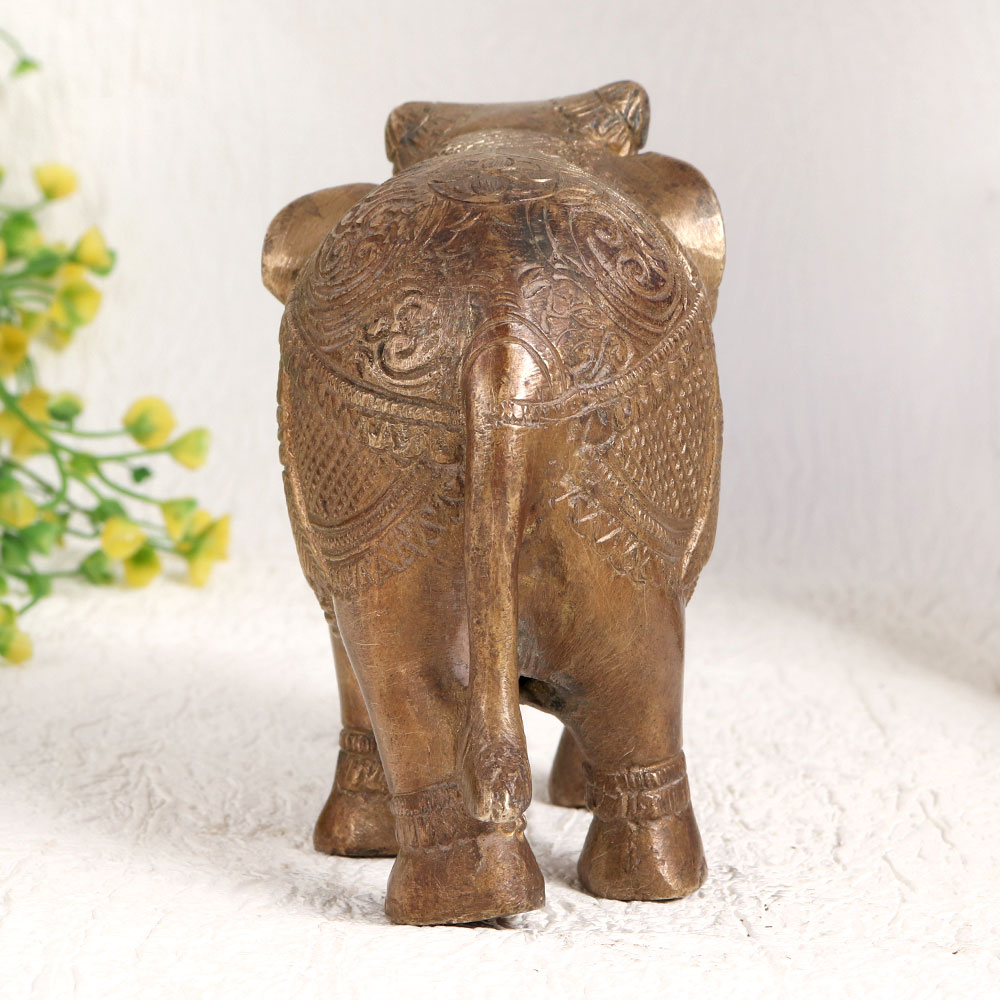Adorn your interior with the timeless charm of our exquisite brass elephant statue in an antique brown finish. Meticulously crafted by skilled Indian artisans, this masterpiece showcases their dedication to perfection and their profound understanding of traditional craftsmanship. Made from high-quality brass, this statue not only embodies elegance but also promises longevity. This versatile piece seamlessly blends with various settings, making it a remarkable addition to your home, office, restaurant, hotel, cafe, or shop. Its captivating design can effortlessly transform any space into a captivating oasis of culture and sophistication. Whether you're an avid collector of vintage treasures or curating an exhibition, this brass elephant statue is a must-have. Its intricate details and rich, antique brown patina make it a captivating centerpiece. Additionally, this statue serves as an ideal gift for your loved ones on special, festive, or auspicious occasions, symbolizing strength, wisdom, and good fortune.