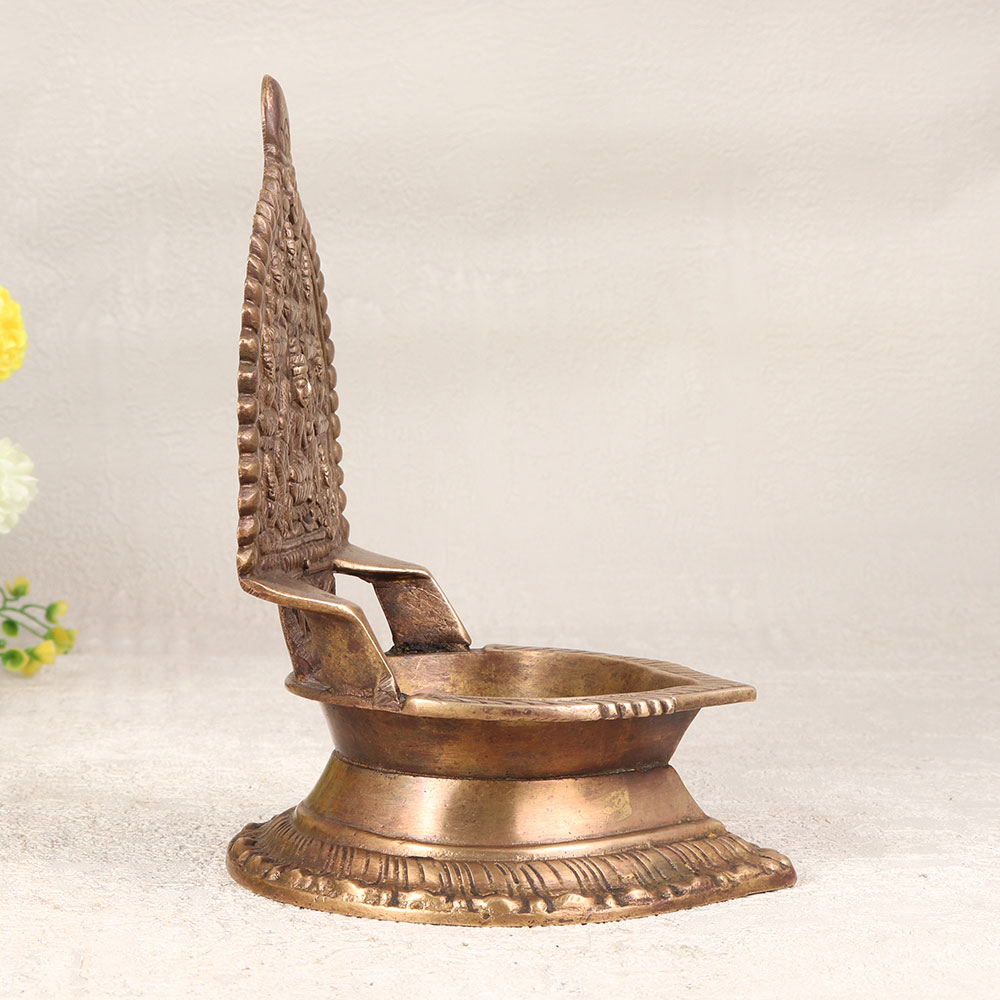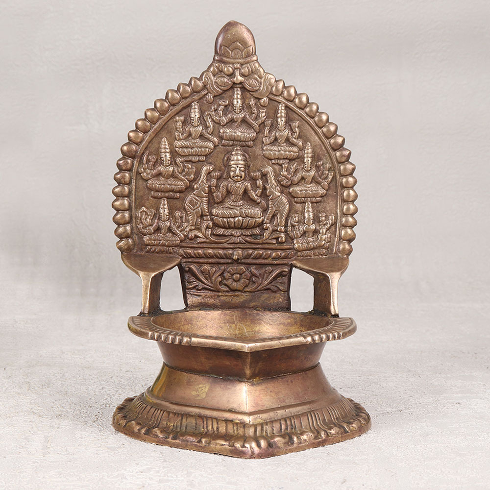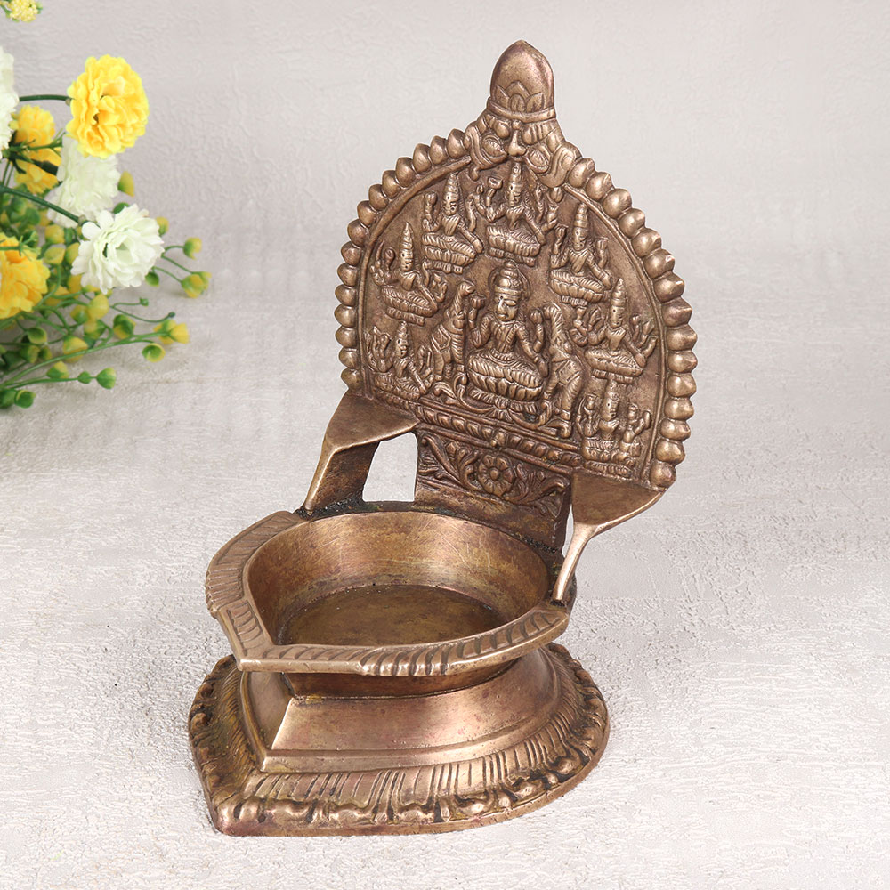 A Vintage Brass Gajlaxmi Oil Lamp that is a radiant embodiment of divinity and artistry. Meticulously handcrafted by highly talented artisans in the enchanting tradition of South Indian Art, this exquisite diya showcases a breath-taking carving of Goddess Gajlaxmi, emanating grace and prosperity. Cast from high-quality brass, the lamp boasts an antique brown finish, lending it an air of antiquity and charm. Embrace tradition by lighting it with the pure glow of mustard oil or ghee, using a cotton wick for a warm and soothing ambiance. This versatile piece finds its place seamlessly in homes, offices, restaurants, hotels, or cafes, becoming a spiritual centerpiece in prayer rooms or an aesthetic addition to any space. Elevate your decor or gift it to your loved ones on special, festive, or auspicious occasions, symbolizing the blessings of wealth and well-being. As a testament to its timeless beauty, this lamp is not just an artefact but a precious addition to any vintage collection, carrying the spirit of cultural heritage and artistic mastery.