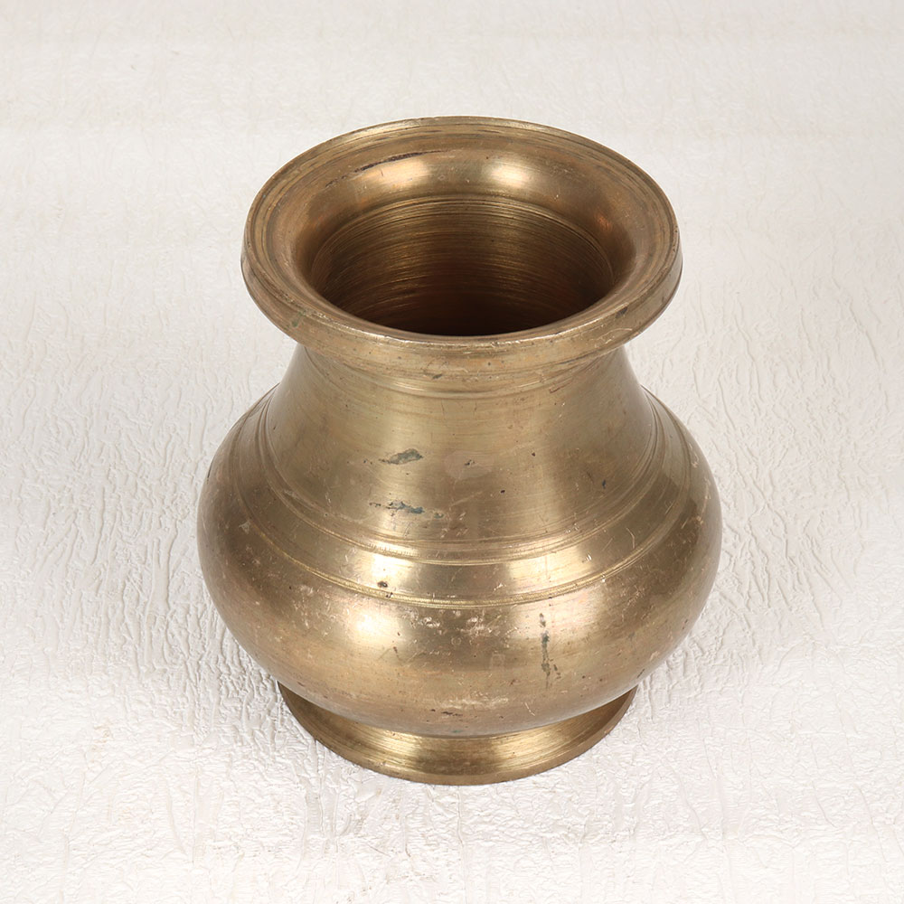 A Vintage Brass Holy Water Pot which is a masterpiece handcrafted by highly skilled Indian artisans in the revered South Indian Art tradition. This exquisite pot, designed for prayer, rituals, and havans, boasts a rich antique brown finish that exudes a sense of heritage and spiritual grace. Forged from high-quality brass, this pot not only serves its spiritual purpose but also doubles as an indoor flower pot, adding a touch of elegance to any setting. The intricate craftsmanship, a testament to the artisan's skill, enhances its antique allure, making it a captivating addition to any home, office, restaurant, hotel, or cafe prayer room. This versatile piece transcends its religious function and can be incorporated into your vintage collection, becoming a conversation starter with its unique blend of history and artistry. Gift this timeless creation to your loved ones on special, festive, or auspicious occasions, sharing the warmth of tradition and the enduring beauty of handmade craftsmanship.