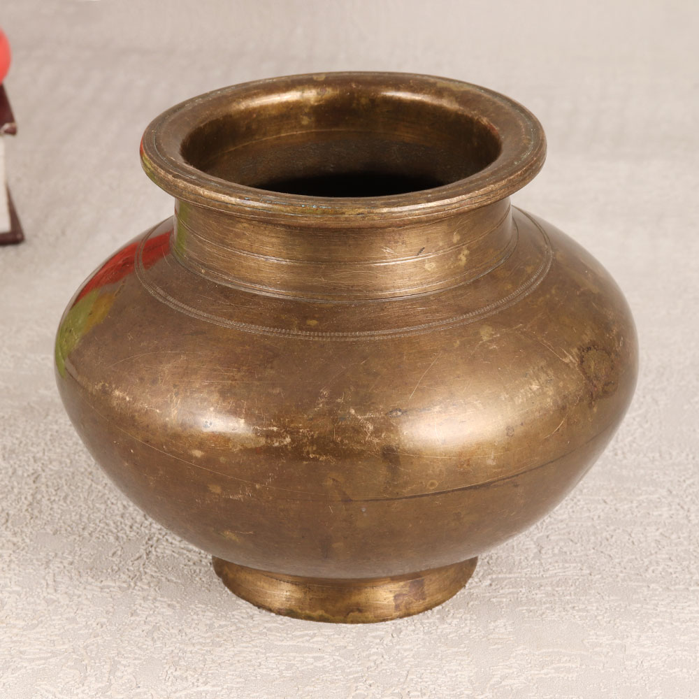 A Vintage Brass Holy Water Pot that is a testament to the skilled artisans of Gujarat, India and a timeless symbol of spirituality and craftsmanship. Handmade with precision and passion, this exquisite piece exudes the charm of antiquity with its rich antique brown finish. Crafted from high-quality Brass, the pot serves a dual purpose - it holds sacred water during prayers, havan, and auspicious occasions, while also doubling as a stunning vessel for flower decorations. Versatile and elegant, this artefact seamlessly blends tradition with aesthetics, making it a perfect addition to your home, office, restaurant, hotel, or cafe. Its vintage allure ensures it stands out as a distinctive decoration piece, complementing any space with its unique character. Ideal for collectors, it can be a cherished addition to vintage collections. Moreover, it makes for a thoughtful and meaningful gift for your loved ones on special, festive, or auspicious occasions.