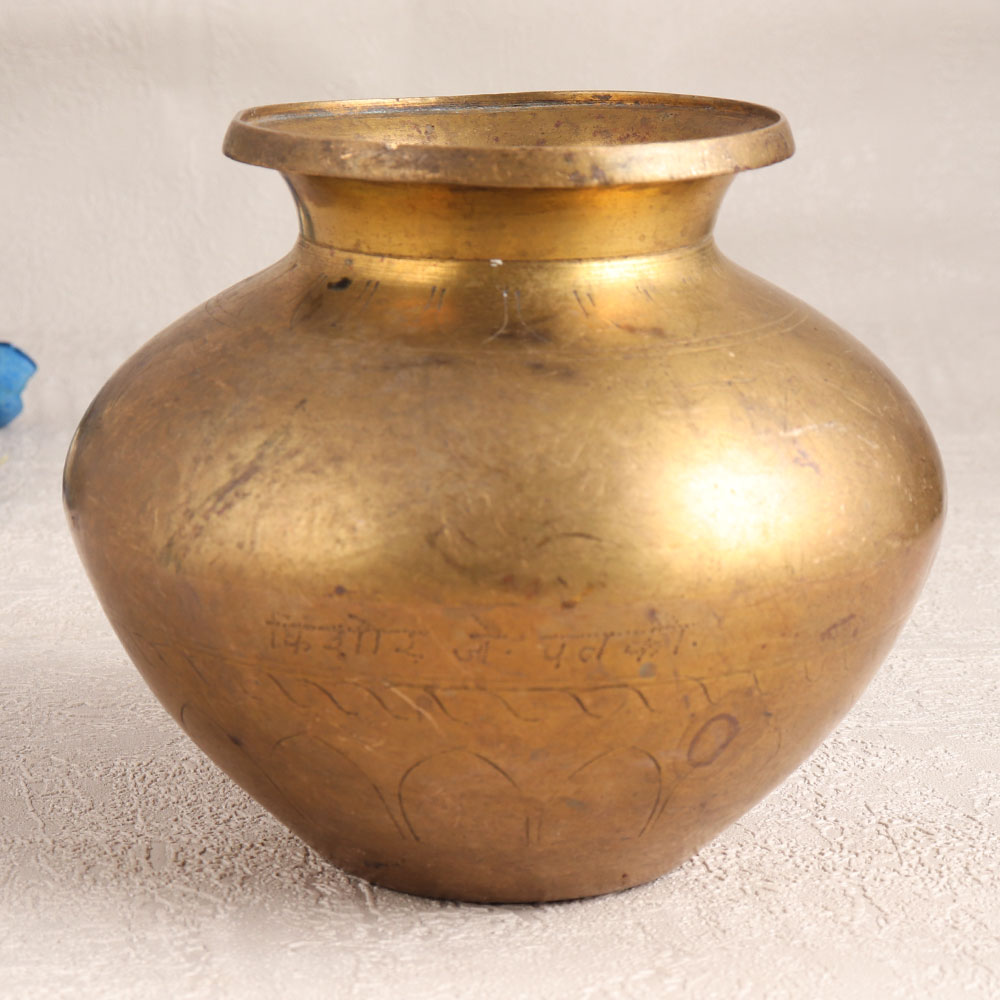 Immerse yourself in the rich cultural heritage of India with this exquisite vintage brass holy water pot. Handcrafted by highly skilled artisans from the heartland of Gujarat, this stunning piece features a distinctive antique brown finish that adds a touch of rustic charm to any space. This holy water pot is meticulously fashioned using high-quality brass, ensuring both its durability and aesthetic appeal. Its versatility is unmatched, making it an ideal addition to your home, office, hotel, cafe, shop, or restaurant's prayer room. Use it during your prayers, and its beauty is equally appreciated as a small flower pot, bringing a sense of tranquillity to your environment. Whether you're a collector of vintage artefacts or looking for a unique decor piece, this holy water pot is a splendid choice. Display it at exhibitions to showcase its historical and artistic significance. The holy water pot also makes for a meaningful and cherished gift for your loved ones on special, festive, or auspicious occasions, adding a touch of spirituality and elegance to their lives.