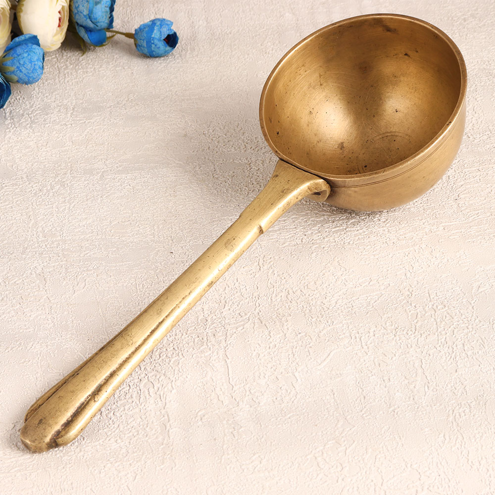 Buy a vintage brass holy spoon online from our website and get it delivered right at your doorstep. This exquisite piece is meticulously handcrafted by professional Indian artisans that exudes a rich history and cultural significance. Crafted from high-quality brass and adorned with an antique golden finish, this holy spoon adds a touch of opulence to any setting. Whether you want to enhance your home, office, hotel, cafe, shop, or restaurant, this versatile ornament fits seamlessly into any ambiance. Its multifunctional design allows you to use it during religious ceremonies like havan, where it can hold sacred offerings with grace and reverence. This brass holy spoon is a treasure for collectors of vintage items. Its unique design and antique finish make it a standout piece for exhibitions and showcases, allowing you to proudly display its intricate craftsmanship. Moreover, this divine creation makes for a thoughtful and meaningful gift for your loved ones on special, festive, or auspicious occasions.