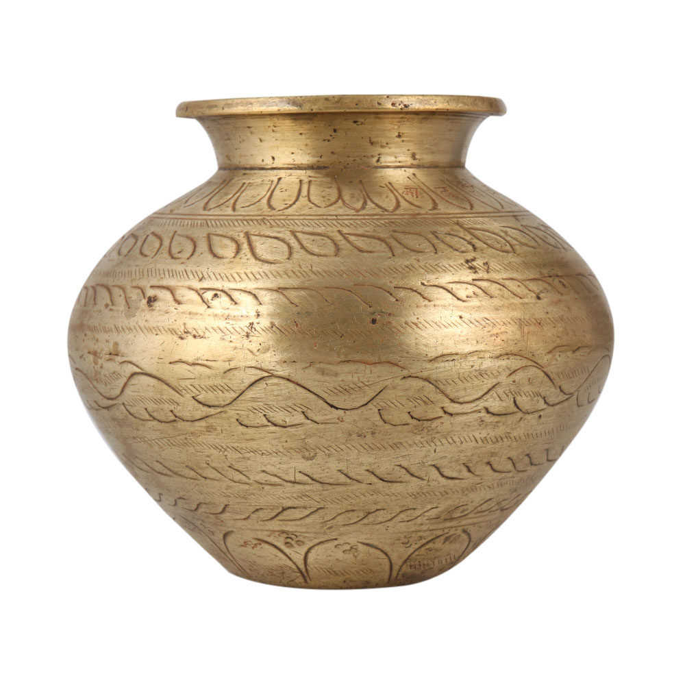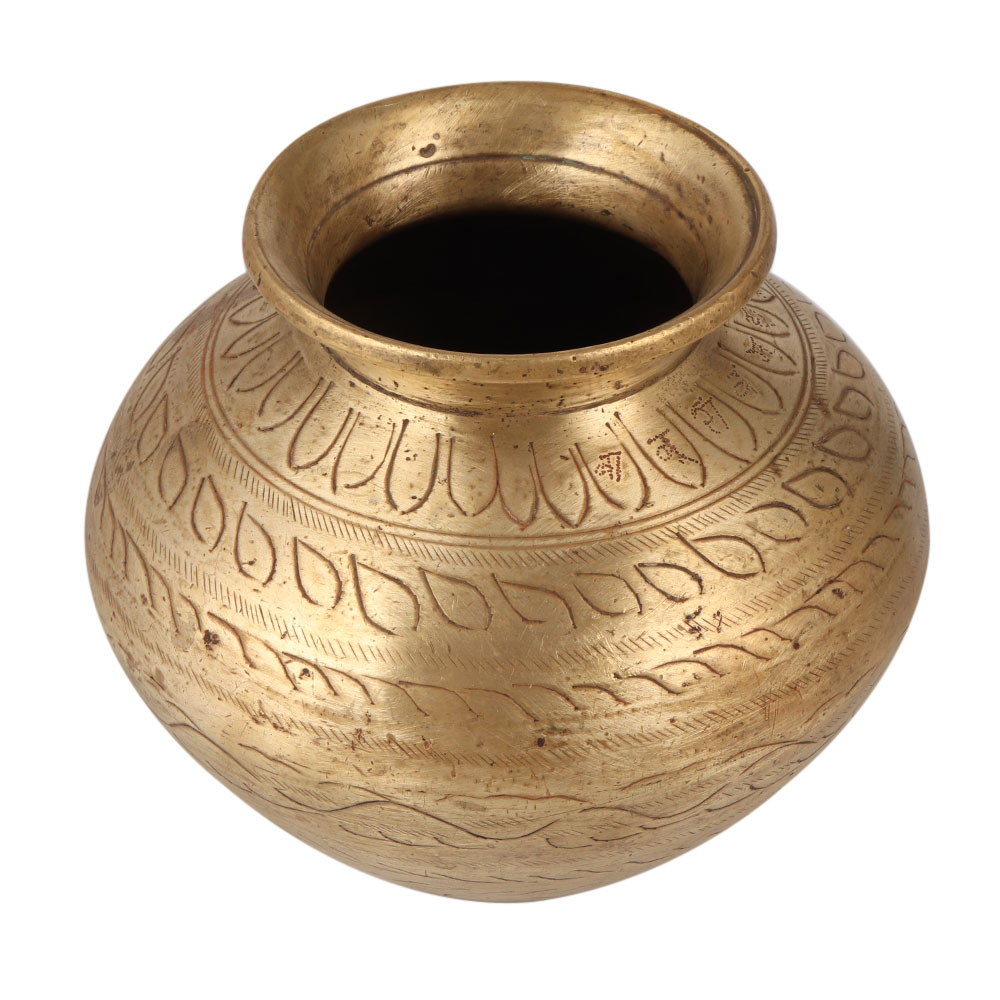 This brass water pot is meticulously crafted by professional Indian artisans in a traditional manner that showcases the rich heritage of Indian craftsmanship. This stunning piece is adorned with an elegant golden finish and intricately engraved patterns, making it a captivating addition to any space. For centuries, this brass pot has been an integral part of Indian households and temples, used for offering water to deities, including the sun god and shivling. It holds great significance during Hindu rituals, auspicious functions, and havans. Moreover, it serves as a vessel for storing sacred water from the holy river Ganga, symbolizing purity and divine blessings. Not only is this brass water pot steeped in cultural and religious symbolism, but it also doubles as a beautiful decorative item. Place it in your living room as an indoor flower pot, adding a touch of elegance and charm to your decor. Alternatively, place it in your patio garden to create a serene and inviting ambiance. This versatile brass pot also makes for a thoughtful and meaningful gift. Present it to your family, friends, or relatives on special occasions, festivals, or auspicious celebrations, and share the joy and blessings associated with this cherished artefact.