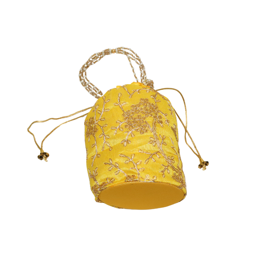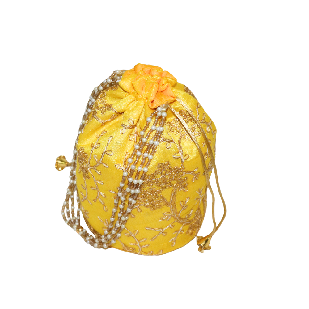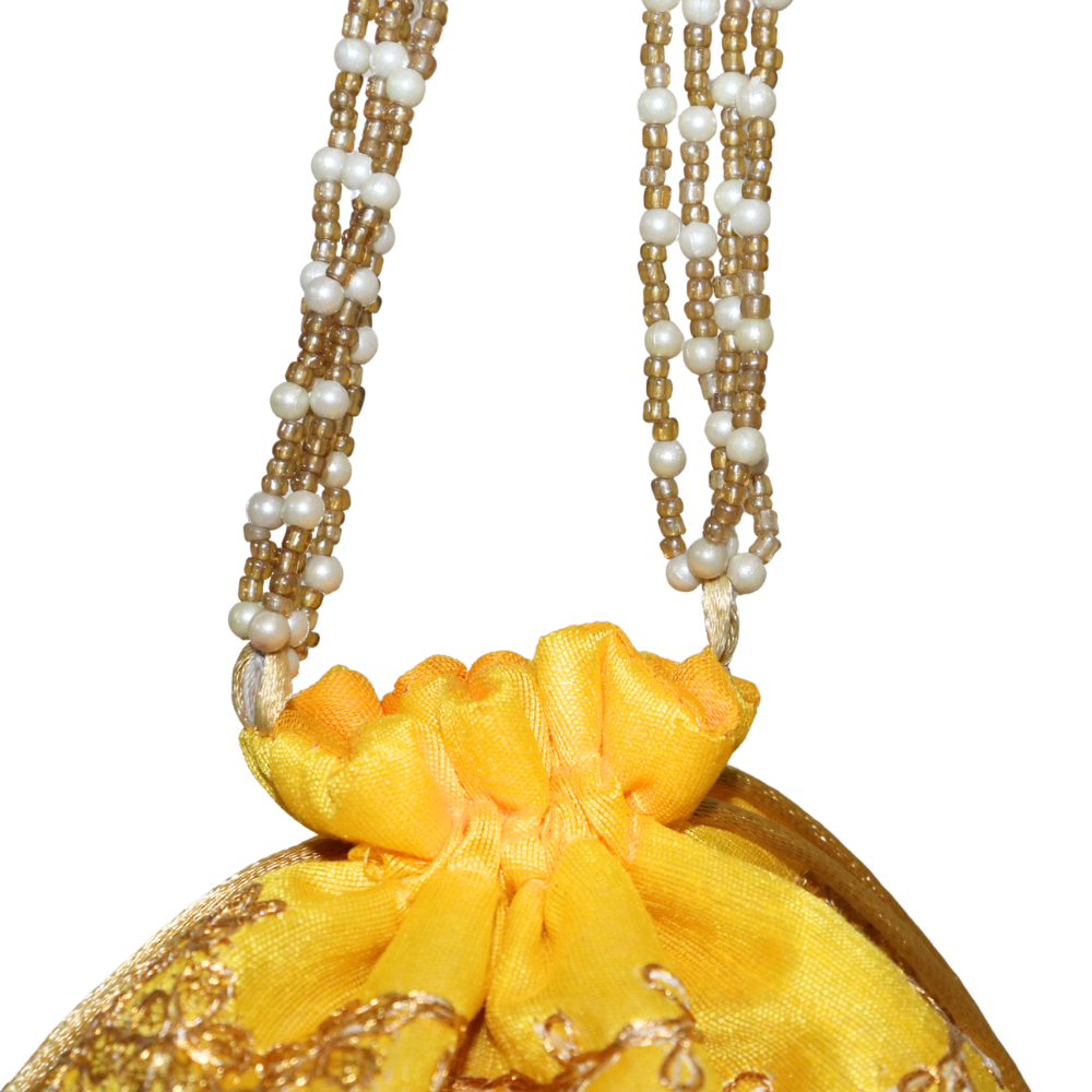 Add a touch of elegance to your accessory collection with this handmade yellow cotton Potli bag, designed to make a statement at any occasion. Featuring intricate beadwork with pearls and golden accents, this traditional yet contemporary bag is perfect for weddings, festivals, or any special event. The bag is crafted with high-quality cotton fabric and adorned with fine embroidery, showcasing delicate floral patterns. The beautifully designed golden drawstring ensures easy closure and secure carrying. Ideal for holding small essentials, this Potli bag complements both ethnic and fusion outfits. Its lightweight construction makes it both practical and stylish, offering a versatile option for your accessory needs. A perfect gift for your loved ones or a luxurious treat for yourself, this Potli bag brings together heritage and modern style in one stunning piece.