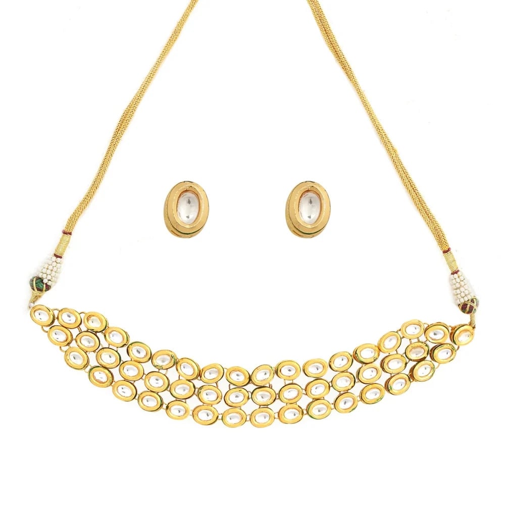 The Elegant Oval Kundan Choker Necklace Set brings together classic Indian craftsmanship and graceful modern styling. Crafted in polished golden brass, the choker features a series of oval Kundan style stone settings arranged in a balanced and refined pattern. The radiant gold tone finish enhances the brilliance of the stones, creating a sophisticated ceremonial look. With its elegant 20 inch length, this handcrafted set beautifully frames the neckline for festive and wedding occasions.