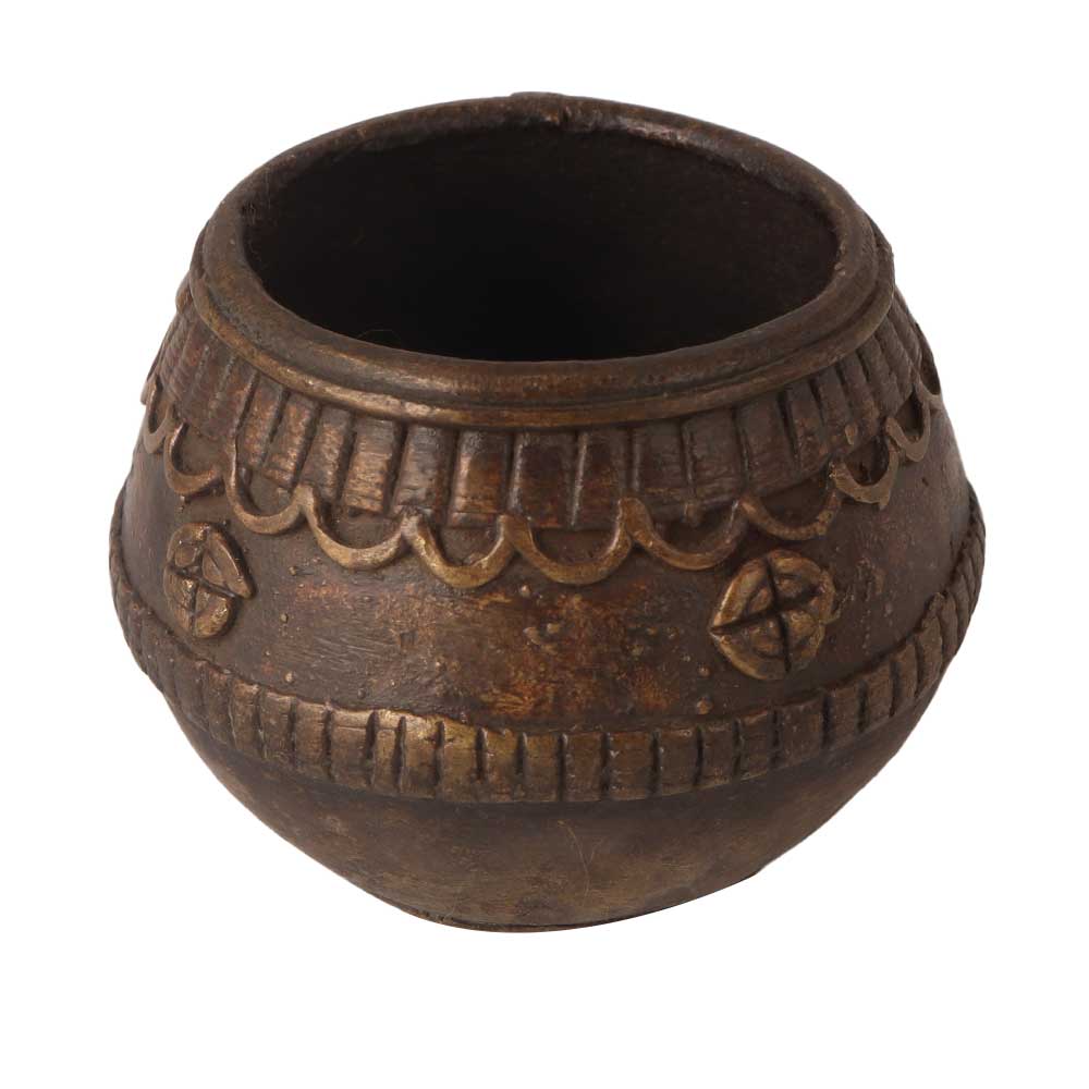 An embellished bowl used to measure rice, grains, and cereals in Odisha, an eastern state of India. For centuries, these rice measurement bowls have been a great decorative item for homes, offices and restaurants. Buy this brass bowl to add an alluring flair to your interior by placing this antique finish bowl on a shelf, table, desk or altar. This vintage style brass bowl is made of antique brass with the highest quality available in the market to give a long lasting impression to the buyer. This brass bowl is handcrafted by skilled Indian artisans using traditional methods. An auspicious, special and festive gift for your loved ones.