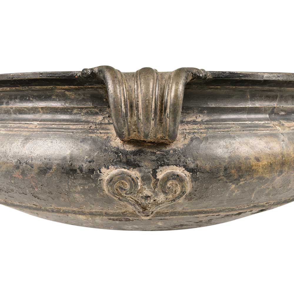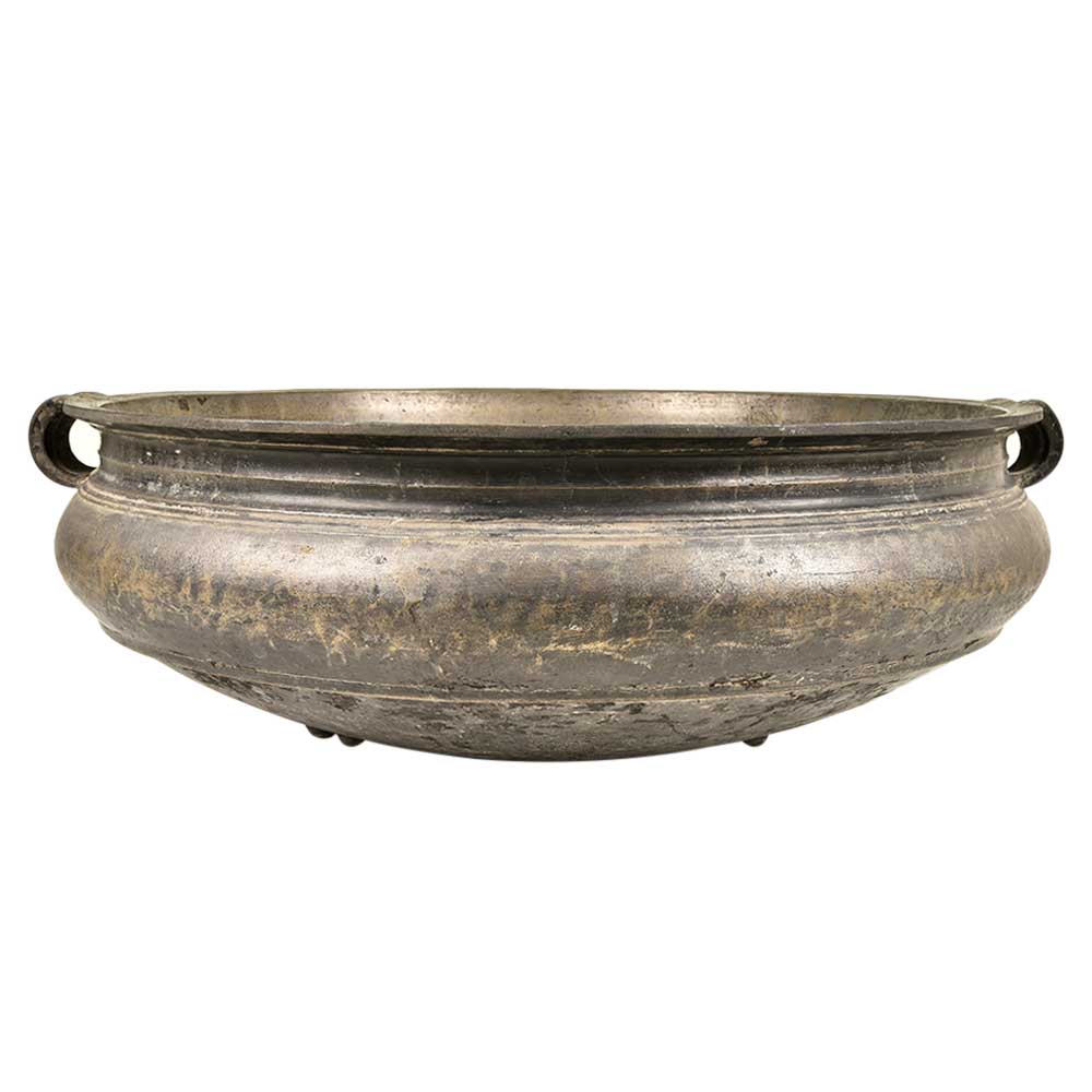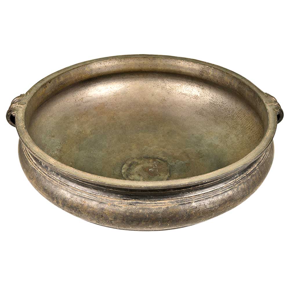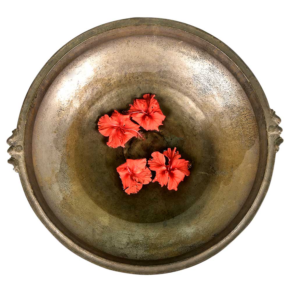 Bronze Urli Indian Style with Handle Having Beautiful Ornamentation. Ideal to Put Flowers and Floating Candles and Use It as a Perfect Indoor/Outdoor Decoration. It is Completely Done by Hand. It Serves as a Beautiful Bronze Bird Bath Too.