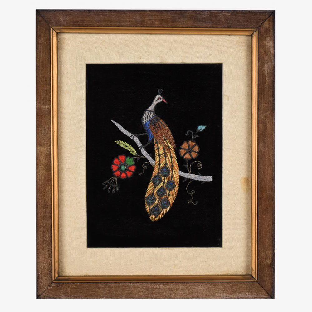 Bring elegance and craftsmanship into your space with this hand embroidery work on cloth featuring a peacock, framed beautifully in a rustic wooden border. The artwork showcases a peacock perched gracefully on a branch, its feathers intricately embroidered with fine threadwork in vibrant hues of gold, blue, and green. Surrounded by floral motifs, the design reflects the beauty of nature combined with traditional textile artistry. The black fabric background enhances the rich colors and detailed stitches, making the composition stand out as a striking centerpiece. Perfect for adding a touch of sophistication to living rooms, hallways, or art collections, this embroidered piece captures both cultural heritage and timeless beauty. Mounted securely in a wooden frame, it offers durability and style, making it an ideal collectible or a thoughtful gift for art enthusiasts and admirers of handcrafted decor.